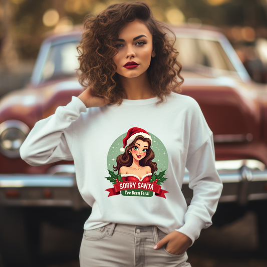 Sarcastic "Sorry Santa I've Been Feral" Coquette Pinup Girl Christmas Sweater