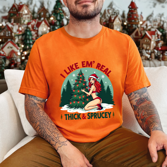 Sarcastic "I Like Em' Real Thick & Sprucey" Christmas Tee