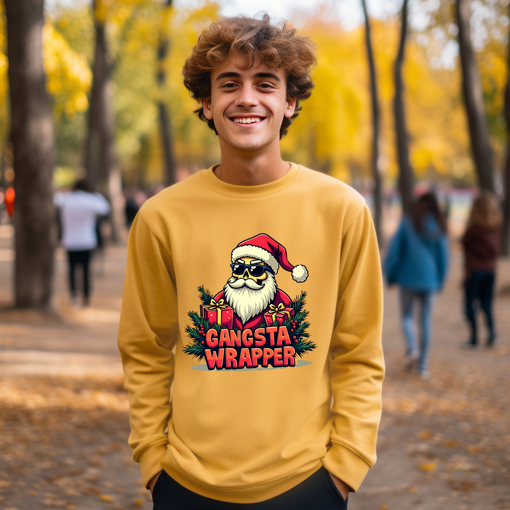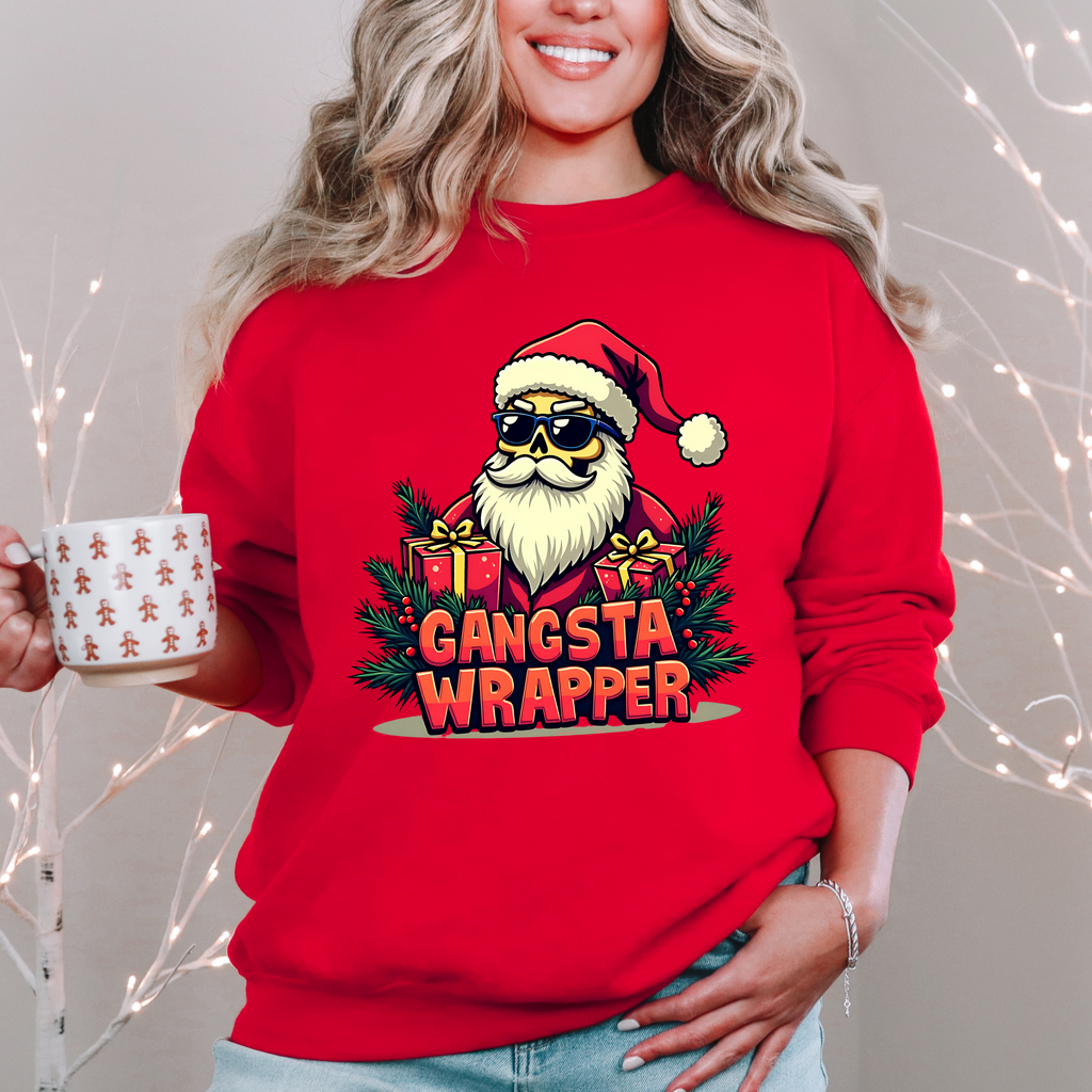 Unwrap the holiday swagger with our Gangsta Wrapper Christmas Sweatshirt, where festive meets fierce! This sweater stars a wickedly cool skeleton style Santa, chillin’ among a pile of presents with a sly grin that says, “I wrapped these gifts with attitude and a side of shade.” The bold Gangsta Wrapper tagline pops in icy, bright print, making this sweatshirt a total vibe for those who sleigh the season their way. Crafted from an ultra-comfy cotton-poly blend that’s smoother than a sleigh on fresh snow, this unisex crewneck (sizes S-3XL) is your go-to for holiday parties, wrapping marathons, or flexing your festive edge while dodging Aunt Marge’s mistletoe ambush. It’s the perfect gift for your crew’s resident rebel or a treat to keep your holiday spirit lit. Snag this bad boy now and show the North Pole how to wrap it like a boss!