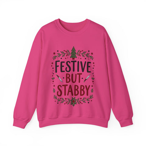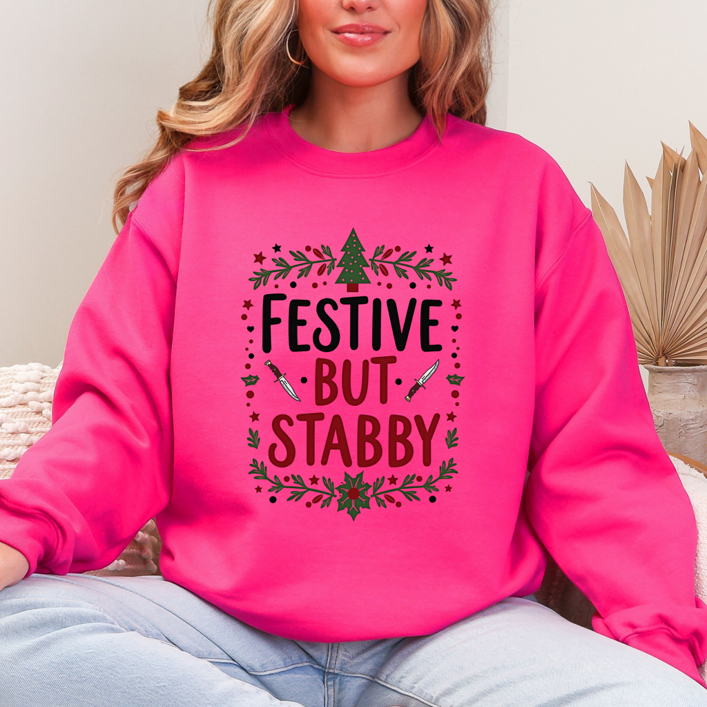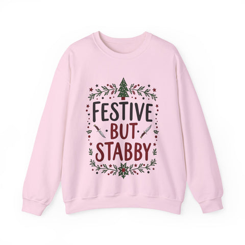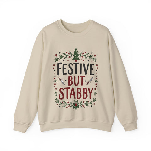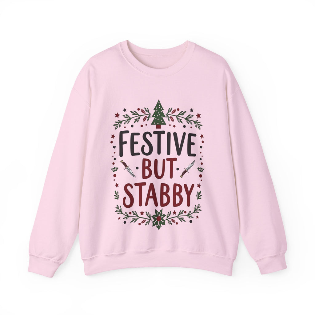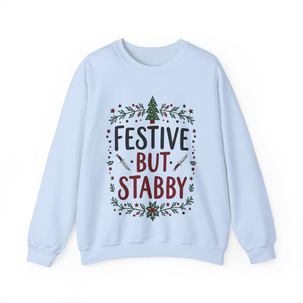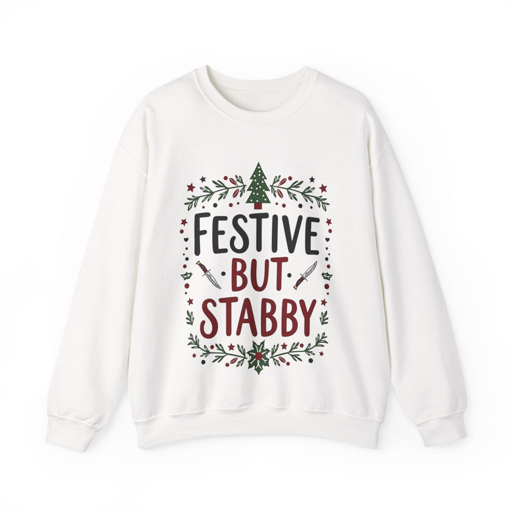 Spread holiday cheer with a side of shade in our "Festive But Stabby" sarcastic Christmas Sweatshirt! This giggle inducing crewneck is for those who love the twinkle of Christmas lights but are ready to fend off fruitcake - wielding relatives with a candy cane shiv. Featuring a snarky tagline in bold, christmas style print alongside mischievous yule elements, this sweatshirt is your festive armor. Made from an ultra cozy cotton-poly blend that’s softer than a reindeer’s nose, it’s perfect for sipping spiked cider, dominating the Secret Santa exchange, or dodging holiday small talk. Available in sizes S-3XL, this unisex pullover is the ultimate gift for your sassiest pal or a treat for yourself to slay the season in style. Don’t wait for the elves to get their act together - grab this sweater now and rock the holidays with a festive, stabby flair!