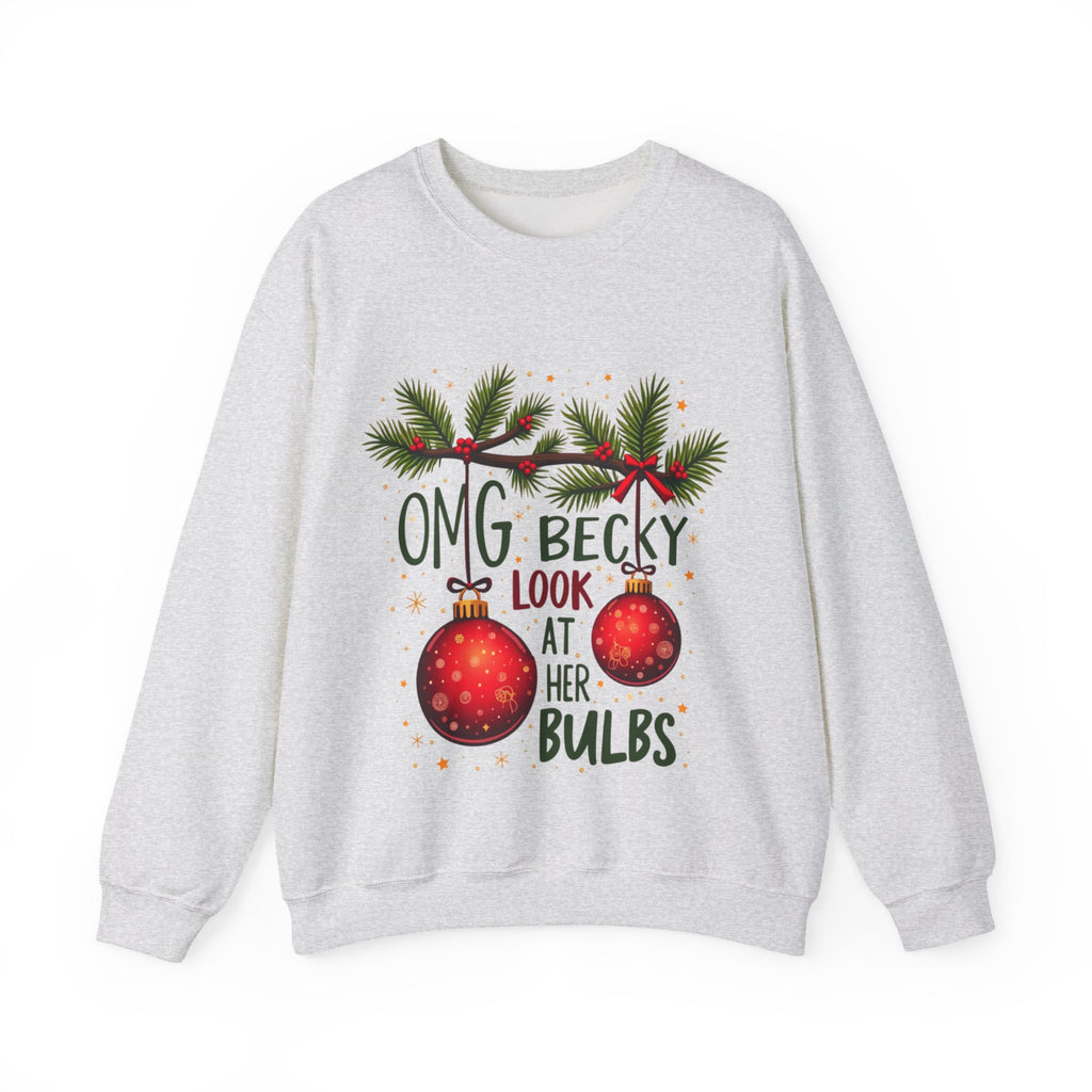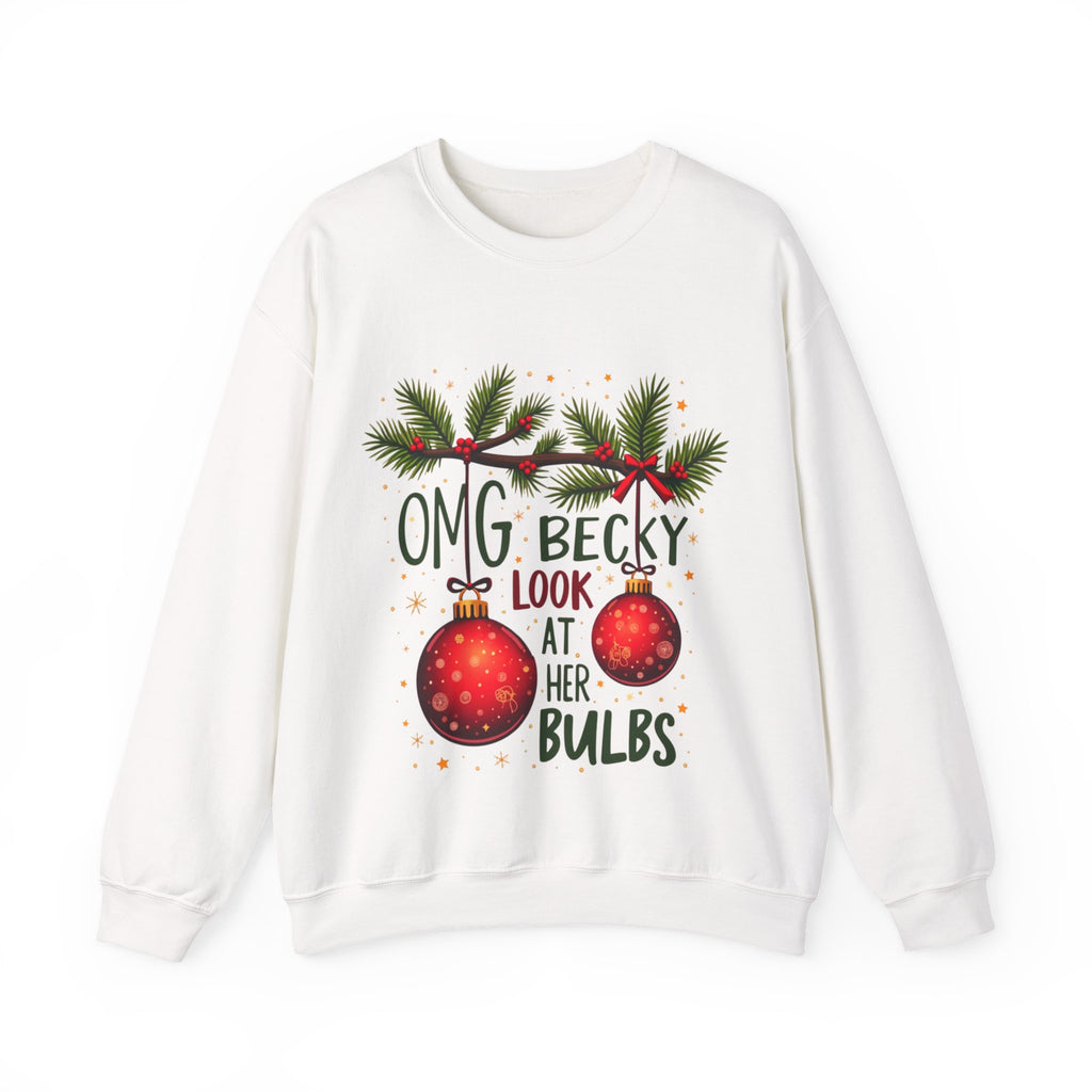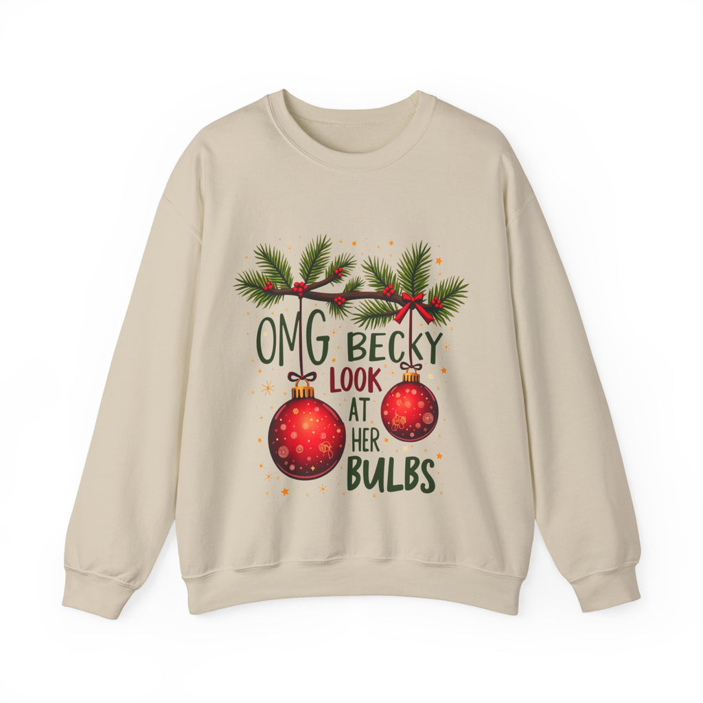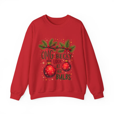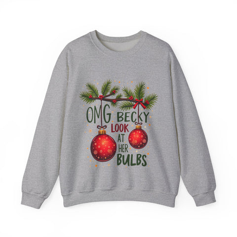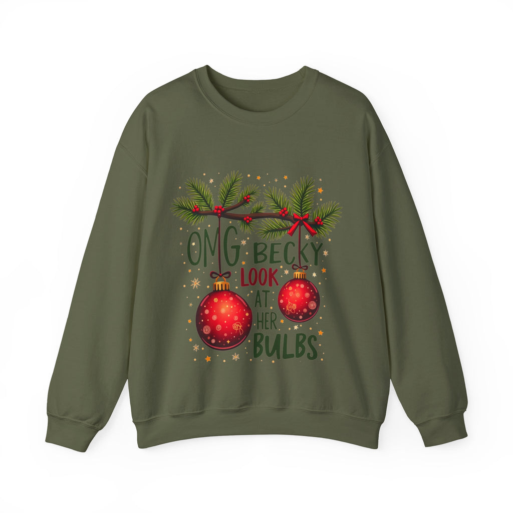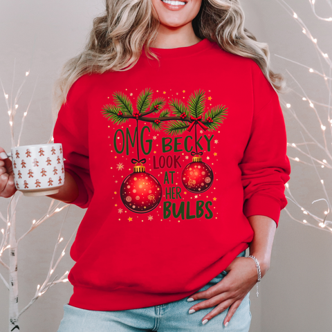 Deck the halls with a side of sass in our hilariously festive "OMG Becky Look At Her Bulbs" Christmas Sweatshirt! This cheeky sweater flaunts a whimsical Christmas branch dripping with dazzling ornaments, paired with the snarky phrase "OMG Becky Look At Her Bulbs" in bold, playful lettering. It’s the perfect mix of holiday cheer and sarcastic flair! Crafted from an oh-so-soft cotton-poly blend, this shirt is your go-to for slaying holiday parties, sipping spiked eggnog, or just roasting chestnuts (and maybe a few friends). The vibrant, high-quality graphic pops with festive attitude, making it a total must-have for anyone who loves a good laugh. Perfect for gifting to your wittiest friend (or keeping for yourself, duh). Grab yours now and let your bulbs shine bright this season. Click "Add to Cart" and bring the festive snark to your wardrobe!🎄