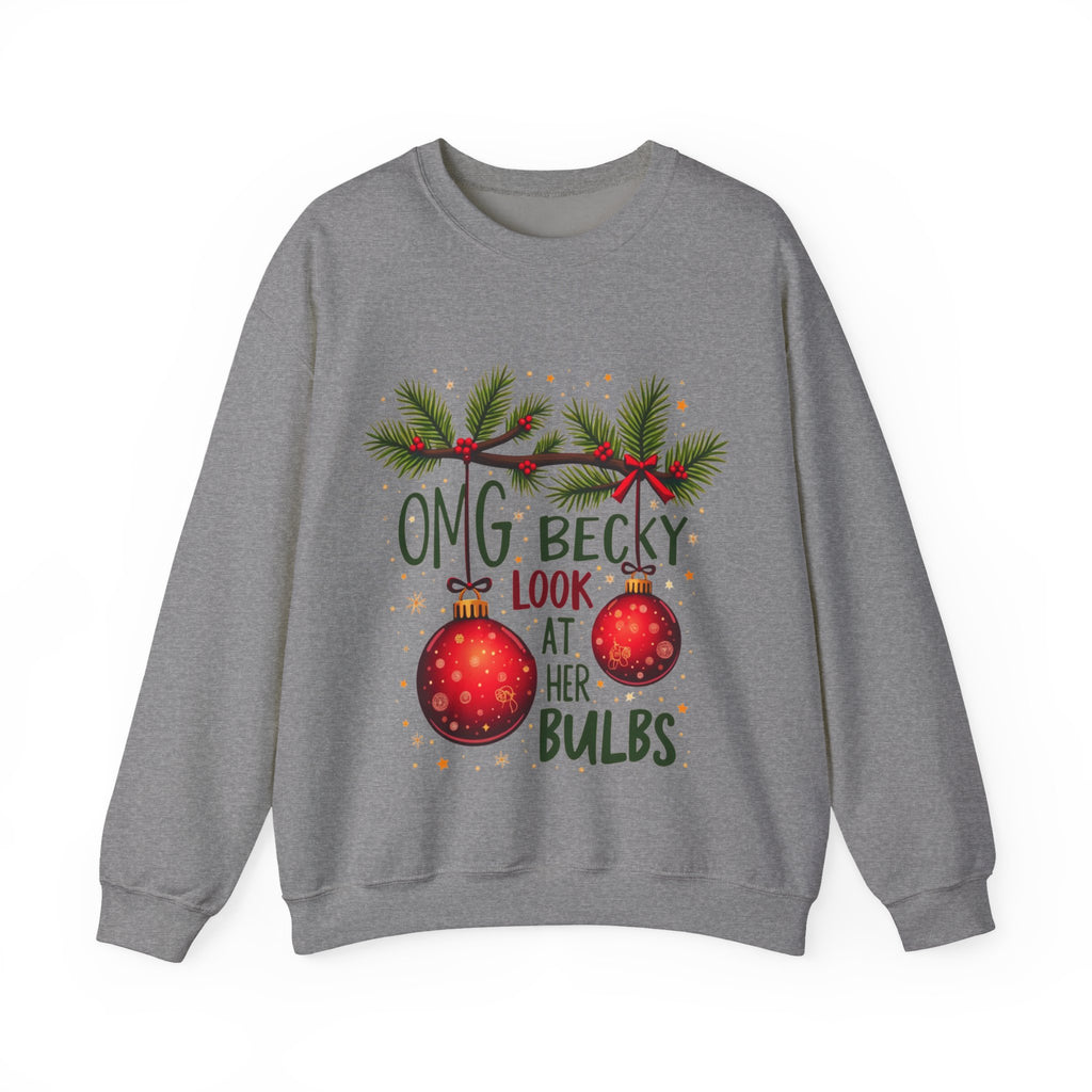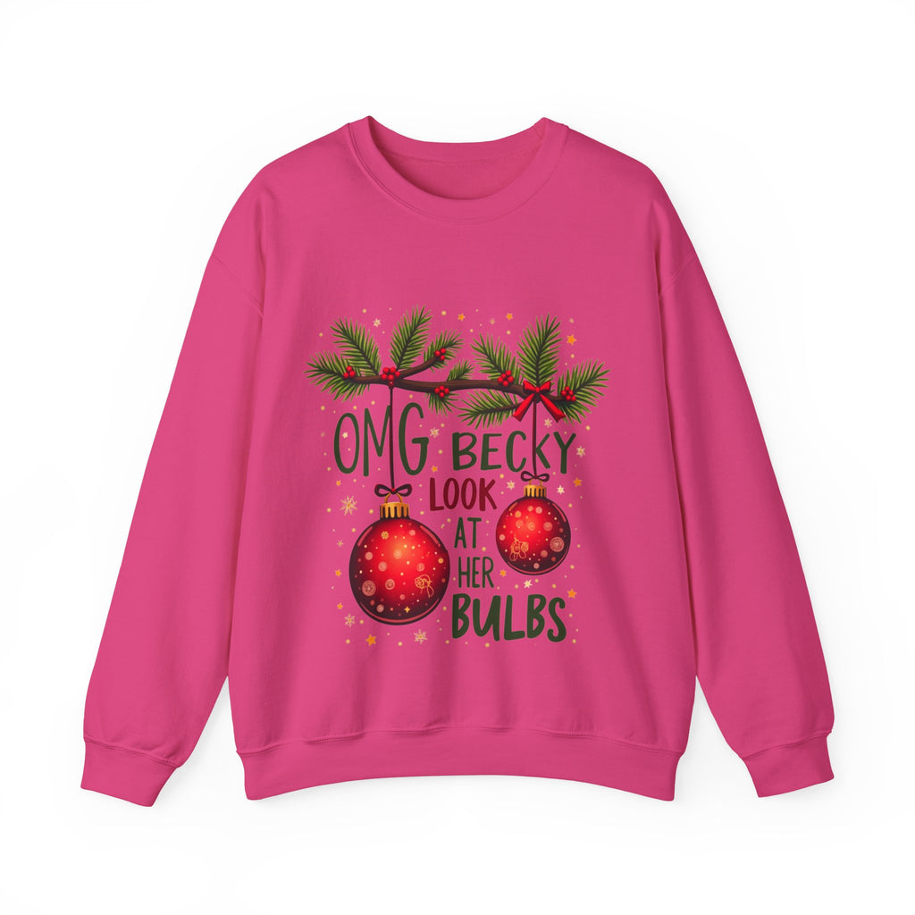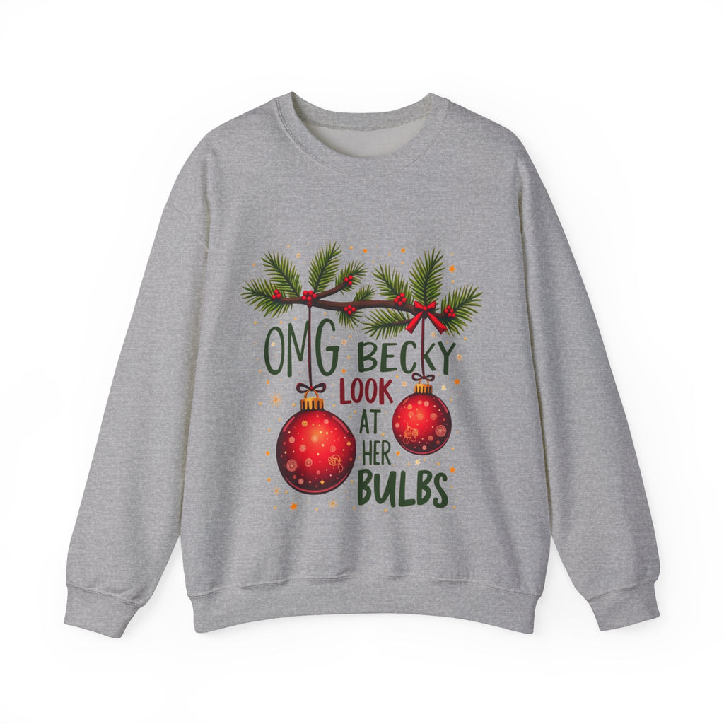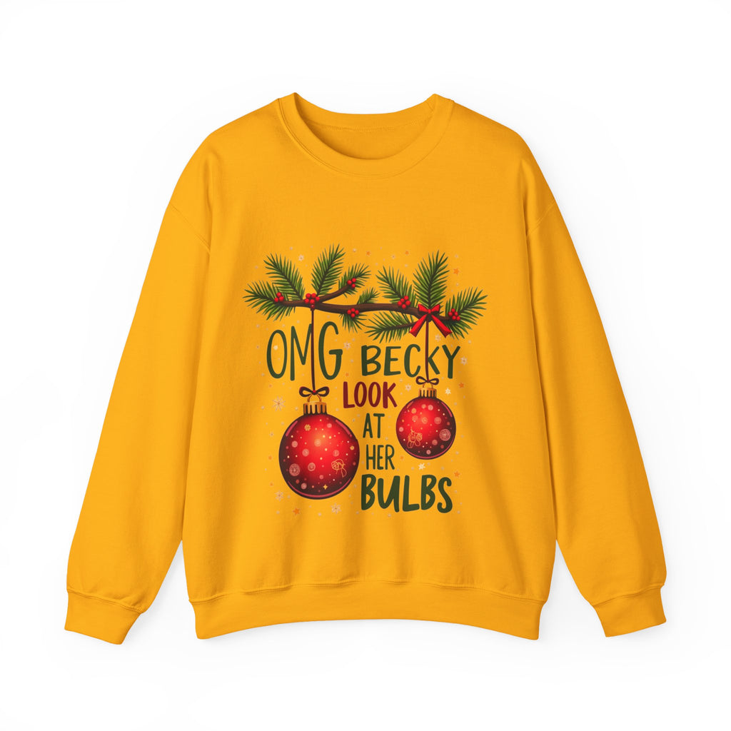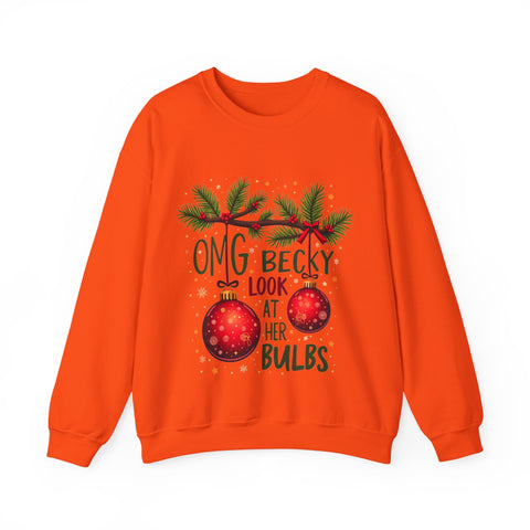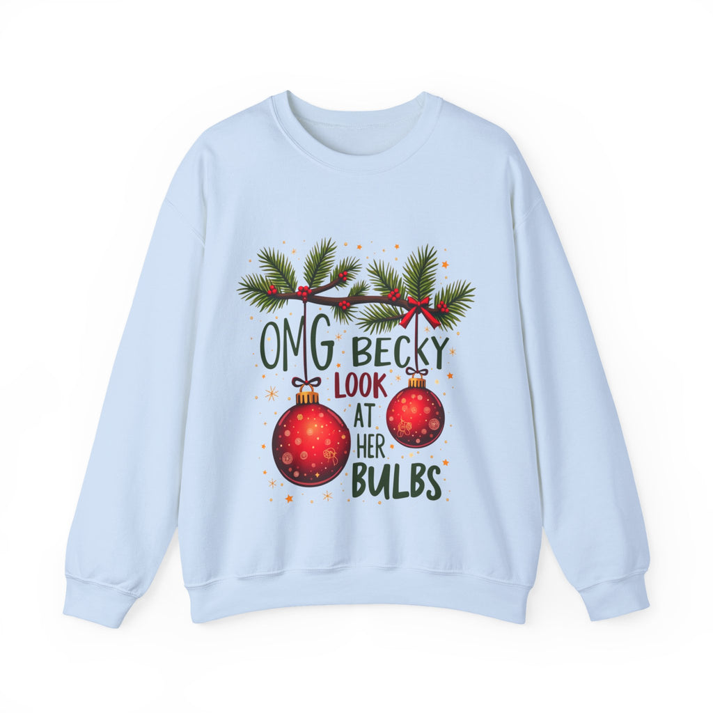 Deck the halls with a side of sass in our hilariously festive "OMG Becky Look At Her Bulbs" Christmas Sweatshirt! This cheeky sweater flaunts a whimsical Christmas branch dripping with dazzling ornaments, paired with the snarky phrase "OMG Becky Look At Her Bulbs" in bold, playful lettering. It’s the perfect mix of holiday cheer and sarcastic flair! Crafted from an oh-so-soft cotton-poly blend, this shirt is your go-to for slaying holiday parties, sipping spiked eggnog, or just roasting chestnuts (and maybe a few friends). The vibrant, high-quality graphic pops with festive attitude, making it a total must-have for anyone who loves a good laugh. Perfect for gifting to your wittiest friend (or keeping for yourself, duh). Grab yours now and let your bulbs shine bright this season. Click "Add to Cart" and bring the festive snark to your wardrobe!🎄