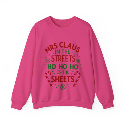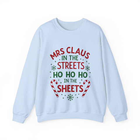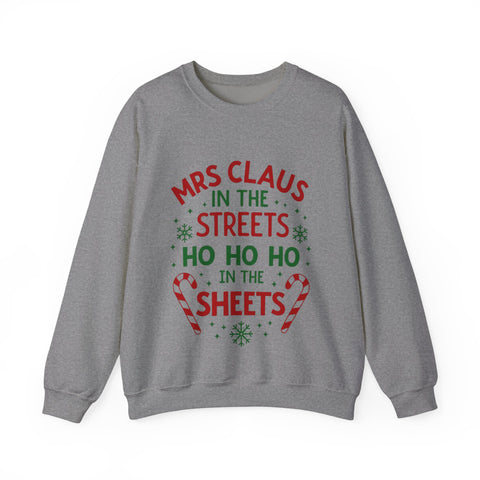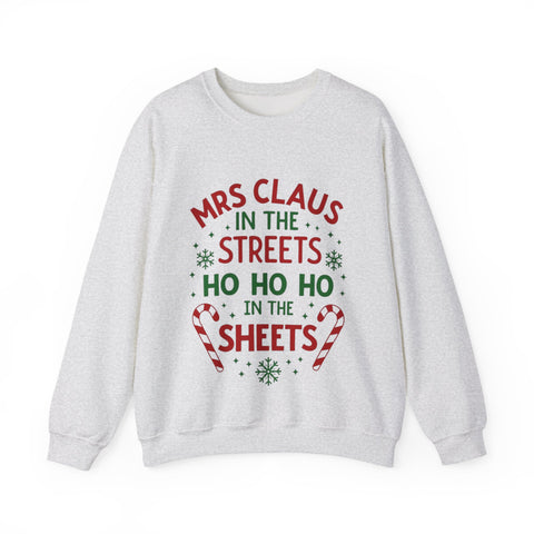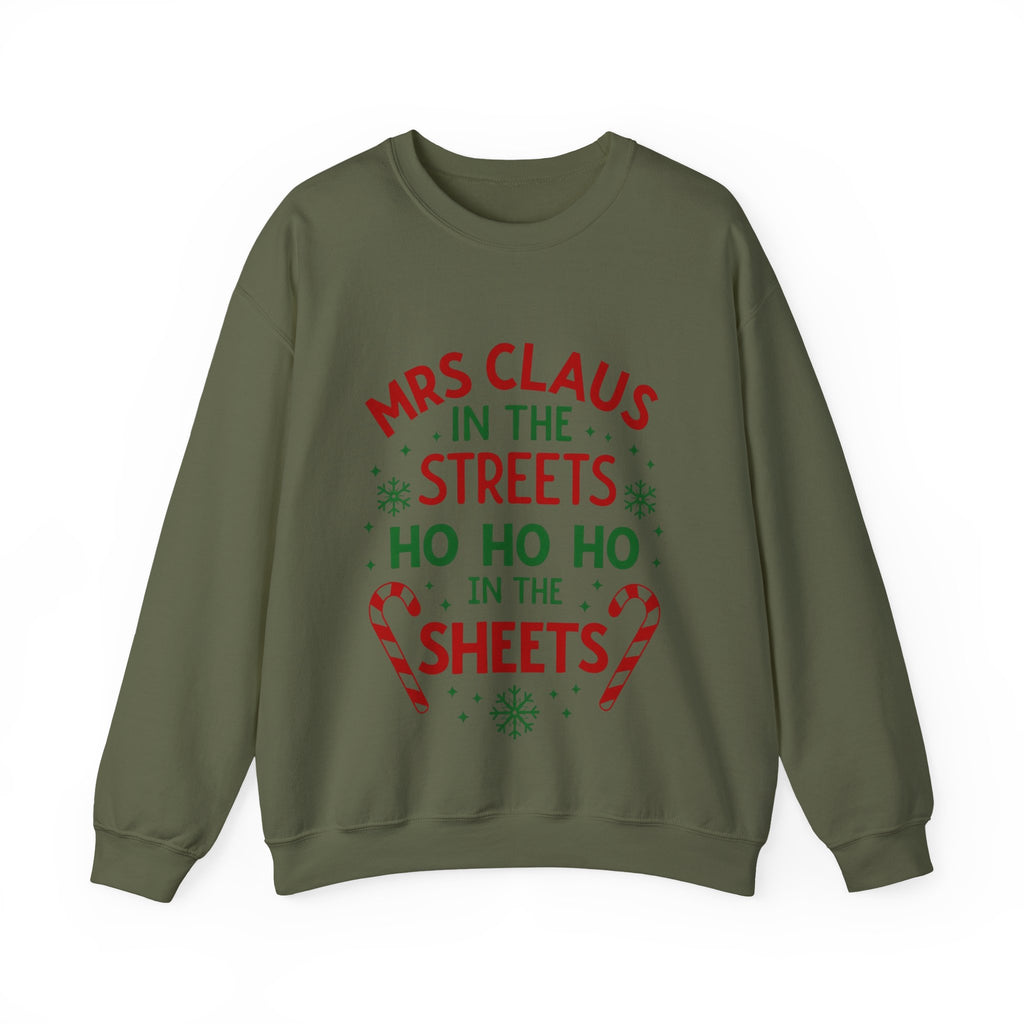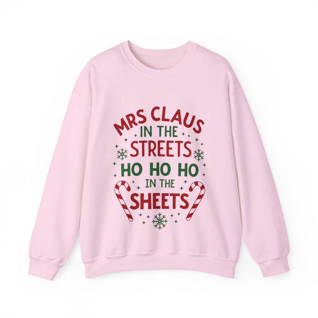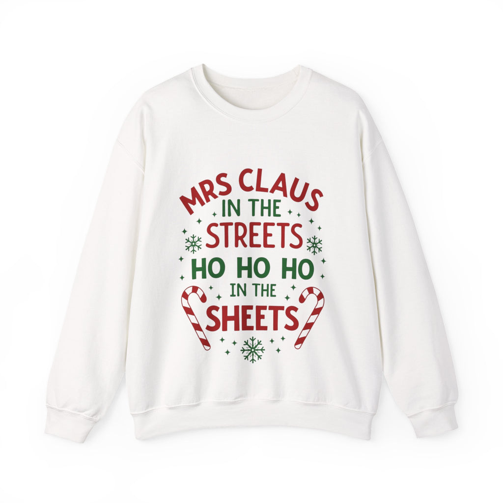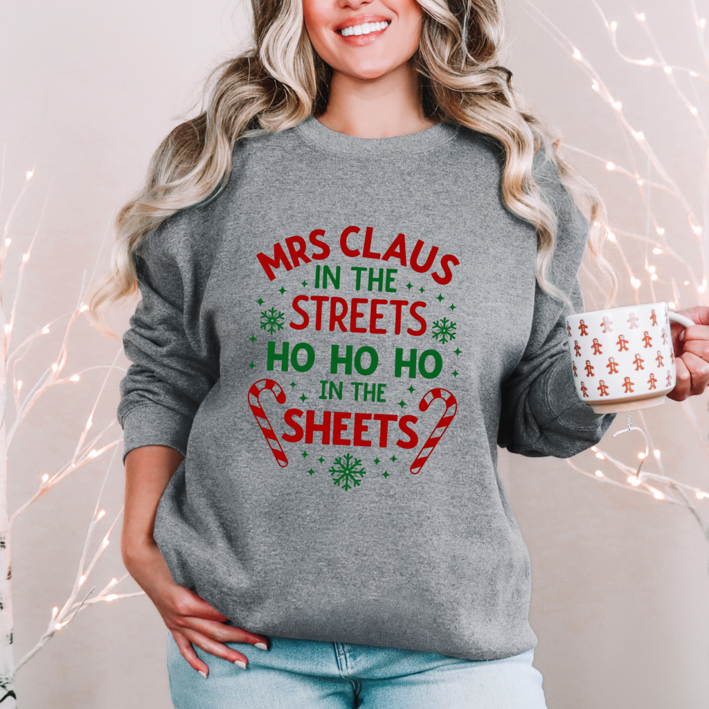 Oh, sugar, this sarcastic "Mrs. Claus in the Streets, Ho Ho Ho in the Sheets" Christmas Sweatshirt is serving naughty-and-nice vibes with a festive wink! Draped in playful Christmas elements, this crewneck is your go-to for strutting through holiday markets or turning up the heat by the fireside. Crafted from whisper-soft fabric that’s comfier than a sleigh ride snuggle, it’s perfect for sipping hot cocoa with a smirk or dodging boring gift exchanges. Get ready to sleigh the season with a sassy, merry swagger that’ll have everyone jingling with envy! Snag this sweater and let the world know you’re not afraid to show your naughty side!