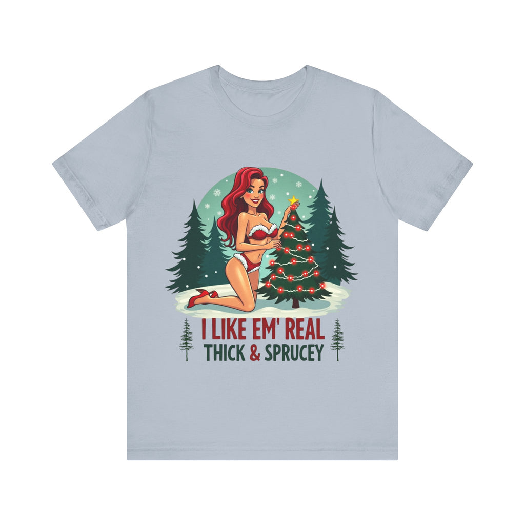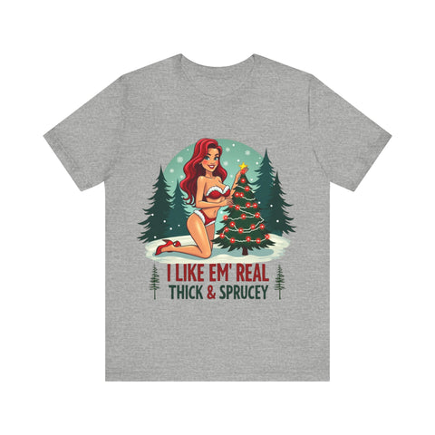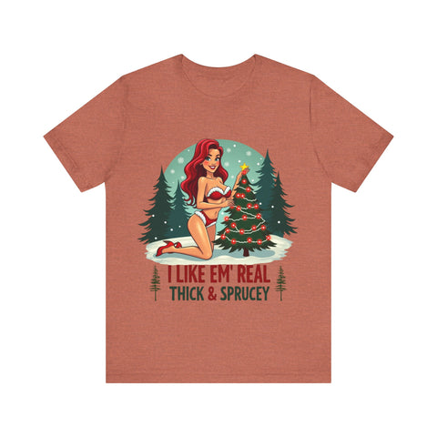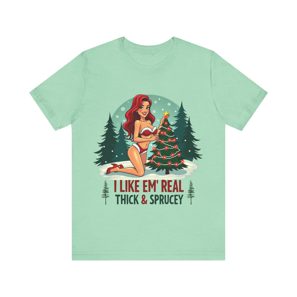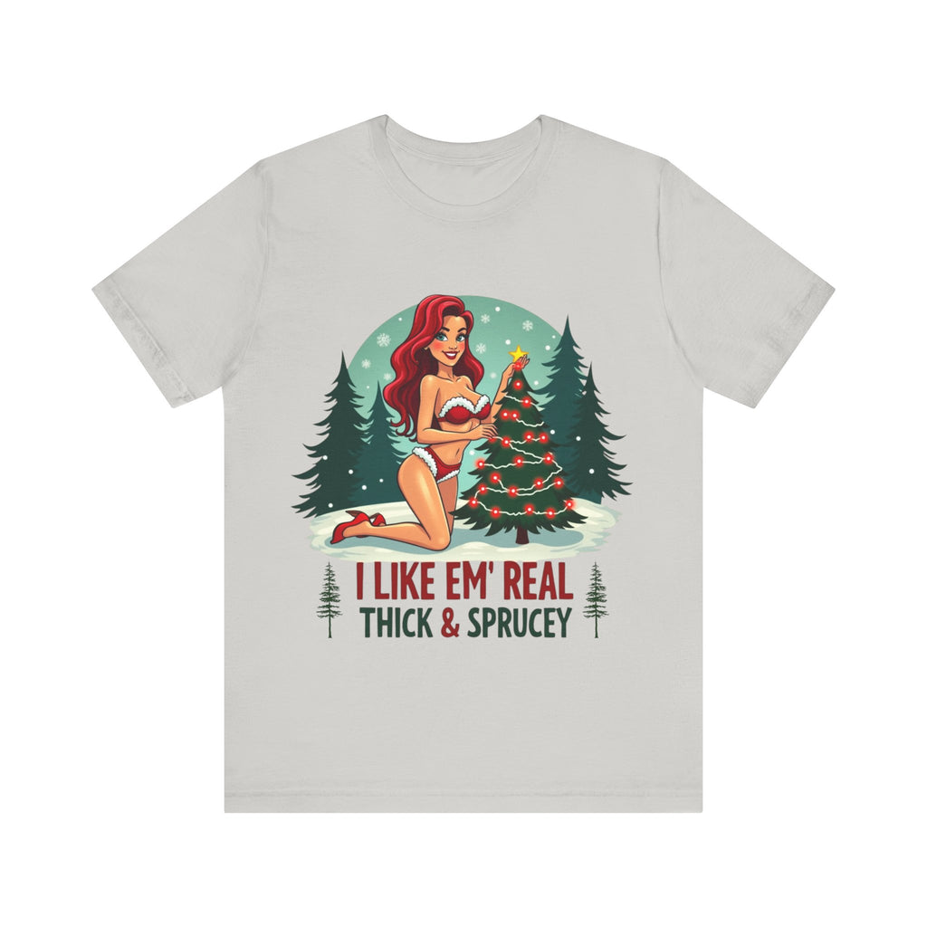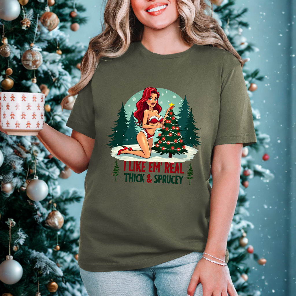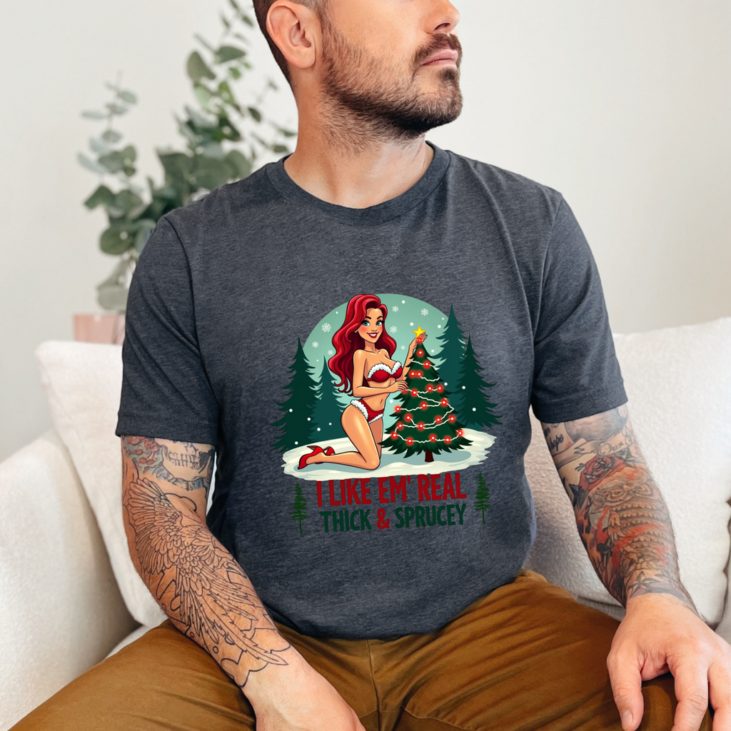 Well, hello there, you festive vixen! This "I Like 'Em Real Thick and Sprucey" Christmas T-Shirt is your new holiday obsession, starring a flirty pin-up girl draped beside a lush spruce tree that’s got all the right branches. Perfect for sashaying into holiday parties, winking over hot cocoa, or just owning the winter glow-up with a sassy smirk. Crafted from super soft fabric that hugs you like a cozy fireside cuddle, this tee is your ticket to sleighing the season with style and a whole lotta sprucey attitude! The ultimate gift for your favorite merry minx or tree-loving tease. Grab this tee and let everyone know you’re here for the thick and sprucey holiday magic!