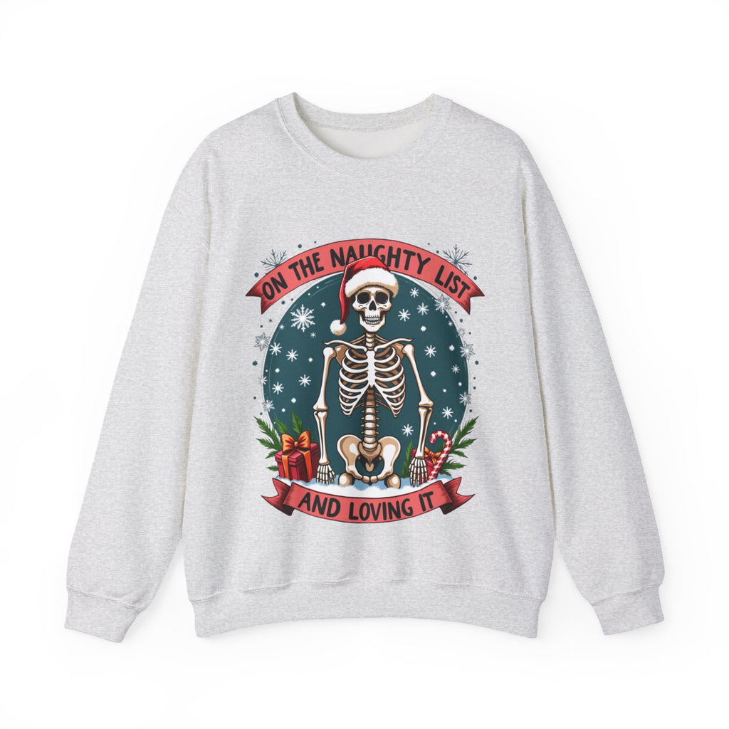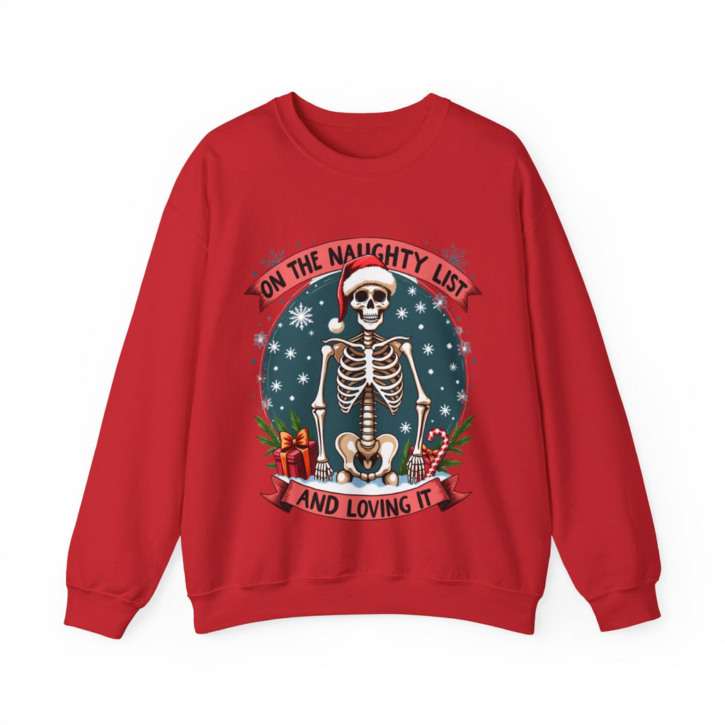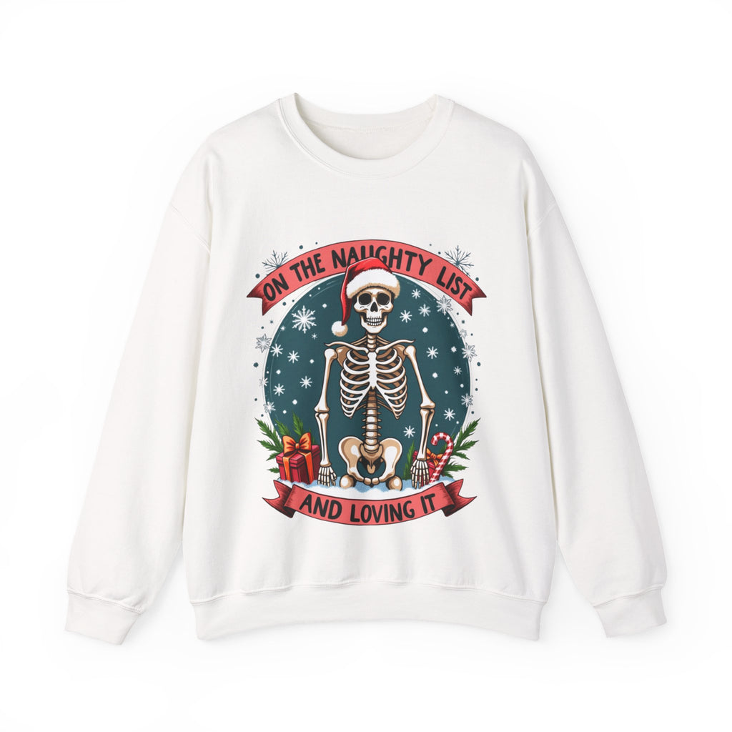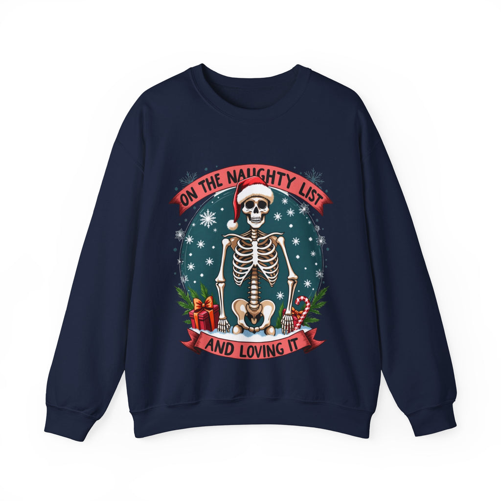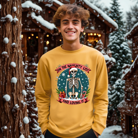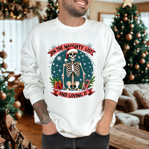 Ho Ho Ho? More like No No No! This sassy skeleton Christmas sweater is for all you rebels who’ve made Santa’s naughty list and are totally owning it. With a cheeky skeleton grinning ear-to-ear and the bold text “On The Naughty List and Loving It,” this sweatshirt is your holiday must-have for spreading mischief and festive vibes.