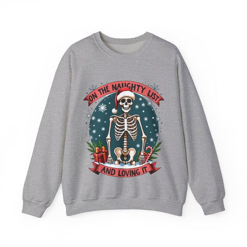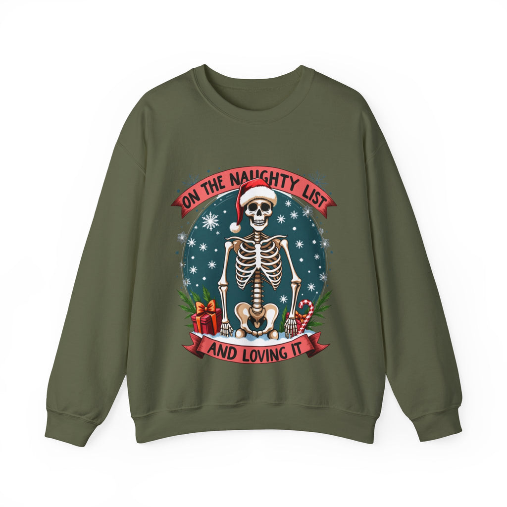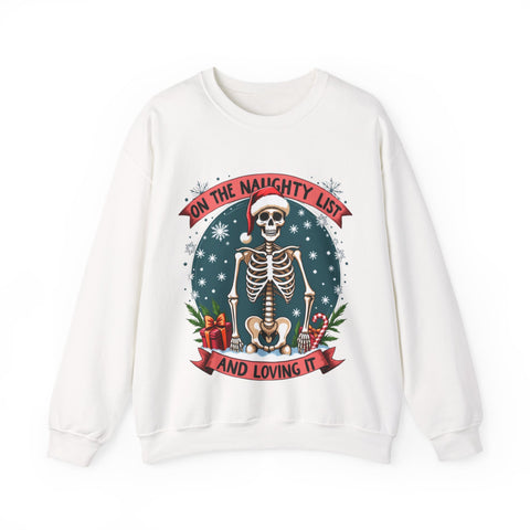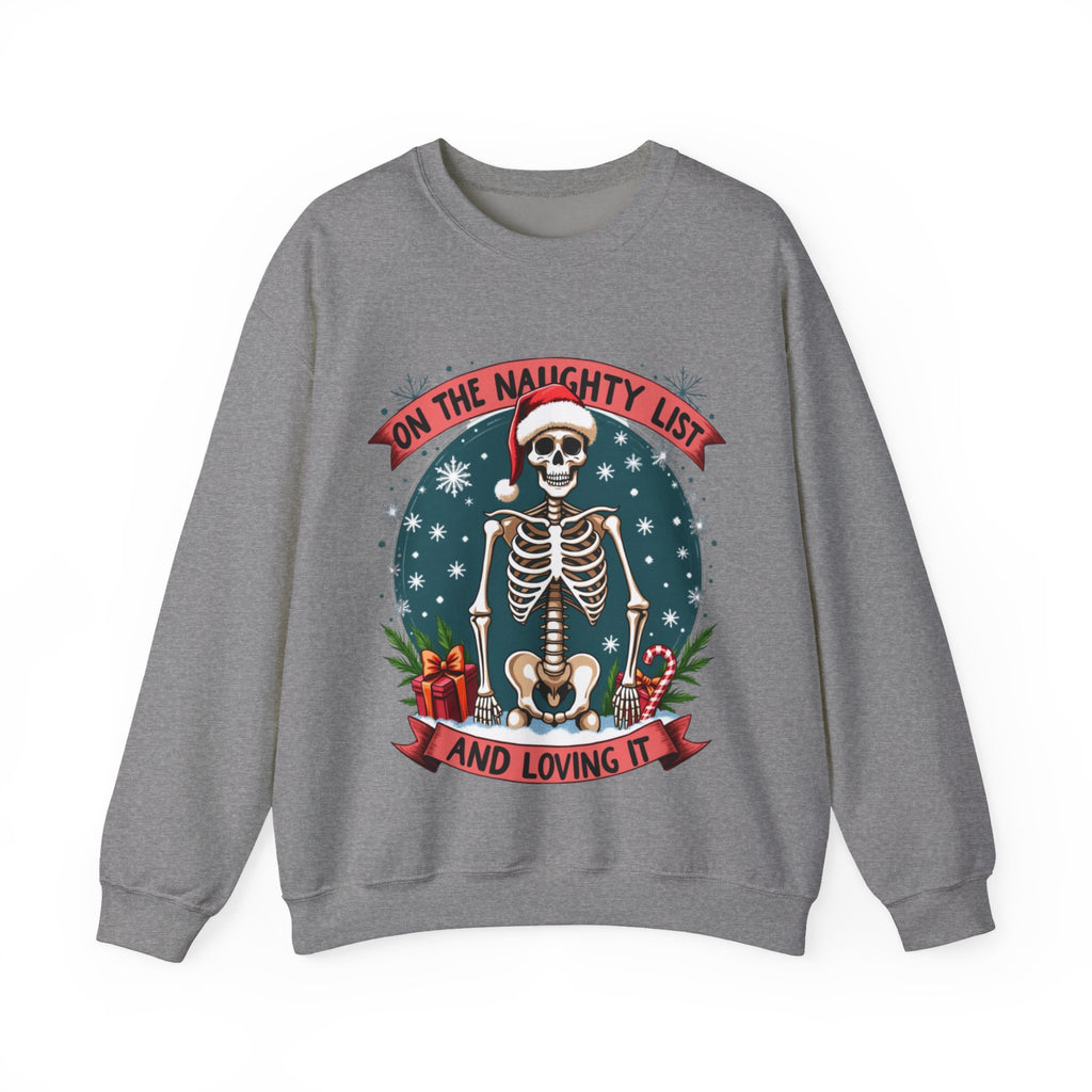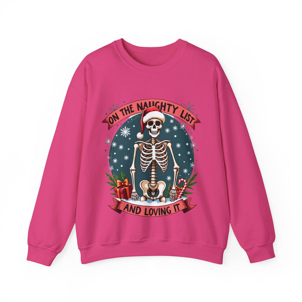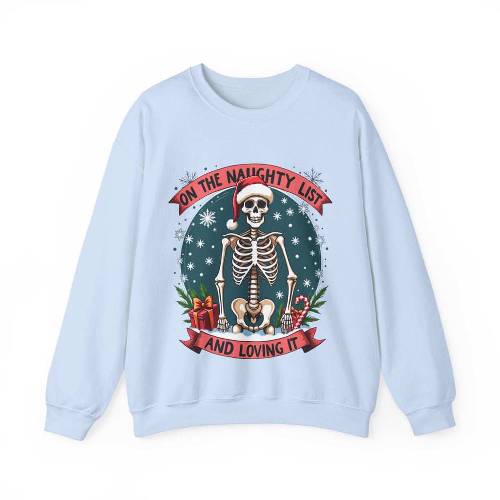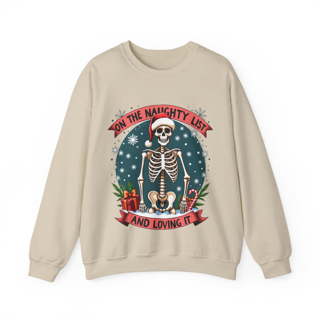 Ho Ho Ho? More like No No No! This sassy skeleton Christmas sweater is for all you rebels who’ve made Santa’s naughty list and are totally owning it. With a cheeky skeleton grinning ear-to-ear and the bold text “On The Naughty List and Loving It,” this sweatshirt is your holiday must-have for spreading mischief and festive vibes.