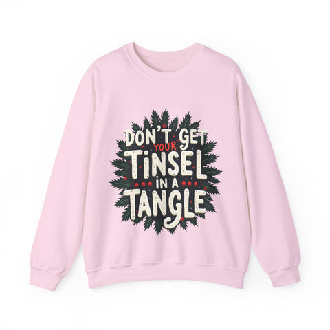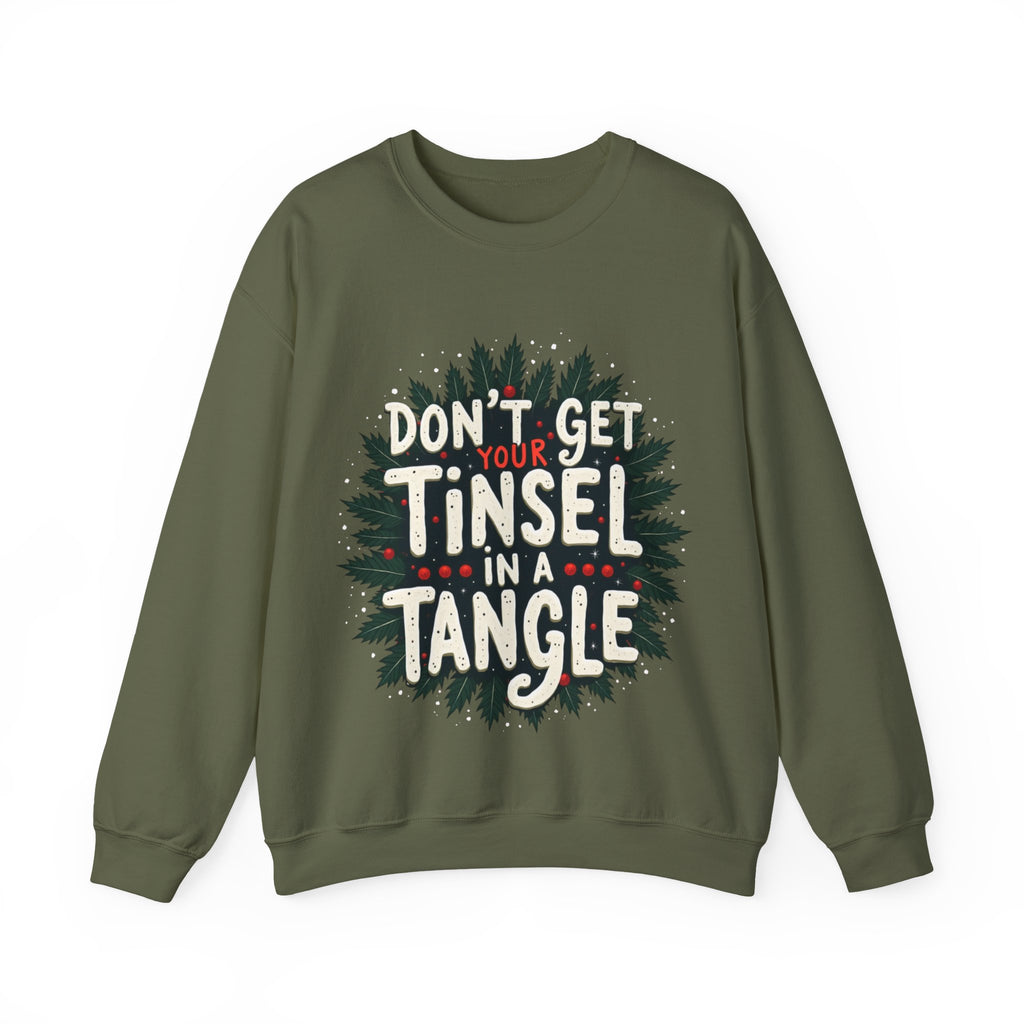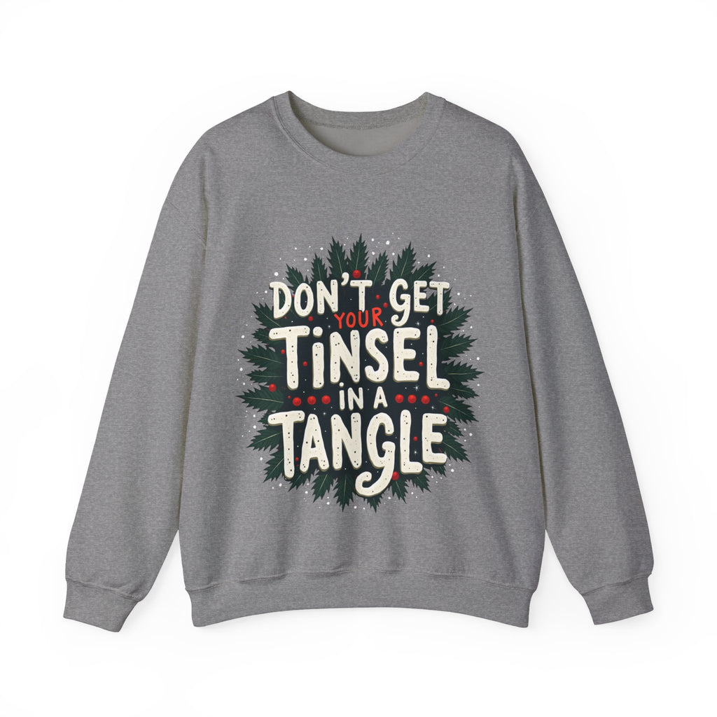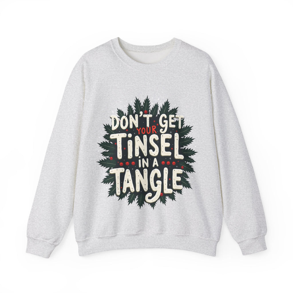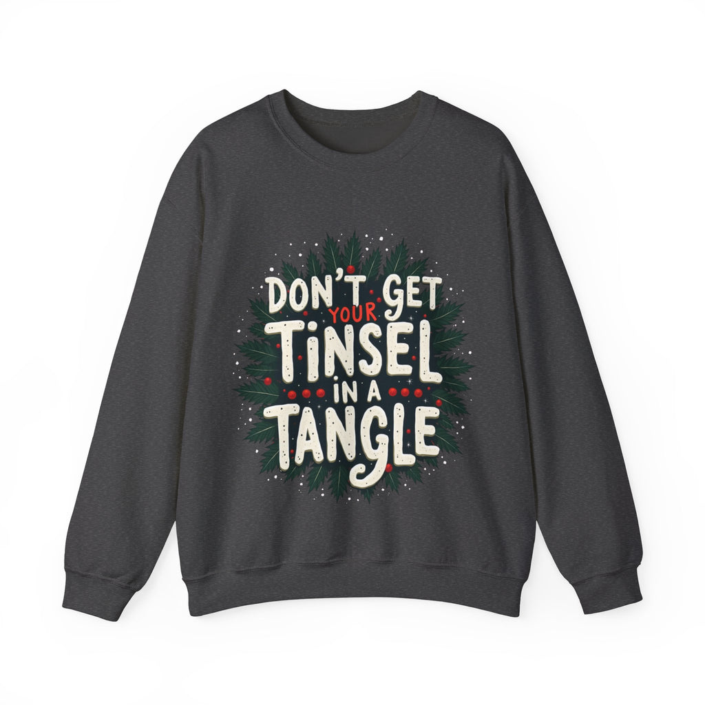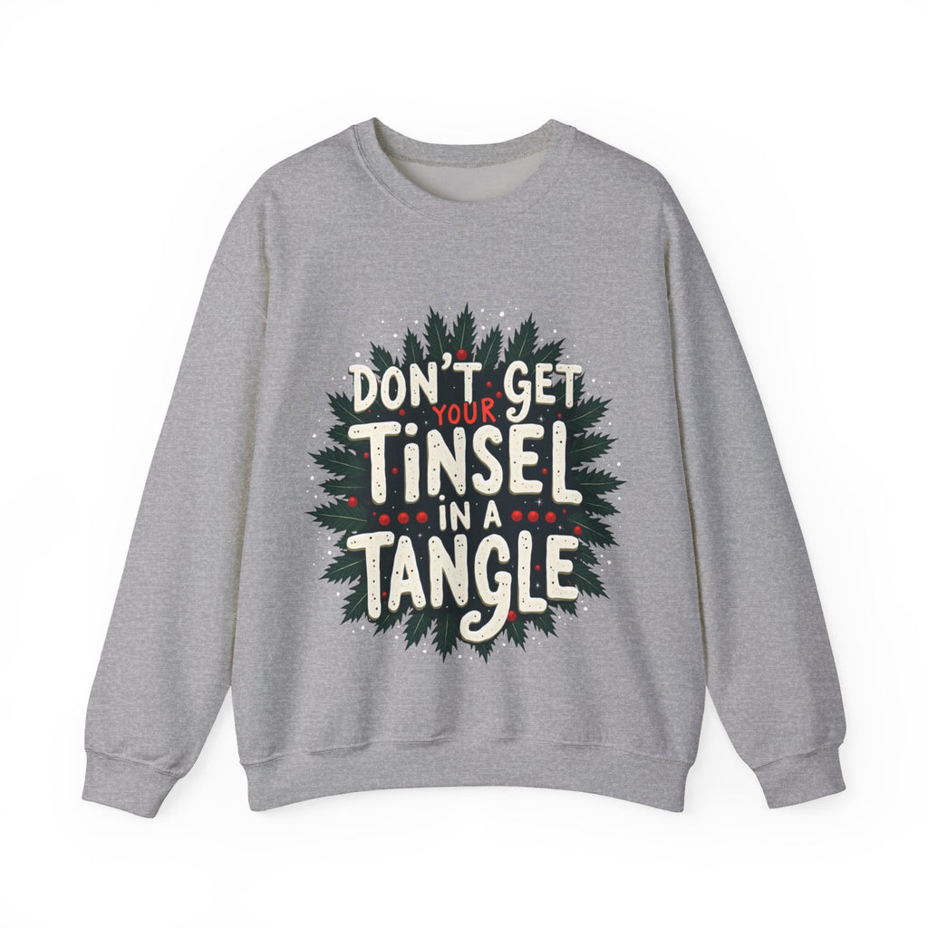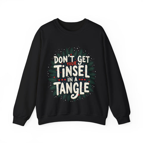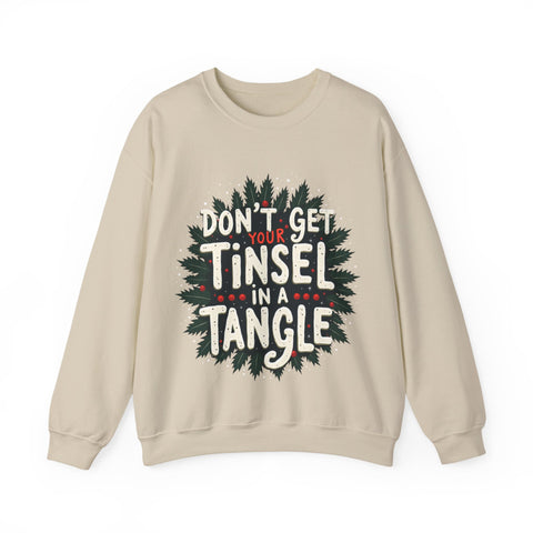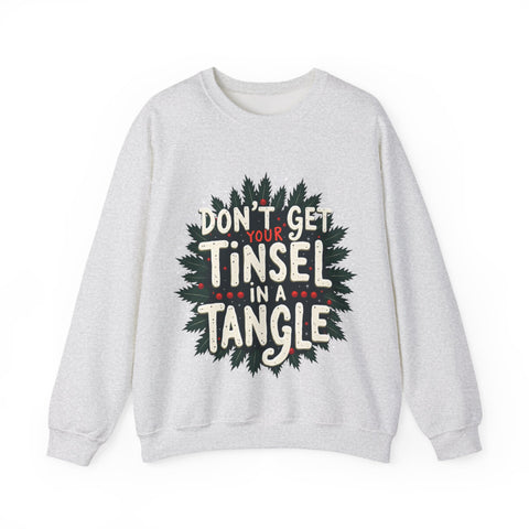 Keep your holiday cool with our "Don't Get Your Tinsel in a Tangle" Christmas Sweatshirt, the perfect sarcastic swagger for navigating the festive frenzy! This sweaters' bold, festive tagline shines like a beacon of chill. It’s the vibe for those who love the holidays but aren’t here for the drama. Made from an ultra-soft cotton-poly blend that’s cozier than a snowed-in Netflix binge, this unisex sweatshirt (sizes S-3XL) is your go-to for sipping spiked cider, dodging holiday small talk, or slaying the ugly sweater party with zero stress. It’s the ultimate gift for your snarkiest pal or a must-have to wear your festive nonchalance with a smirk. Don’t let this pullover get knotted up in the holiday rush! Grab it now and keep your tinsel - and your sanity - untangled.