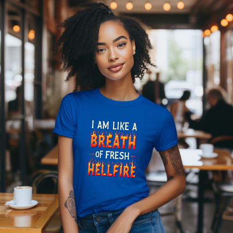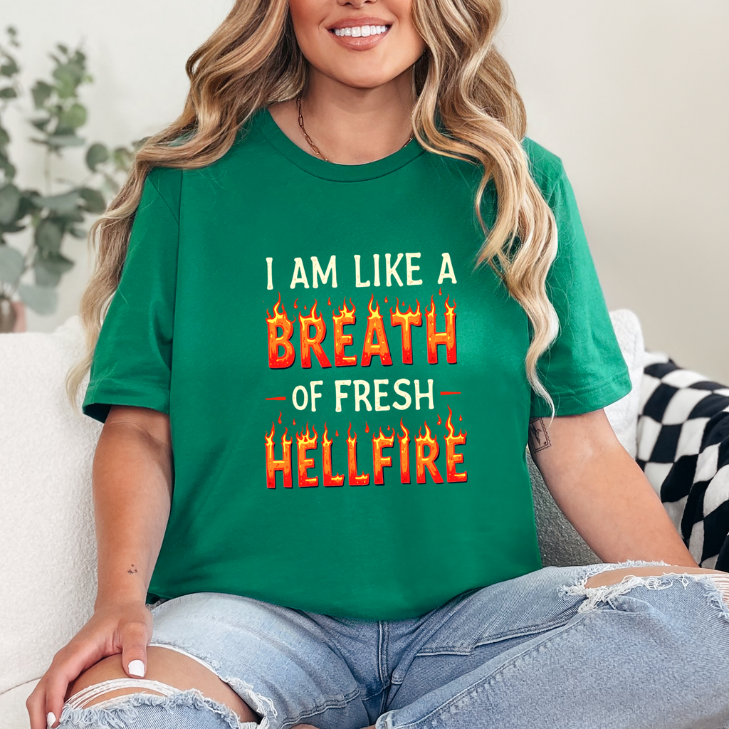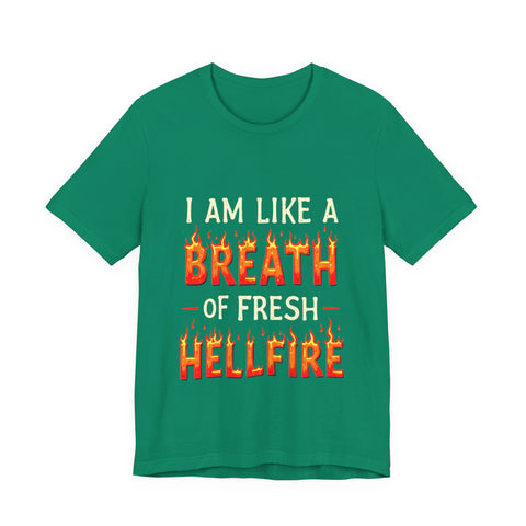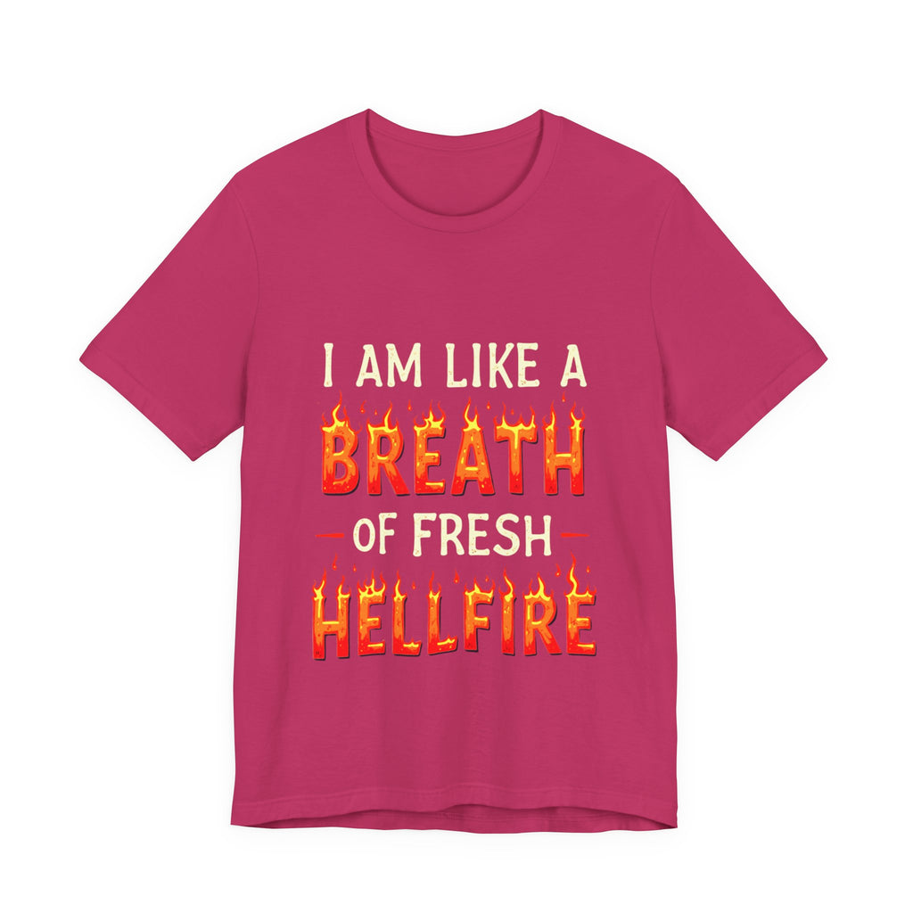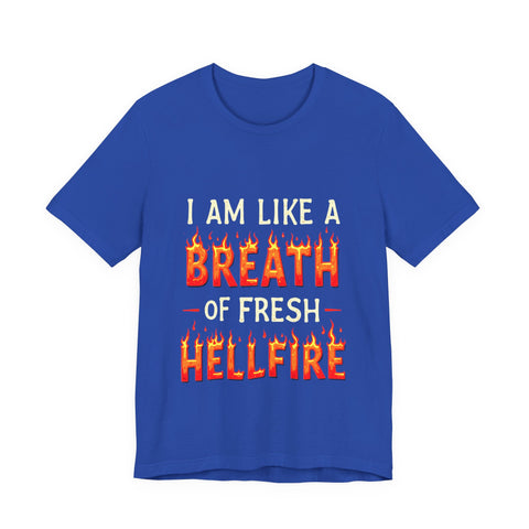 Embrace your unique style with this Unisex Jersey Short Sleeve Tee, perfect for expressing your fiery personality. With a bold design that declares, "I am like a breath of fresh hellfire," this tee radiates confidence and fun. Ideal for casual outings, this shirt transitions seamlessly from relaxed get-togethers to laid-back celebrations with friends. It’s especially relevant for fans of edgy humor, Halloween enthusiasts, or anyone who loves to stand out. Experience comfort and flair whether you're dressing up for a festival or simply lounging at home. Gift it for birthdays, festive occasions, or just because!