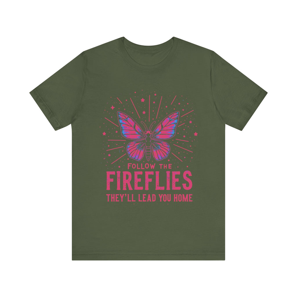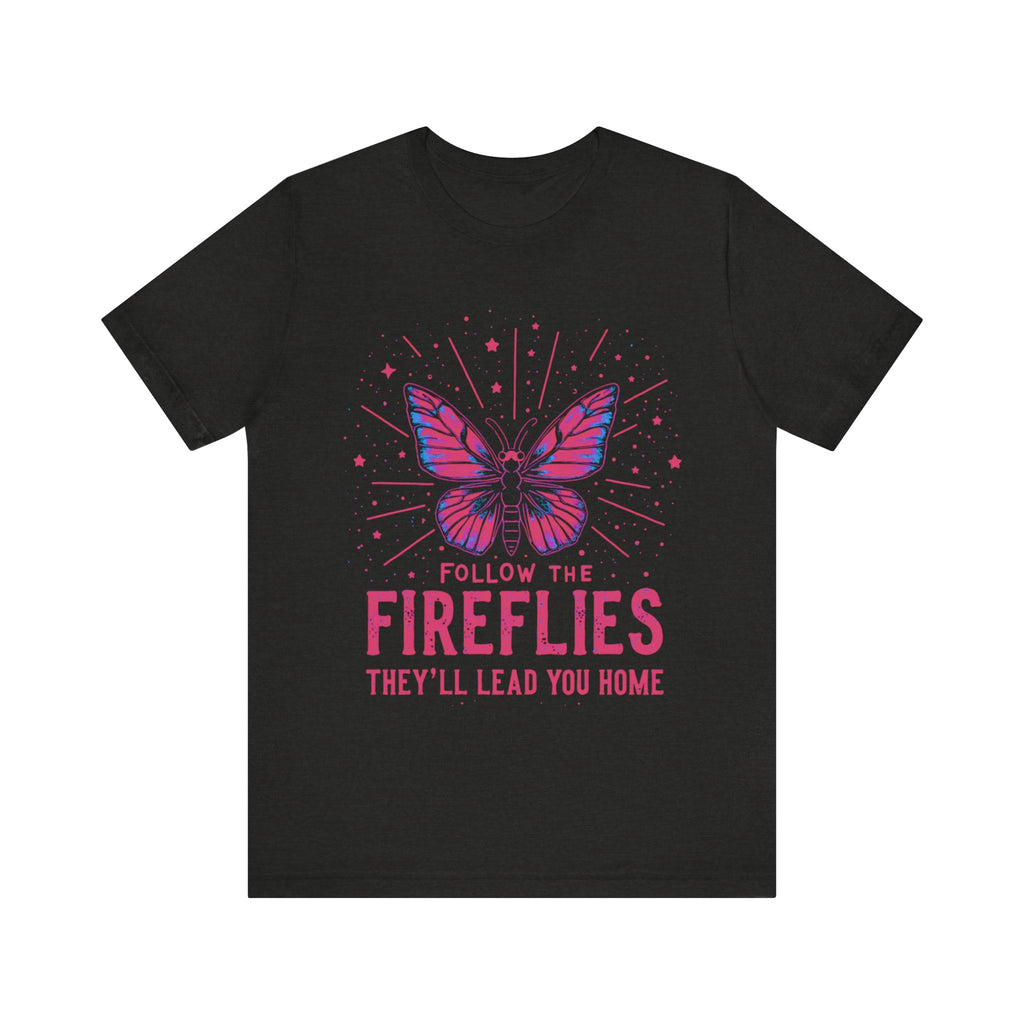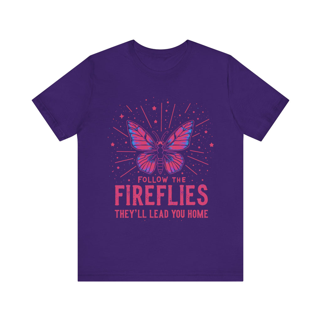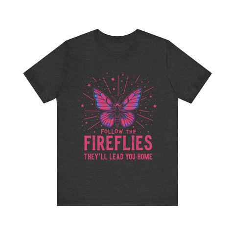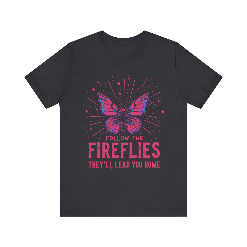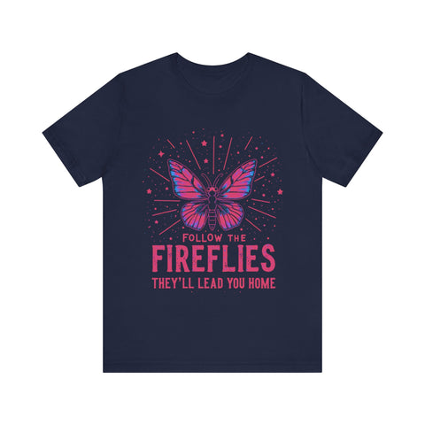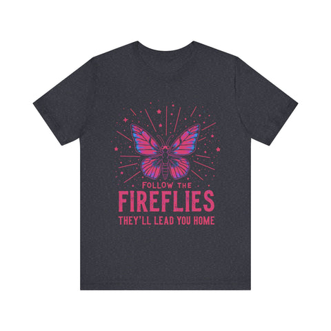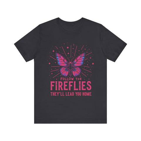 Embrace the magic of the outdoors with our unisex jersey short sleeve tee. Featuring a whimsical design that invites you to "Follow the Fireflies, They'll Lead You Home," this tee radiates warmth and nostalgia, perfect for nature lovers and adventure seekers. Its' breathable and lightweight fabric makes it ideal for both casual outings and cozy evenings around the campfire. Great for those who cherish summer nights, outdoor gatherings, or simply relaxing at home. This tee is perfect for Mother's Day, camping, glamping, bonfire parties, or any occasion where memories are made. Wear it to celebrate your connection to nature and seek adventure with friends and family!