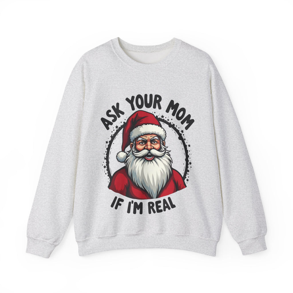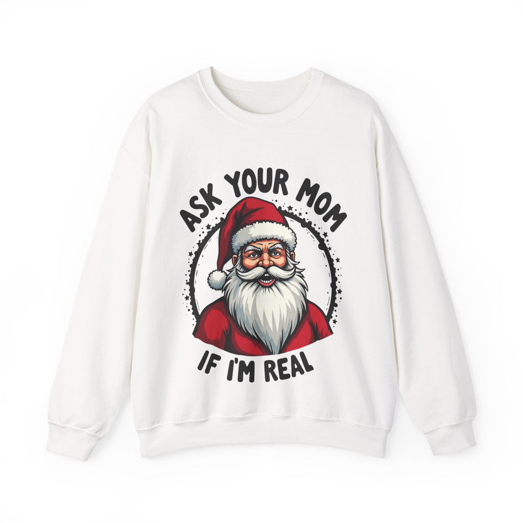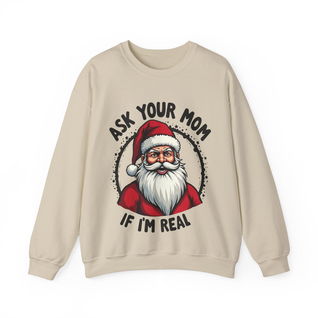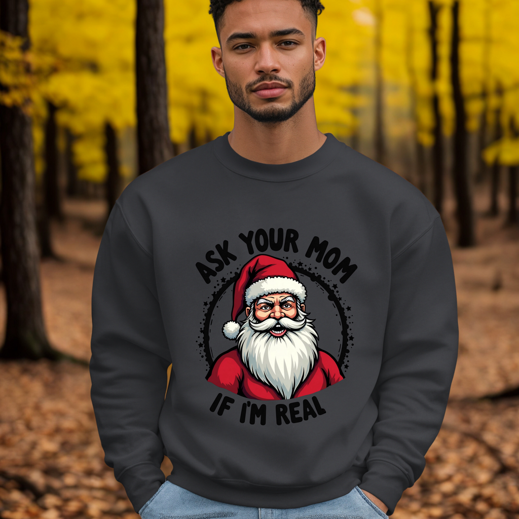 Ho ho whoa, this "Ask Your Mom If I'm Real" Christmas Sweatshirt is serving sassy Santa realness with a side of sarcastic swagger! Featuring a Santa who’s got that twinkle in his eye and a smirk that says he’s definitely real, this crewneck is your holiday must-have for stealing the show. Made from an oh-so-soft, dad bod hugging cotton-poly blend, it’s perfect for sipping spiked nog, dodging boring gift exchanges, or winking your way through festive chaos. Get ready to sleigh the season with a naughty grin and some serious holiday shade! The perfect gift for your favorite festive firecracker. Snag this sweater and let everyone know Santa’s got sass - and your mom’s got the receipts!
