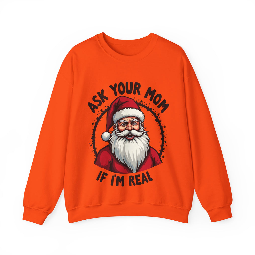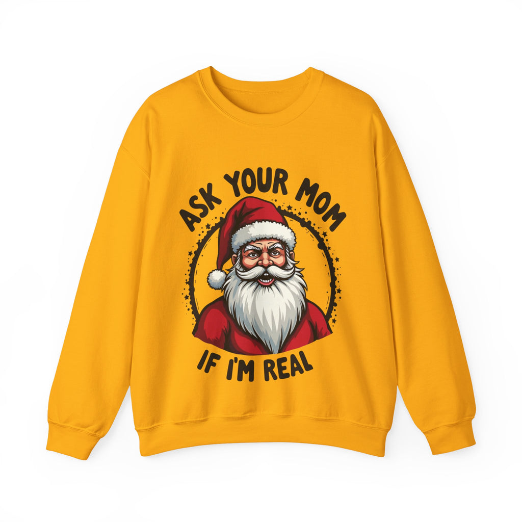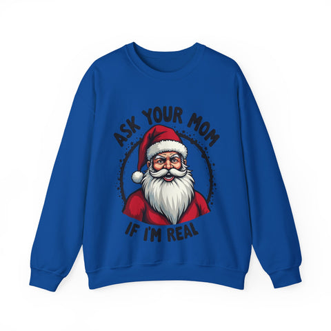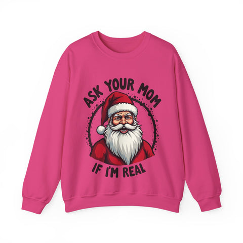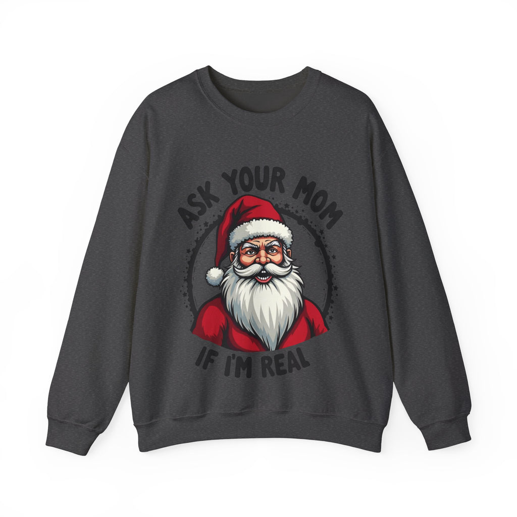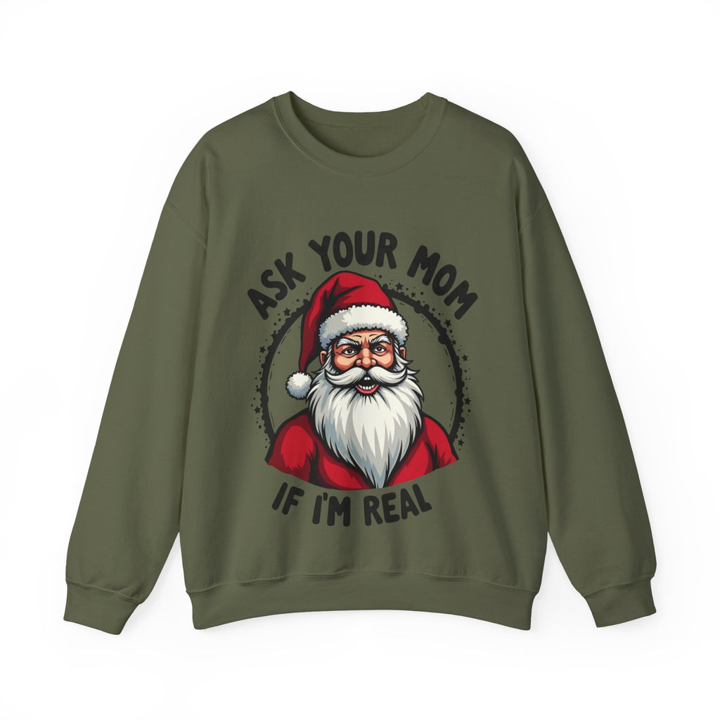 Ho ho whoa, this "Ask Your Mom If I'm Real" Christmas Sweatshirt is serving sassy Santa realness with a side of sarcastic swagger! Featuring a Santa who’s got that twinkle in his eye and a smirk that says he’s definitely real, this crewneck is your holiday must-have for stealing the show. Made from an oh-so-soft, dad bod hugging cotton-poly blend, it’s perfect for sipping spiked nog, dodging boring gift exchanges, or winking your way through festive chaos. Get ready to sleigh the season with a naughty grin and some serious holiday shade! The perfect gift for your favorite festive firecracker. Snag this sweater and let everyone know Santa’s got sass - and your mom’s got the receipts!