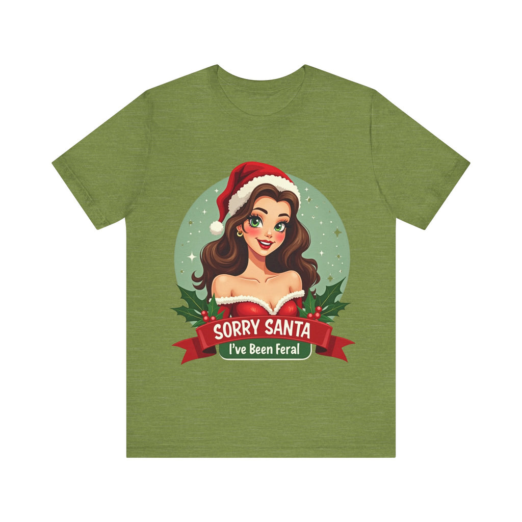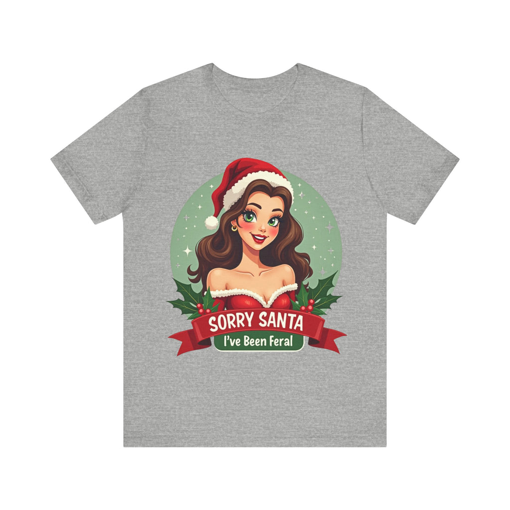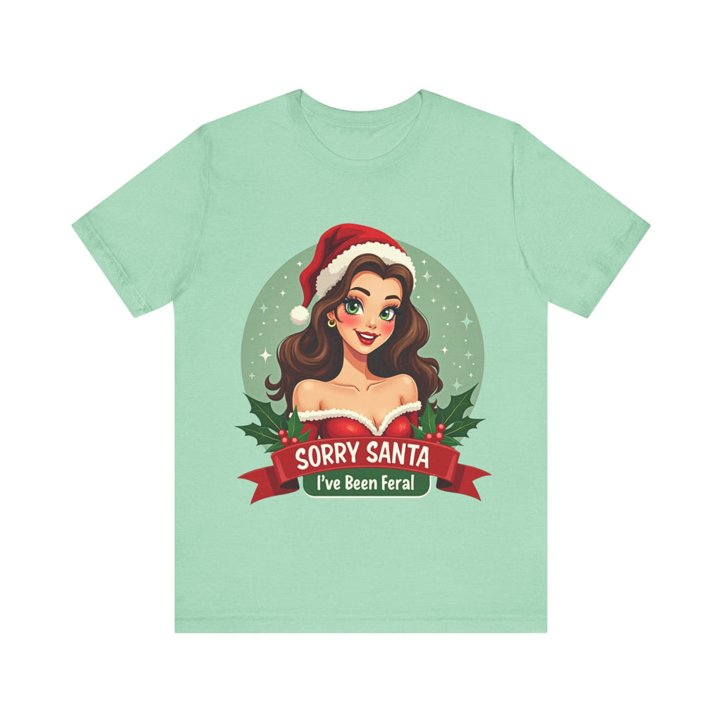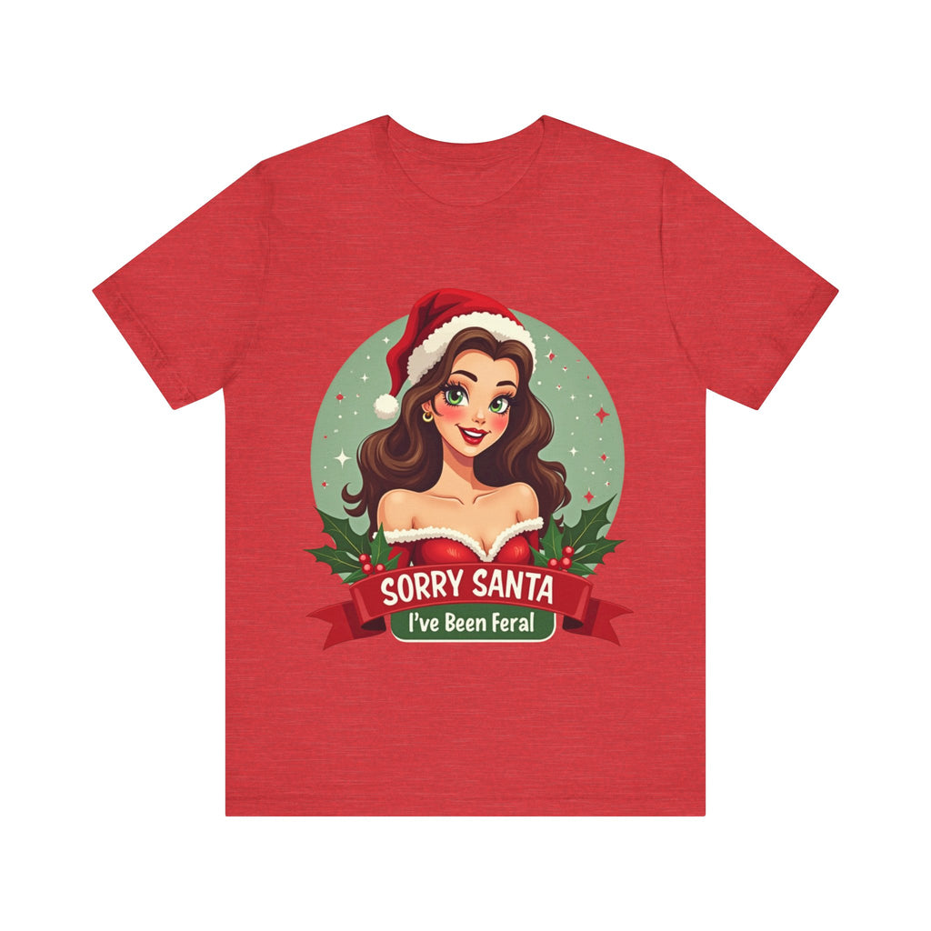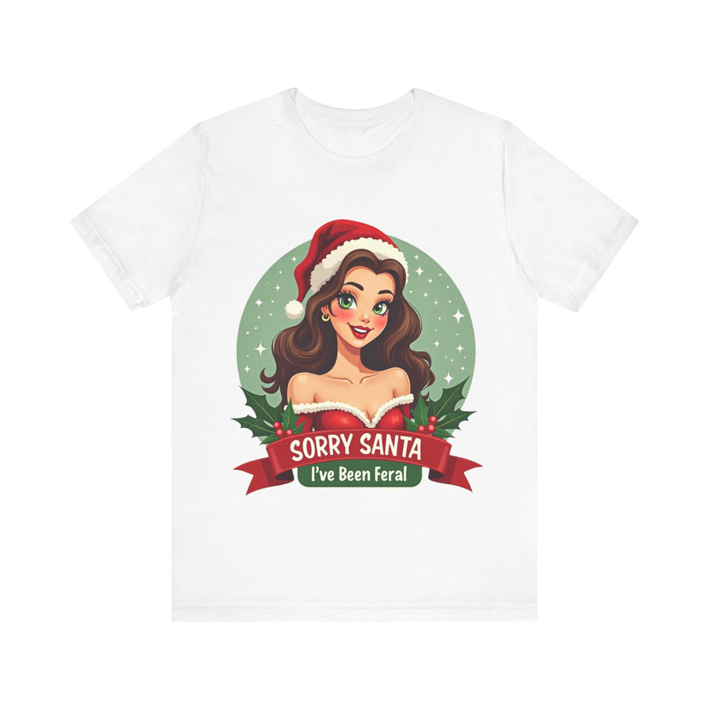Unleash your inner holiday rebel with our "Sorry Santa I've Been Feral" Christmas T-Shirt! This sassy tee stars a coquette pinup girl lounging with a flirty smirk, sporting a Santa hat tipped just so. The design pops like a champagne cork, shouting, “I’m festive, but I’m running wild!”. Crafted from buttery-soft cotton that’s cozier than a stolen holiday cookie, this unisex shirt (sizes S-3XL) is perfect for slaying the holiday party, dodging nosy relatives, or just serving looks while untangling Christmas lights. It’s the ultimate gift for your boldest bestie or a must-have to wear your naughty-list energy with a wink. Don’t let this tee slip into the North Pole’s lost-and-found! Snag it now and rock the season with feral fabulousness.