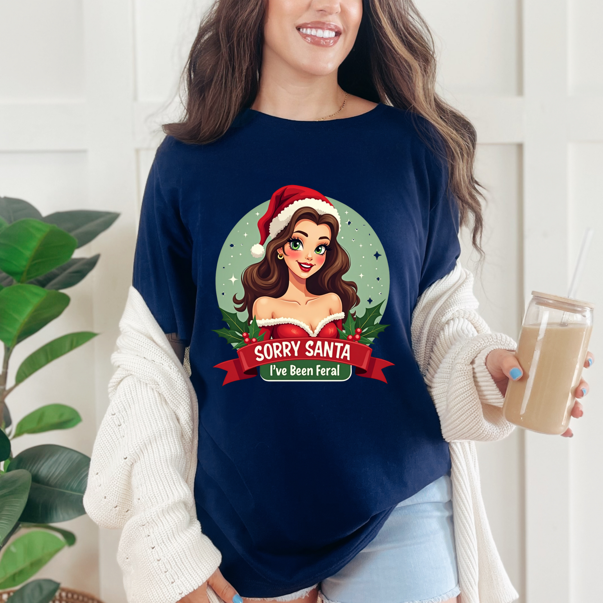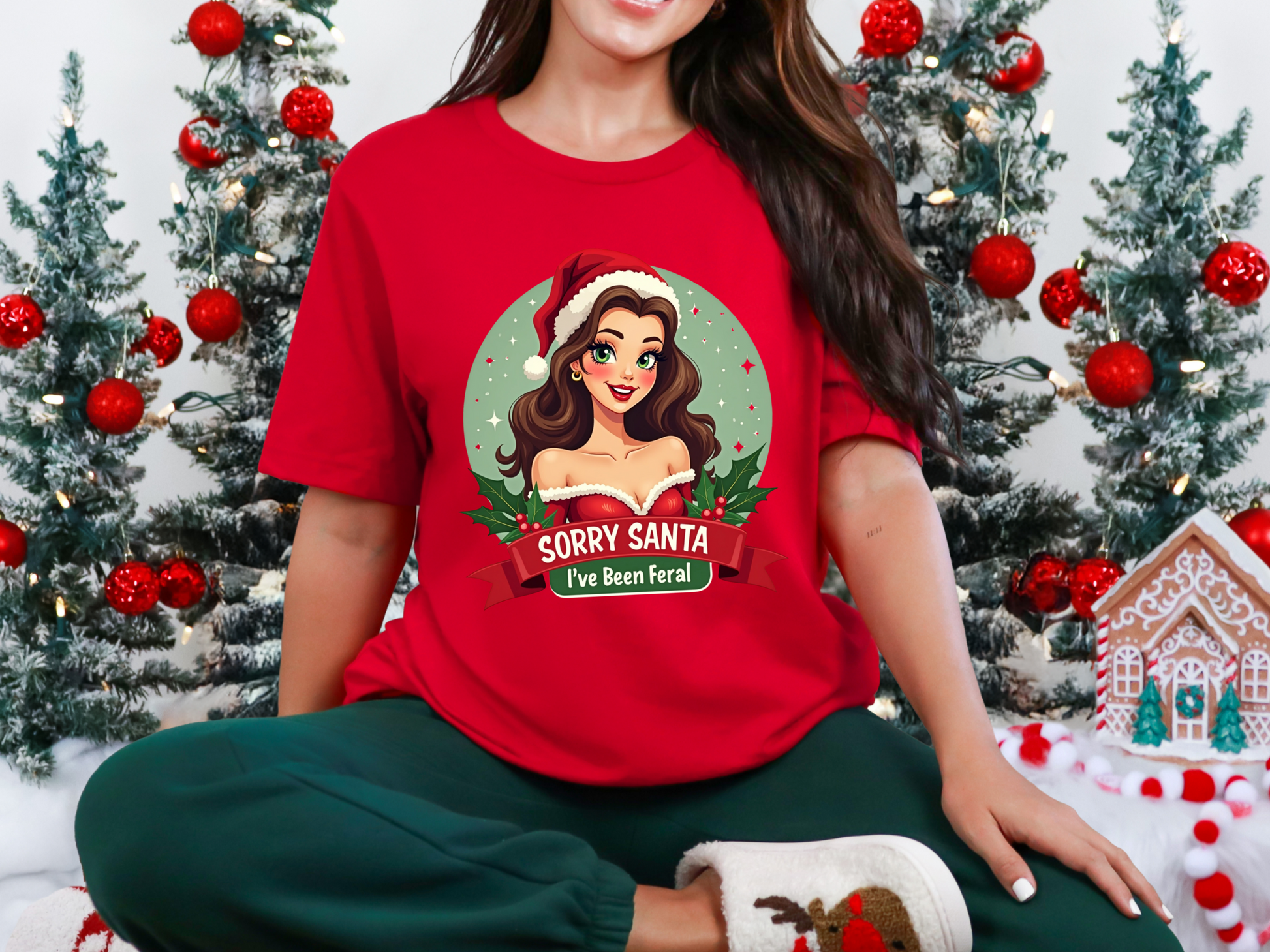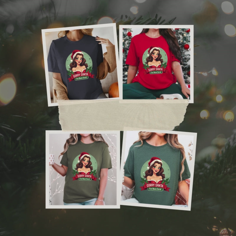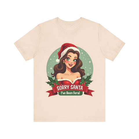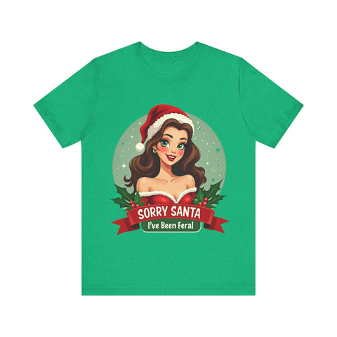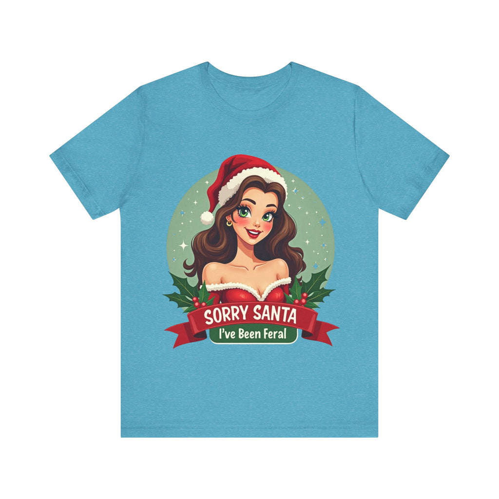 Unleash your inner holiday rebel with our "Sorry Santa I've Been Feral" Christmas T-Shirt! This sassy tee stars a coquette pinup girl lounging with a flirty smirk, sporting a Santa hat tipped just so. The design pops like a champagne cork, shouting, “I’m festive, but I’m running wild!”. Crafted from buttery-soft cotton that’s cozier than a stolen holiday cookie, this unisex shirt (sizes S-3XL) is perfect for slaying the holiday party, dodging nosy relatives, or just serving looks while untangling Christmas lights. It’s the ultimate gift for your boldest bestie or a must-have to wear your naughty-list energy with a wink. Don’t let this tee slip into the North Pole’s lost-and-found! Snag it now and rock the season with feral fabulousness.