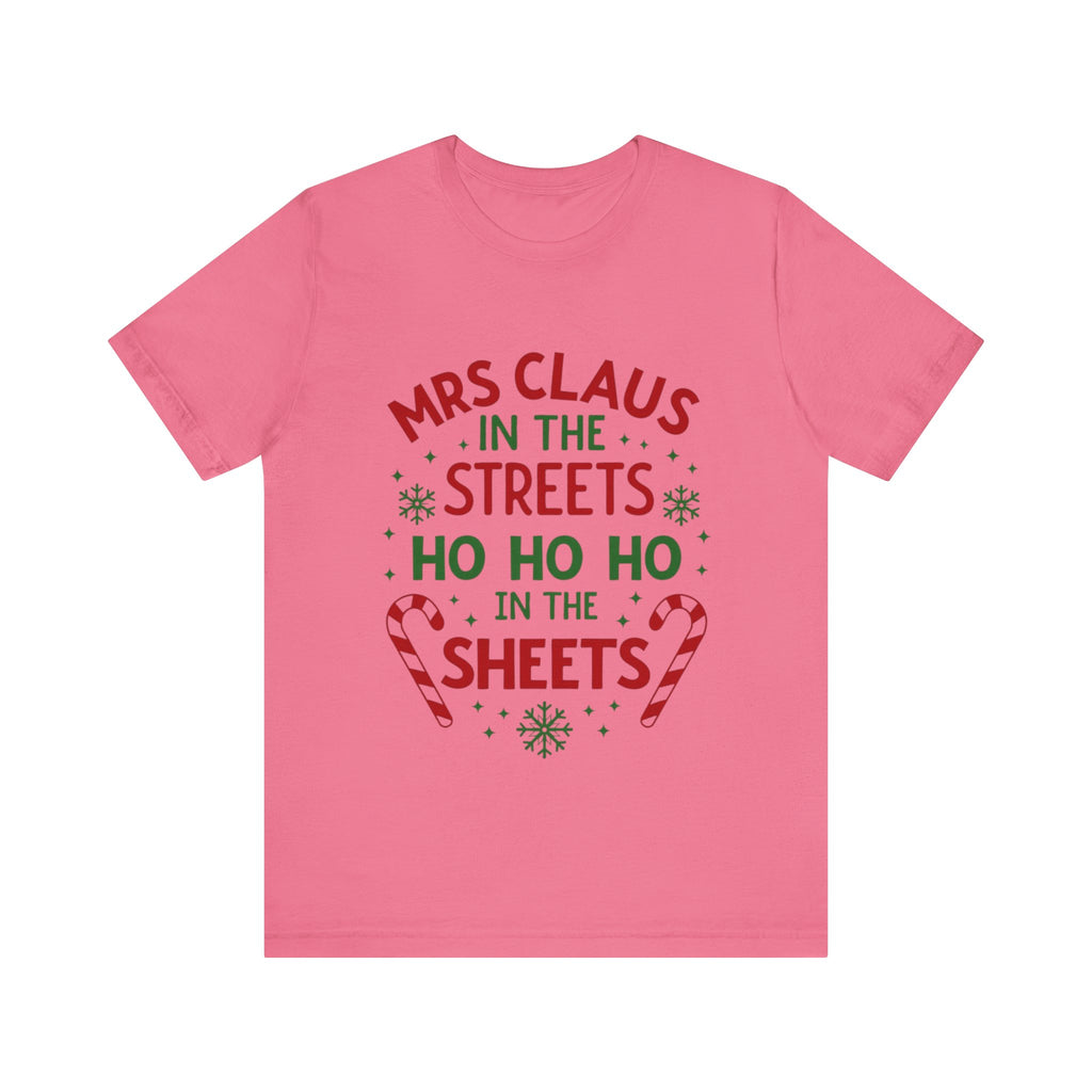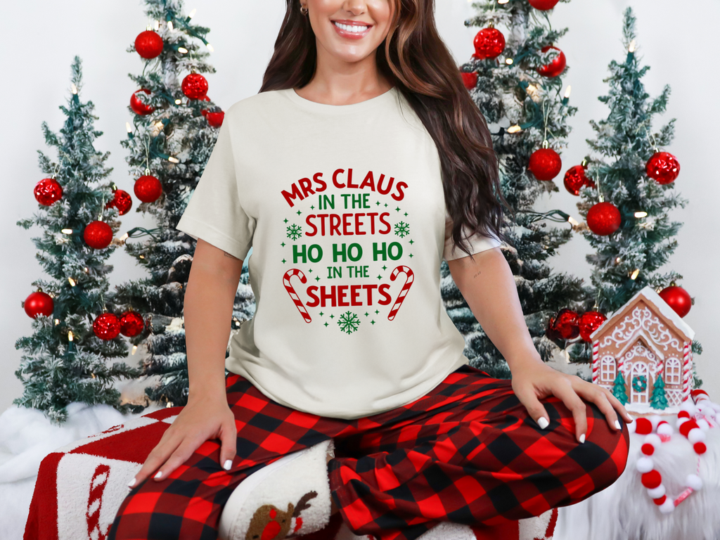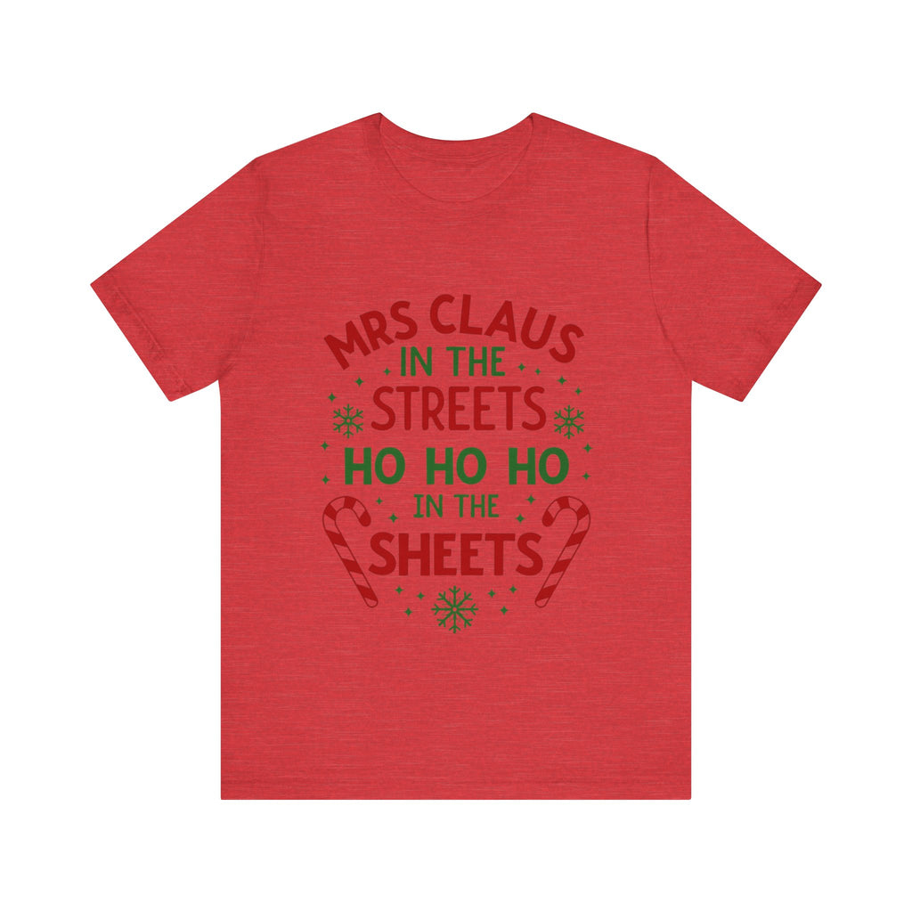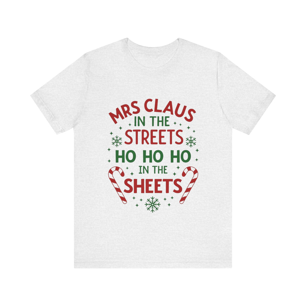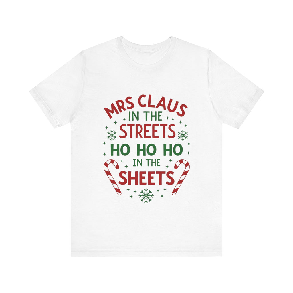 Oh, sugar, this sarcastic "Mrs. Claus in the Streets, Ho Ho Ho in the Sheets" Christmas T-Shirt is serving naughty-and-nice vibes with a festive wink! Draped in playful Christmas elements, this tee is your go-to for strutting through holiday markets or turning up the heat by the fireside. Crafted from whisper-soft fabric that’s comfier than a sleigh ride snuggle, it’s perfect for sipping hot cocoa with a smirk or dodging boring gift exchanges. Get ready to sleigh the season with a sassy, merry swagger that’ll have everyone jingling with envy! Snag this tee and let the world know you’re not afraid to show your naughty side!