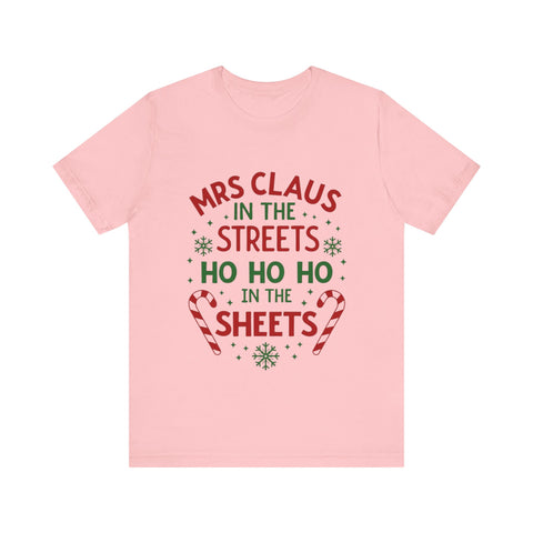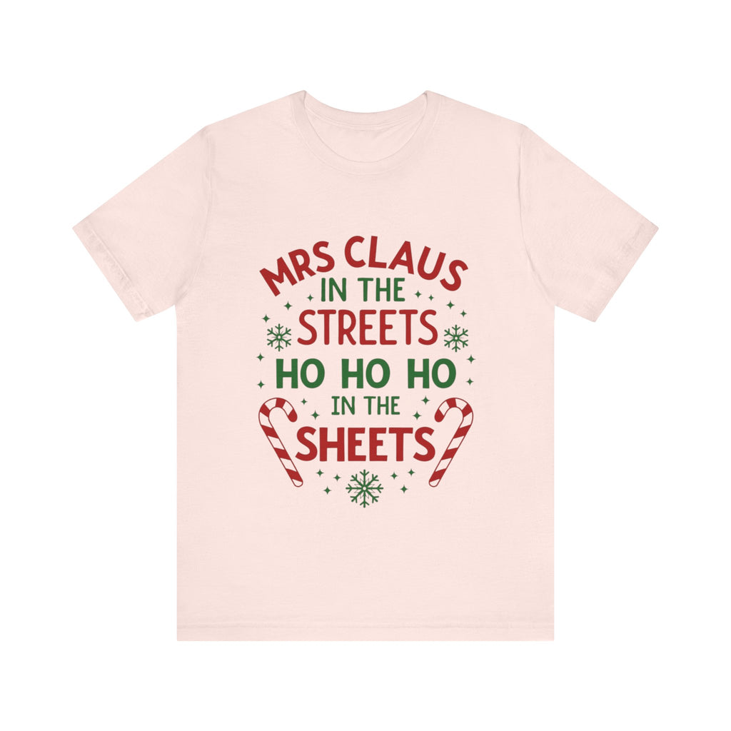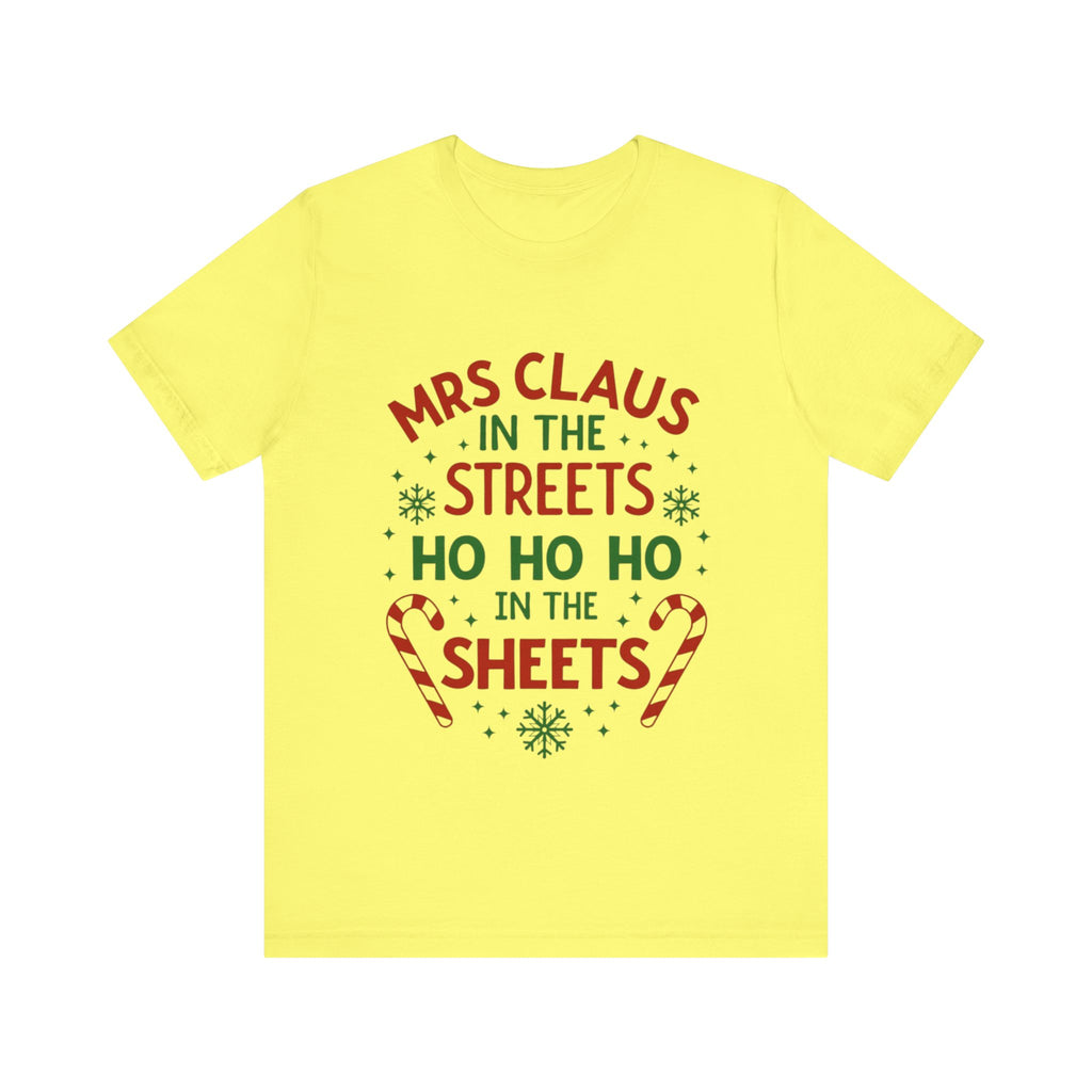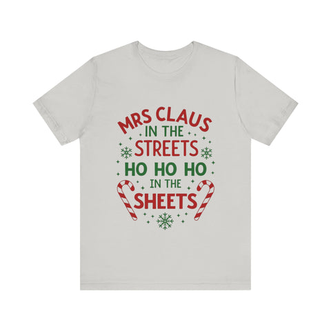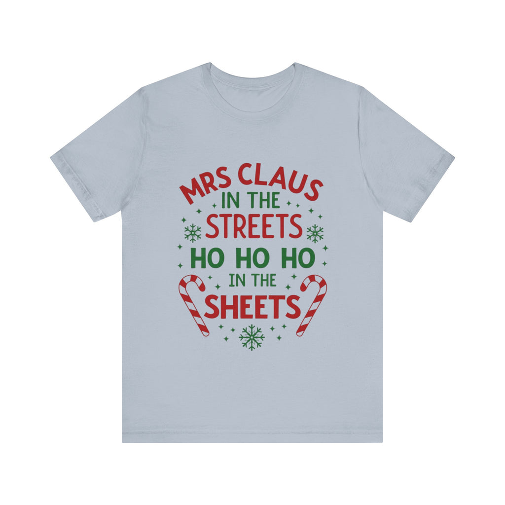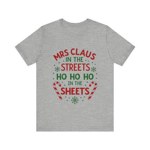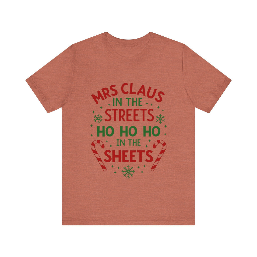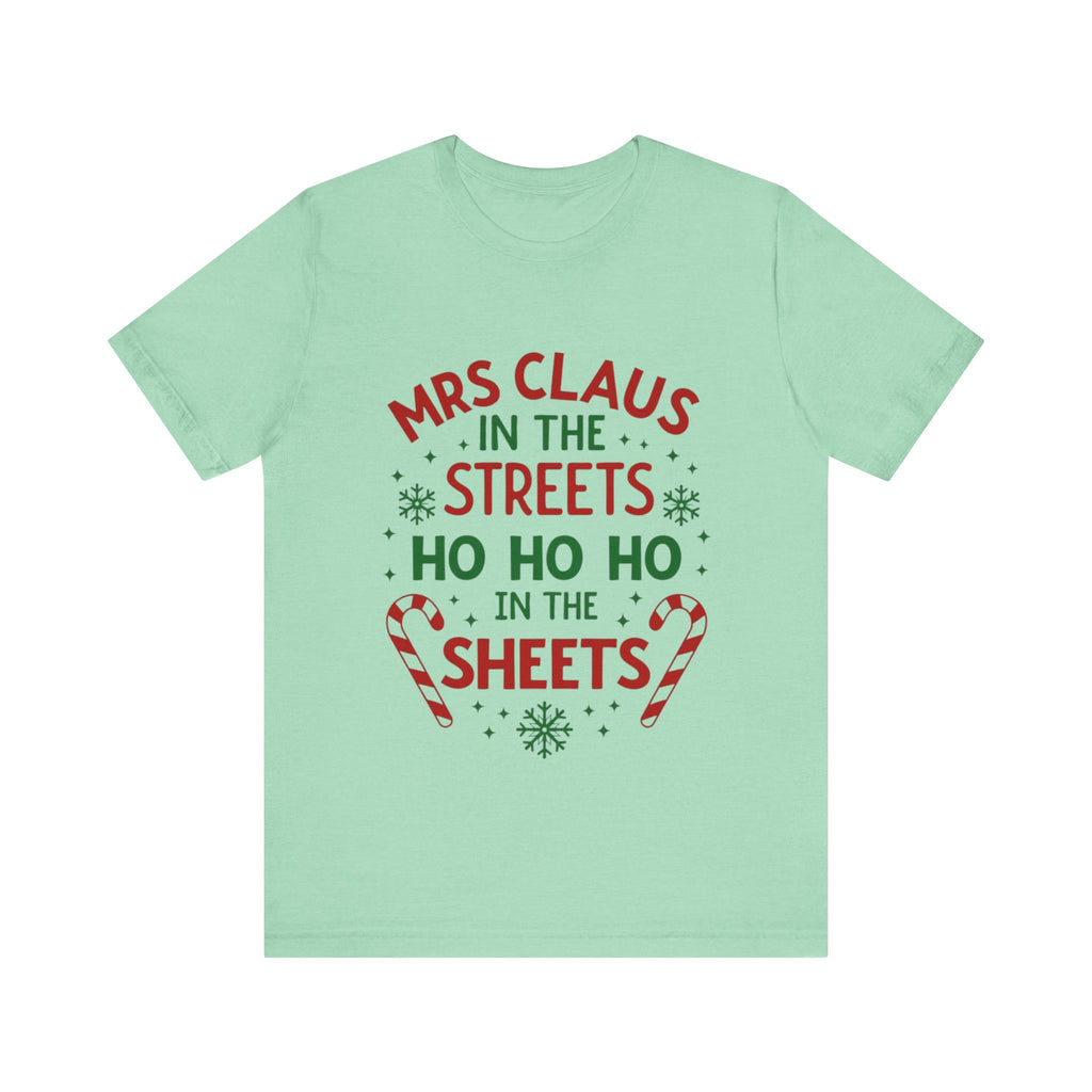 Oh, sugar, this sarcastic "Mrs. Claus in the Streets, Ho Ho Ho in the Sheets" Christmas T-Shirt is serving naughty-and-nice vibes with a festive wink! Draped in playful Christmas elements, this tee is your go-to for strutting through holiday markets or turning up the heat by the fireside. Crafted from whisper-soft fabric that’s comfier than a sleigh ride snuggle, it’s perfect for sipping hot cocoa with a smirk or dodging boring gift exchanges. Get ready to sleigh the season with a sassy, merry swagger that’ll have everyone jingling with envy! Snag this tee and let the world know you’re not afraid to show your naughty side!
