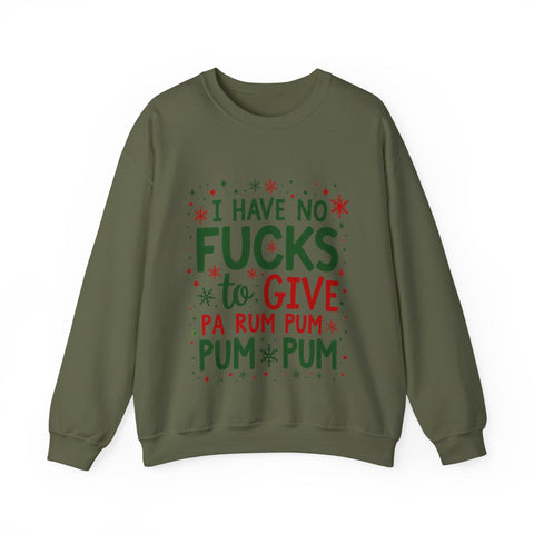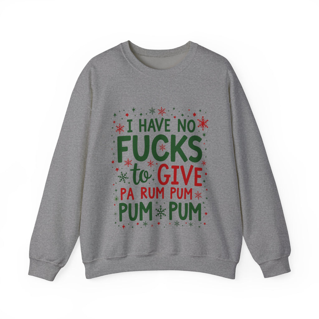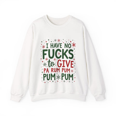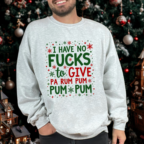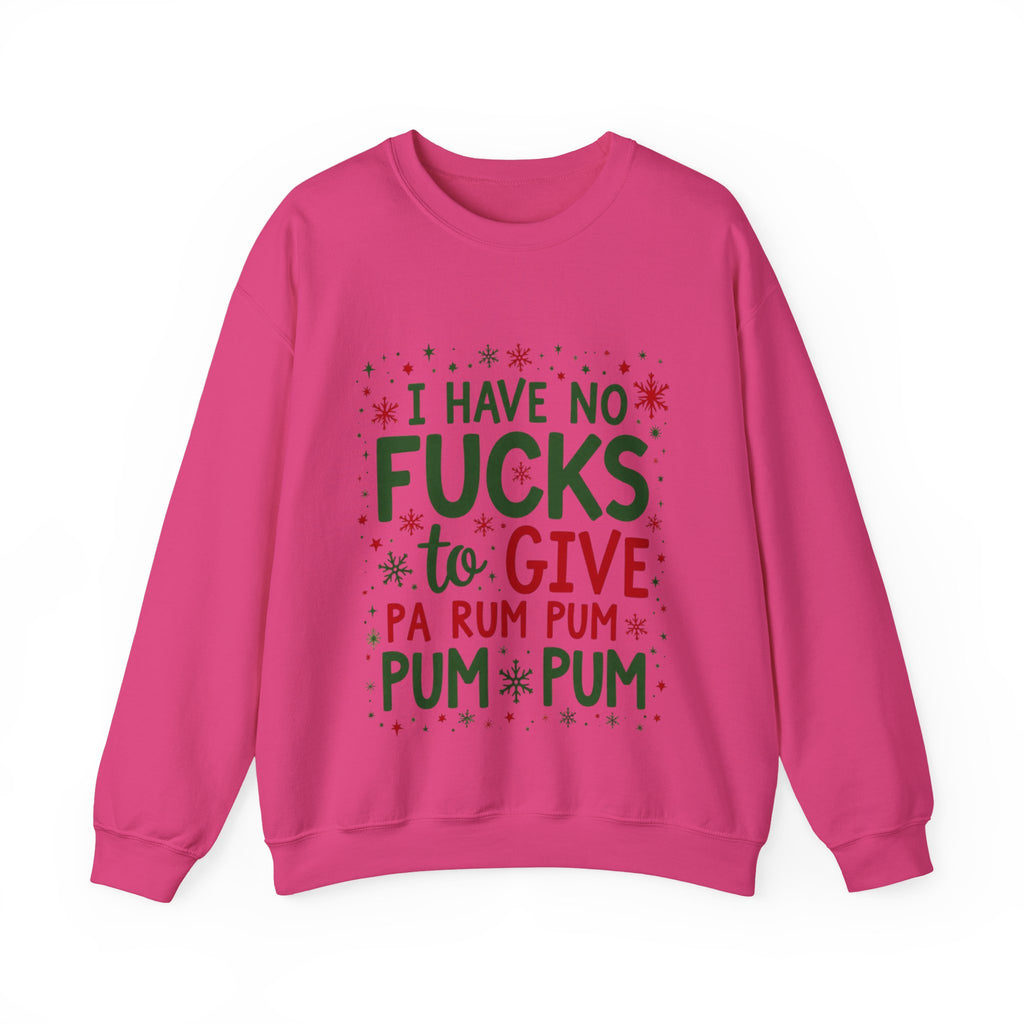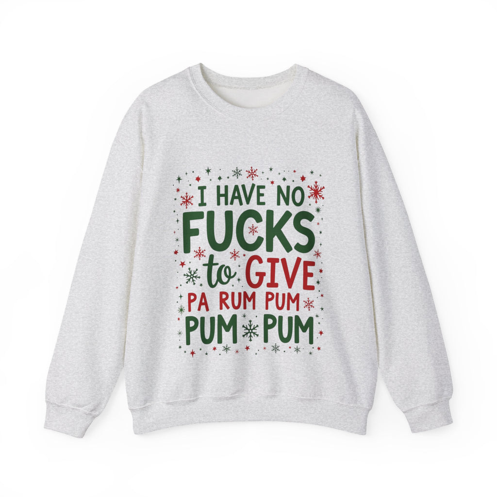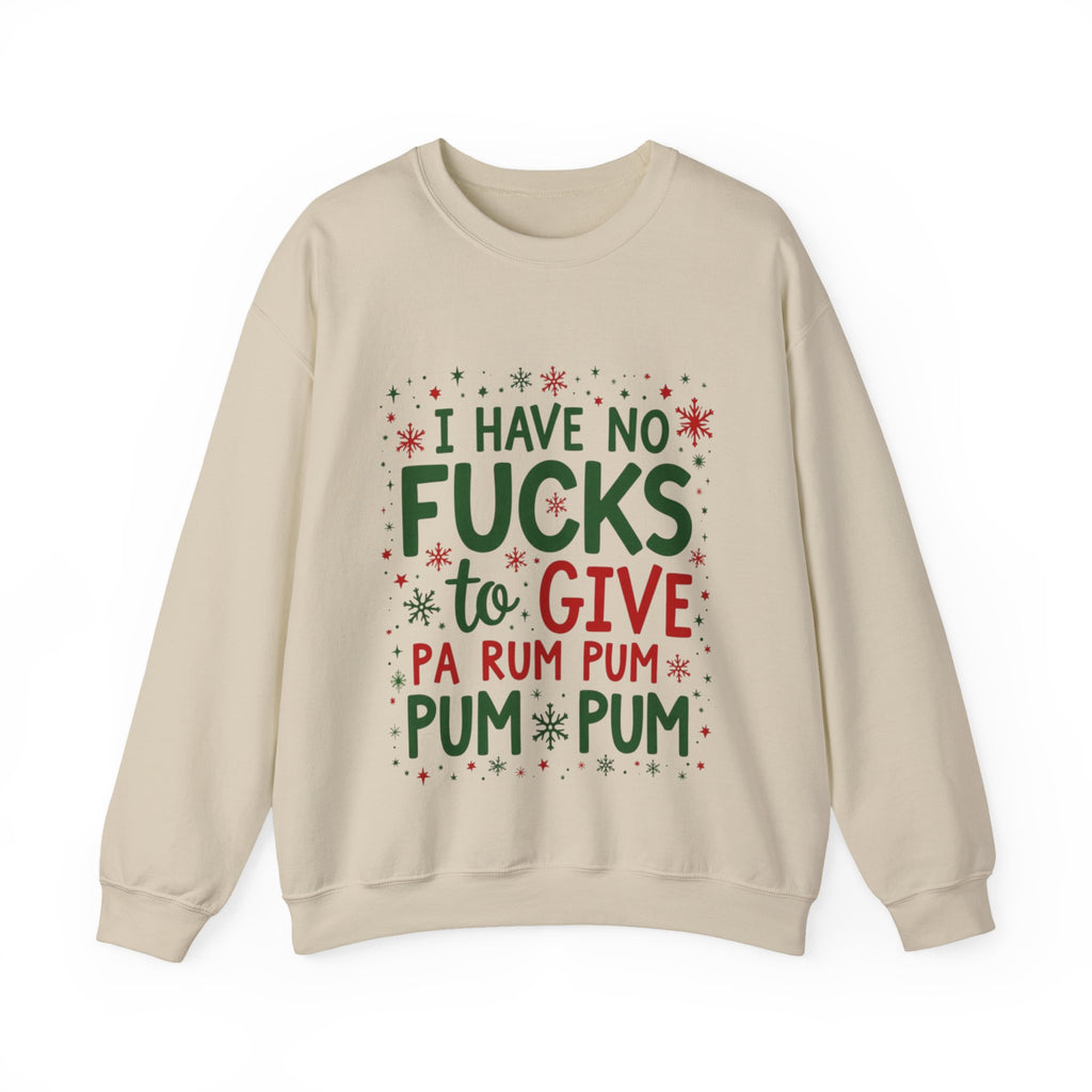 Drum up some holiday hilarity with this delightfully naughty Christmas sweater! Rocking the sassy phrase "I Have No Fucks To Give Pa Rum Pum Pum Pum", this shirt is your go-to for serving zero-chill vibes with a festive beat. Perfect for dodging holiday stress, sipping spiked eggnog, or stealing the spotlight at every Christmas bash. Soft, cozy and loaded with sarcastic swagger, this sweatshirt is ready to jingle all the way to the naughty list. Because who has time for holiday drama when you’re this fabulously unbothered? The ultimate grab for your boldest buddy or anyone who’d rather gift shade than sugarplums. Wear it, flaunt it, and let the festive sass ring out. 🥁🎅😎