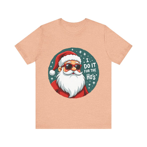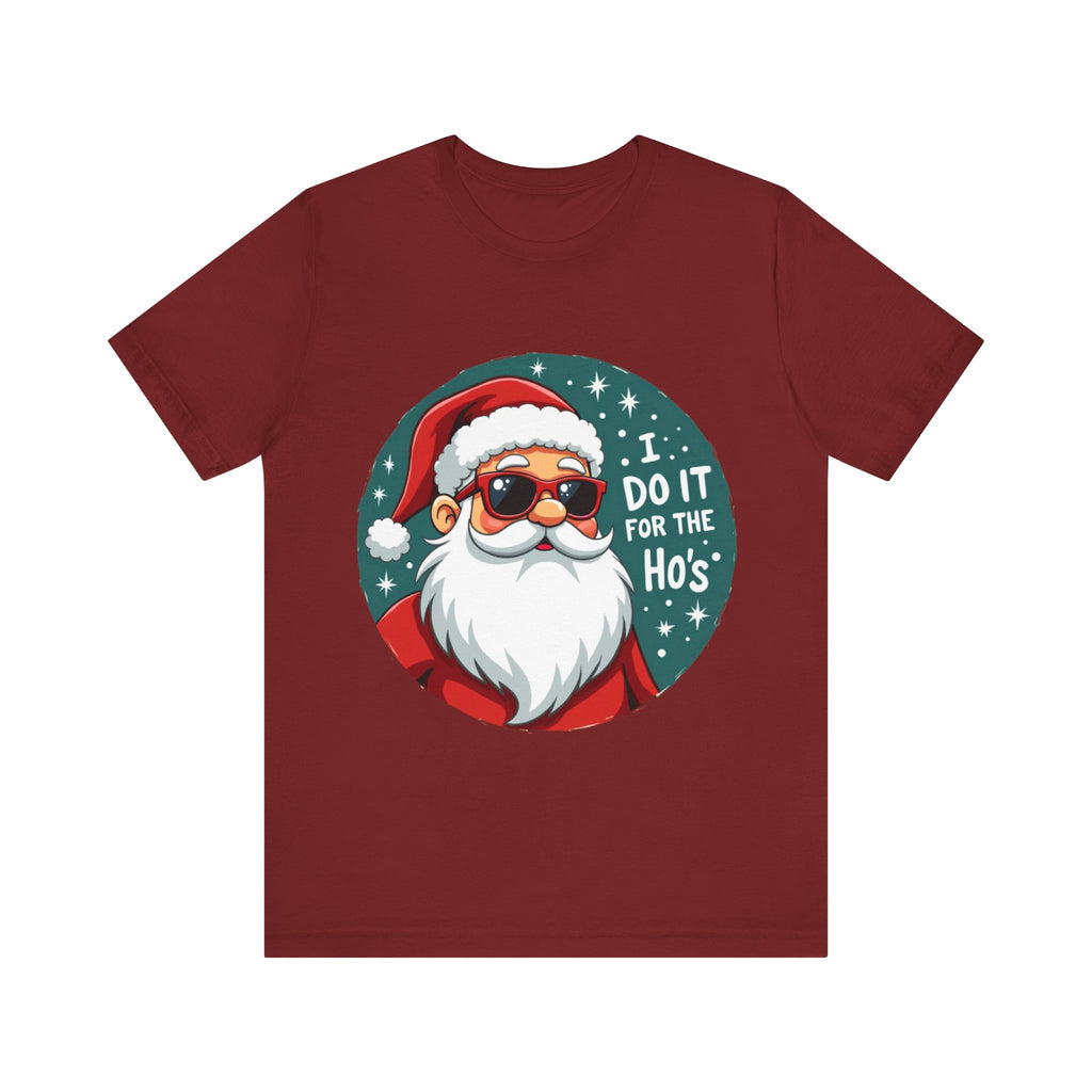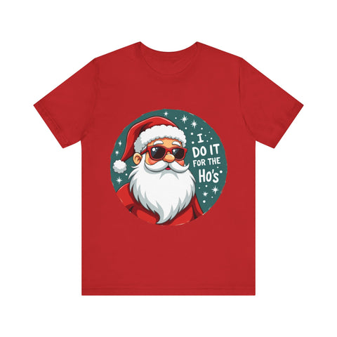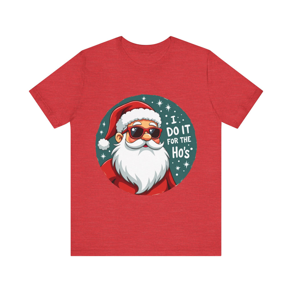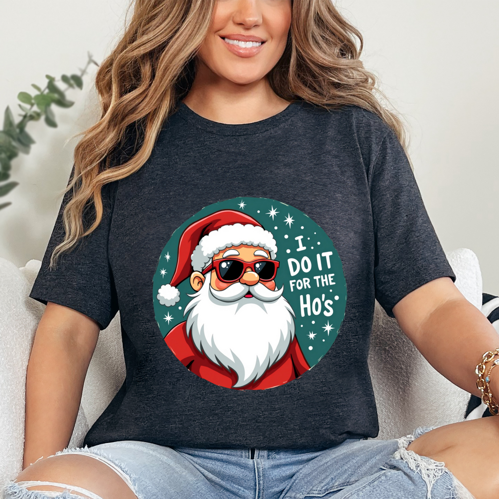 Sleigh the holiday game with our "I Do It For The Ho's" Christmas T-Shirt, the ultimate sarcastic flex for festive rebels! This tee features a snarky Santa with a smirk, wearing his sunglasses at night, with a vibe that says, “I’m only here for the laughs and the eggnog”. The bold, cheeky tagline pops in bright white, flanked by a sassy snowflake or two. Crafted from buttery-soft cotton that’s comfier than Santa’s beard, this unisex shirt (sizes S-3XL) is perfect for roasting chestnuts, dodging holiday drama, or stealing the spotlight at the annual Christmas karaoke bash. It’s the ideal gift for your wittiest pal or a treat for yourself to wear your holiday hustle with zero chill. Don’t let this tee fly off the sleigh! Snag it now and rock the season with a naughty nod to Santa’s hustle.