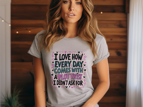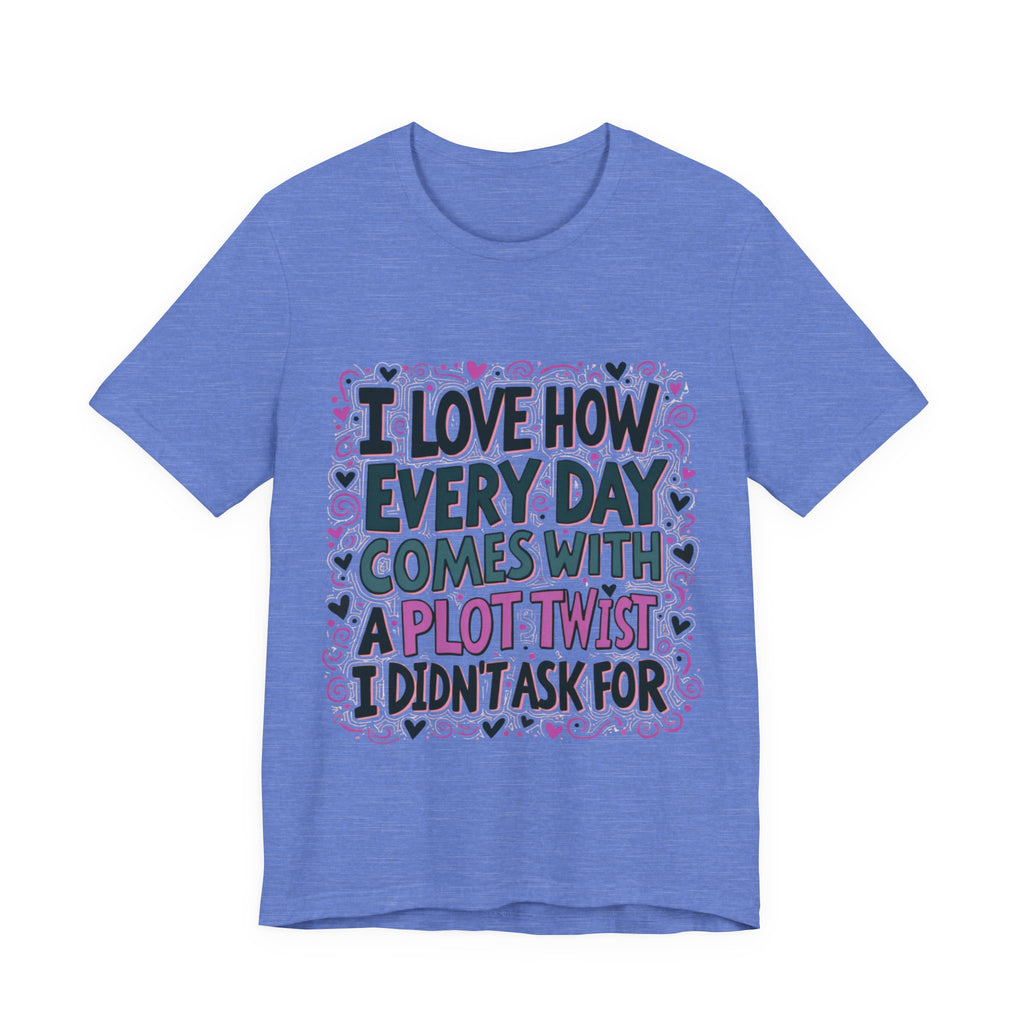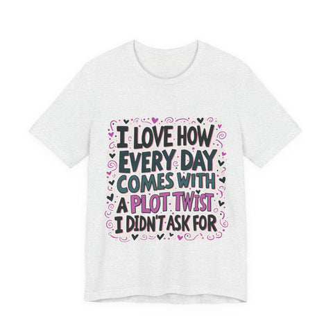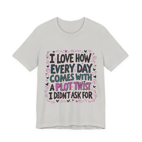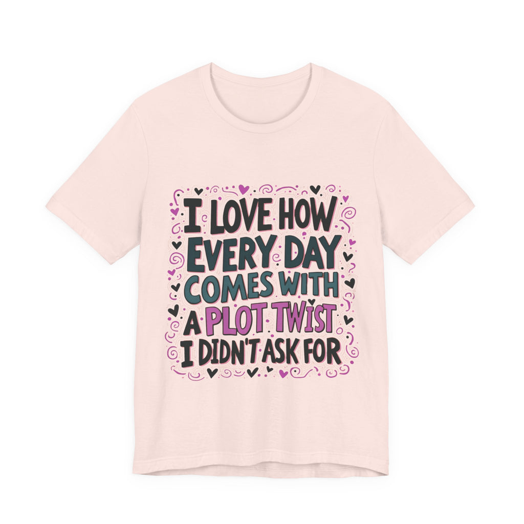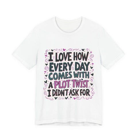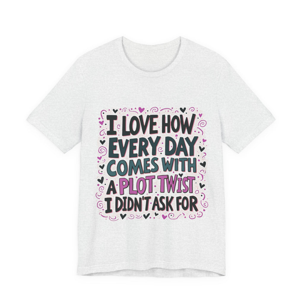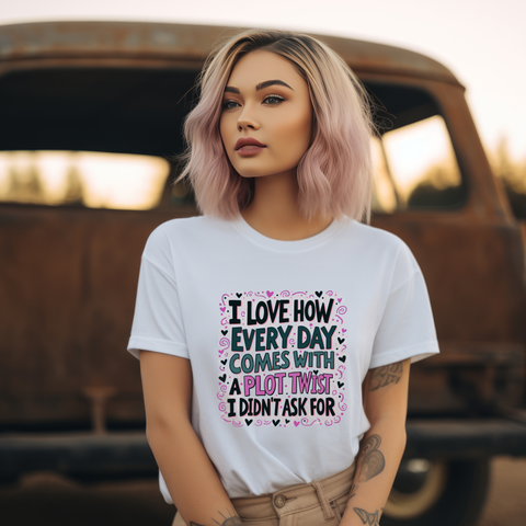 Brace yourself for life’s wild script with our "I Love How Every Day Comes With a Plot Twist I Didn’t Ask For" T-Shirt! This tee is a sweet middle finger to the universe’s chaos, decked out with playful hearts and nostalgic elements that scream, “I’m thriving, but also, why is my life a soap opera?”. The snarky text is your sarcastic love letter to those days when your coffee spills, your Wi-Fi dies, and your cat decides it’s auditioning for Villain of the Year. Crafted from whisper-soft, breezy airlume cotton, this shirt is as light and airy as your dreams of a drama-free day (lol, good luck). The adorable design paired with the biting wit makes it perfect for strutting through brunches, dodging curveballs at work, or just lounging while you roll your eyes at life’s latest plot twist. It’s comfy, it’s cute, and it’s got just enough sass to keep the bad vibes at bay. Don’t just survive the plot twists - wear them with style! Click “Add to Cart” and let this tee be your sarcastic sidekick for life’s wild ride. 💖