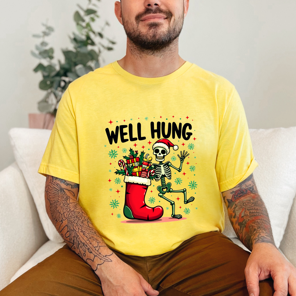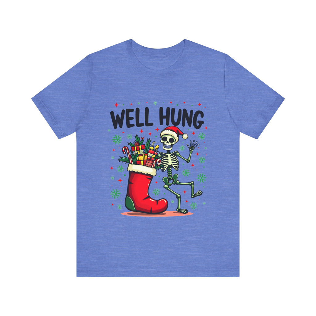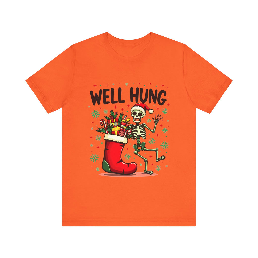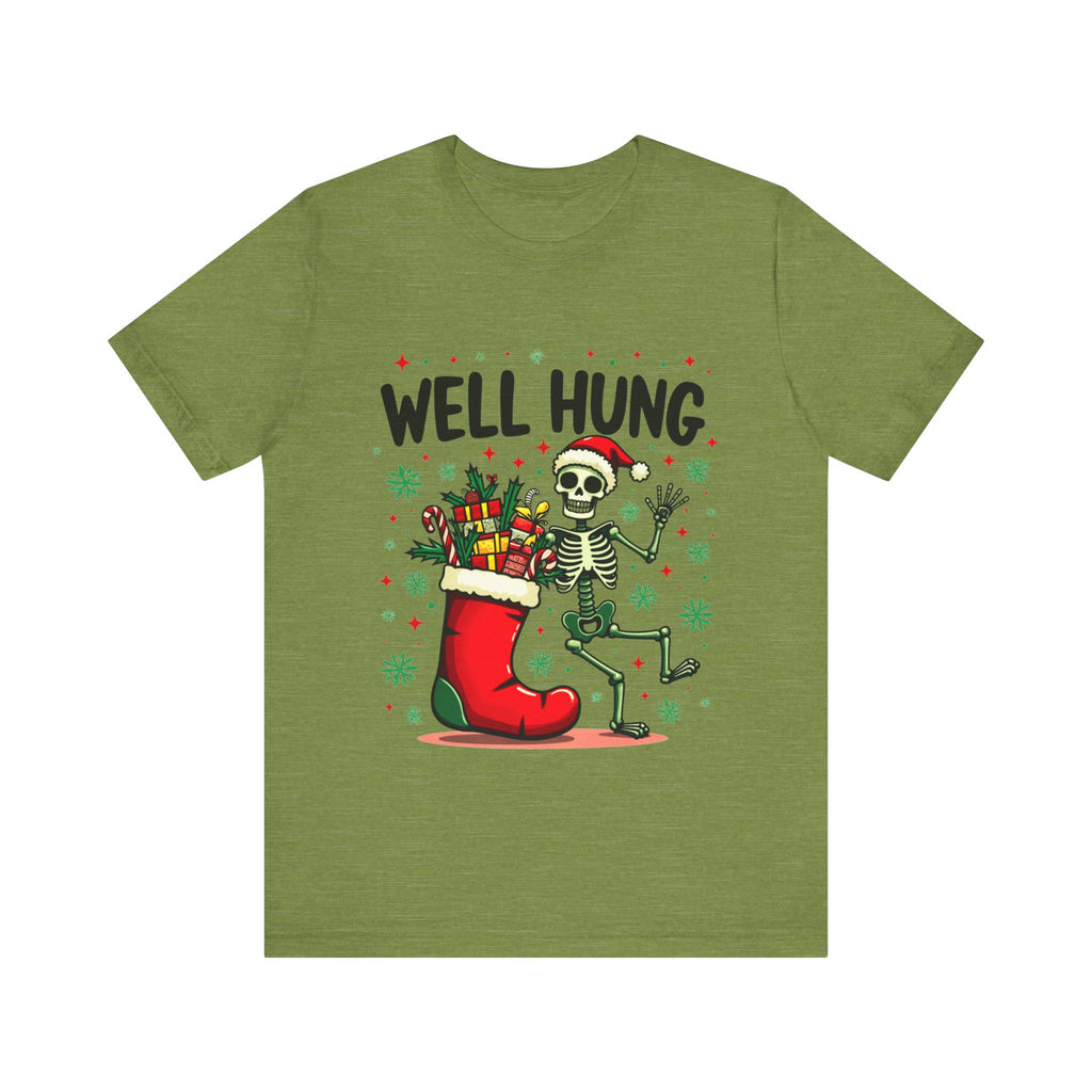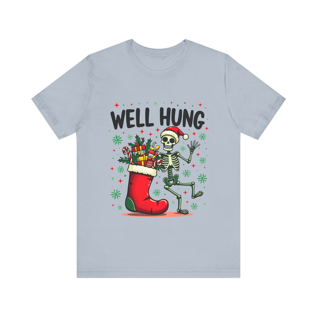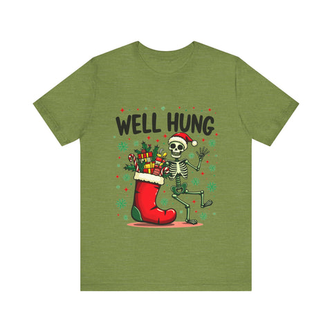 Deck the halls with a side of sass in this bone-tickling hilarious Christmas tee! Featuring a cute skeleton grinning mischievously while holding a massive, gift-stuffed stocking and the cheeky phrase "Well Hung", this shirt is your holiday must-have for serving looks and laughs. Perfect for sipping spiked cocoa, dodging mistletoe, or stealing the show at every festive gathering. Soft, breezy, and packed with playful snark, this tee is ready to jingle all the way to the naughty list. This skeleton’s got more holiday swagger than Santa’s whole sleigh! The perfect pick for your wittiest pal or anyone who loves their Christmas with a twist. Wear it, flaunt it, and let the festive giggles roll. 🎅💀🎁