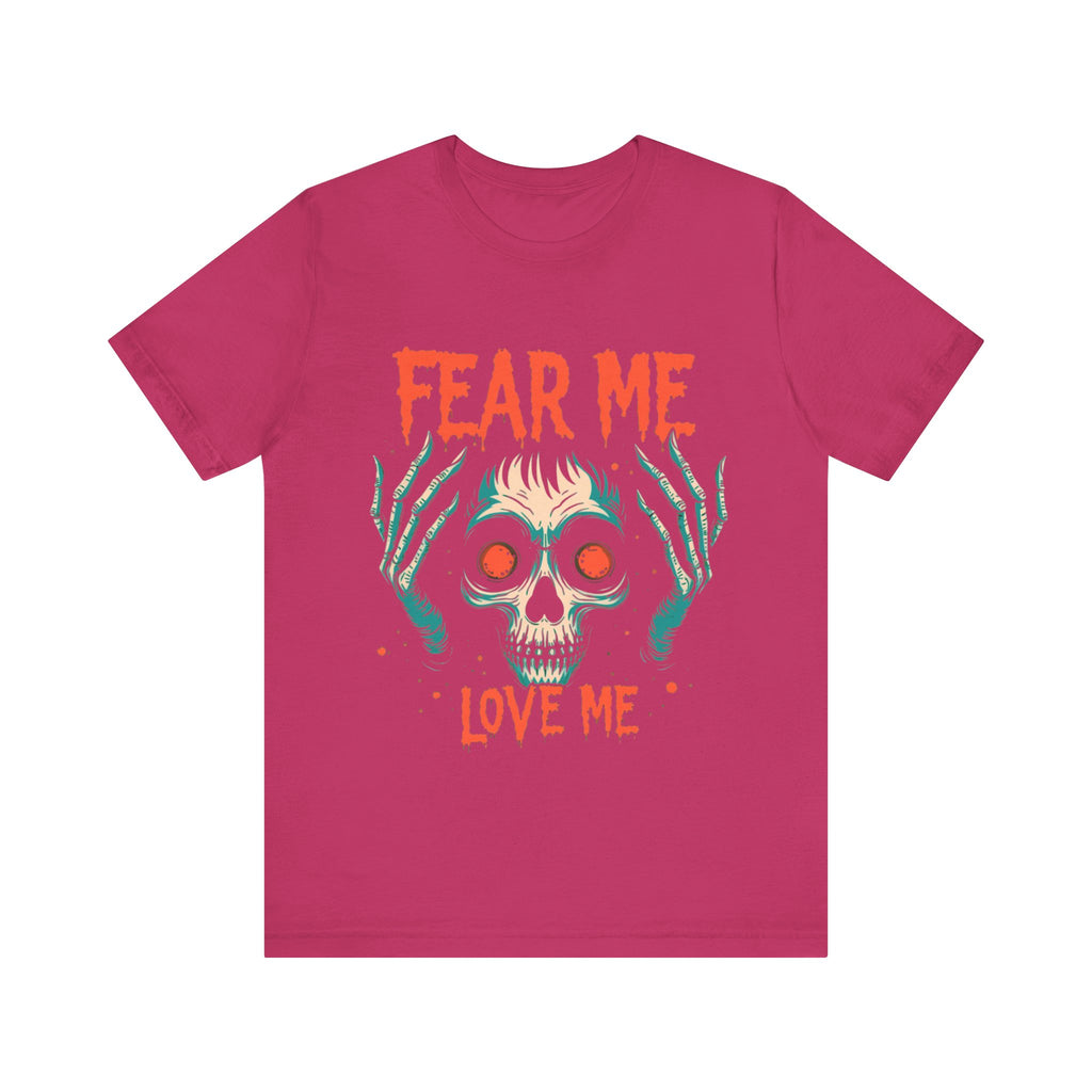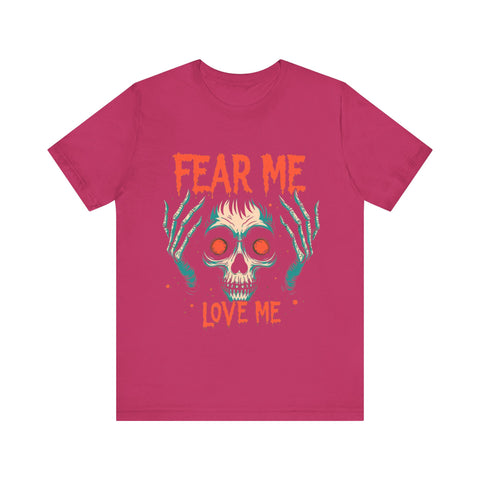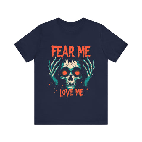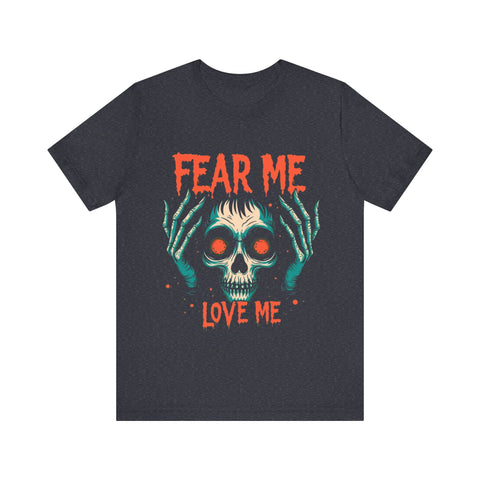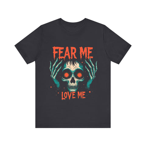 Unleash your inner ghoul with our "Fear Me, Love Me" Skull T-Shirt! This wickedly fun and delightfully creepy tee features a bold skeleton graphic, striking a fierce pose with the sassy caption "Fear Me, Love Me" in a chilling font. Perfect for Halloween, spooky season shenanigans, or year-round edgy style, this shirt is your go-to for turning heads and raising spirits! Crafted from super-soft, high-quality cotton, this unisex t-shirt offers a comfy fit that’s ideal for casual outings, costume parties, or cozy nights binge-watching horror flicks. Available in sizes S–3XL, it’s designed to flatter every body type while keeping you looking hauntingly good. The durable print ensures your skeleton stays spooky through every wash. Grab yours now and highlight your spooky swagger 💀✨