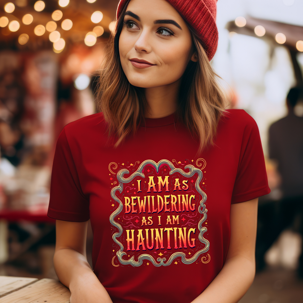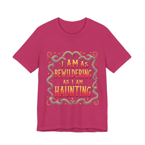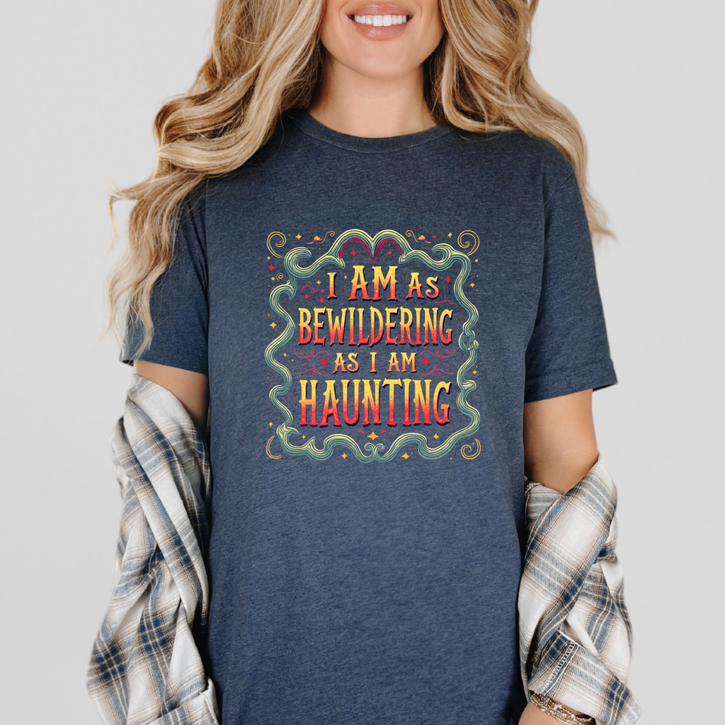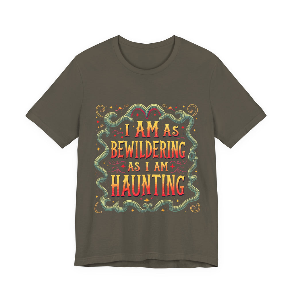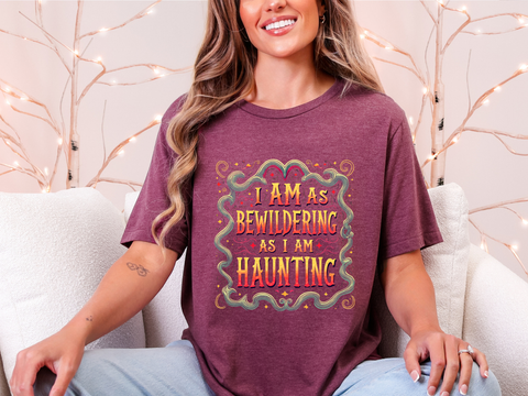 Unravel the enigma of your soul with our "I Am as Bewildering as I Am Haunting" T-Shirt, a sultry, celestial masterpiece that captivates like a spell cast under a velvet sky. Delicate star and celestial elements shimmer across the fabric, while the evocative gothic style text weaves a tale of mystery and charm. This tee is your ethereal armor, embracing the duality of being both mesmerizingly perplexing and hauntingly unforgettable. Crafted from velvety-soft airlume cotton, this shirt drapes you in airy elegance, as weightless as a whisper from the cosmos. Perfect for moonlit prayers, sultry evenings sipping moon milk, or simply casting your bewitching aura in everyday moments, the minimalist celestial design and poetic words make this tee a must-have for those who dance between the stars and shadows. Click “Add to Cart” and wear this celestial tee with enchanting grace. 🌟✨
