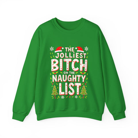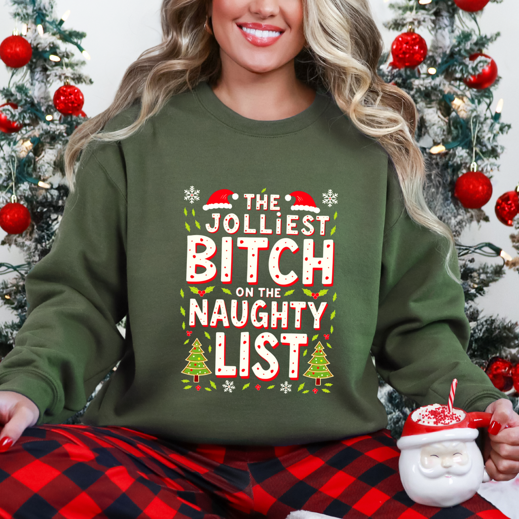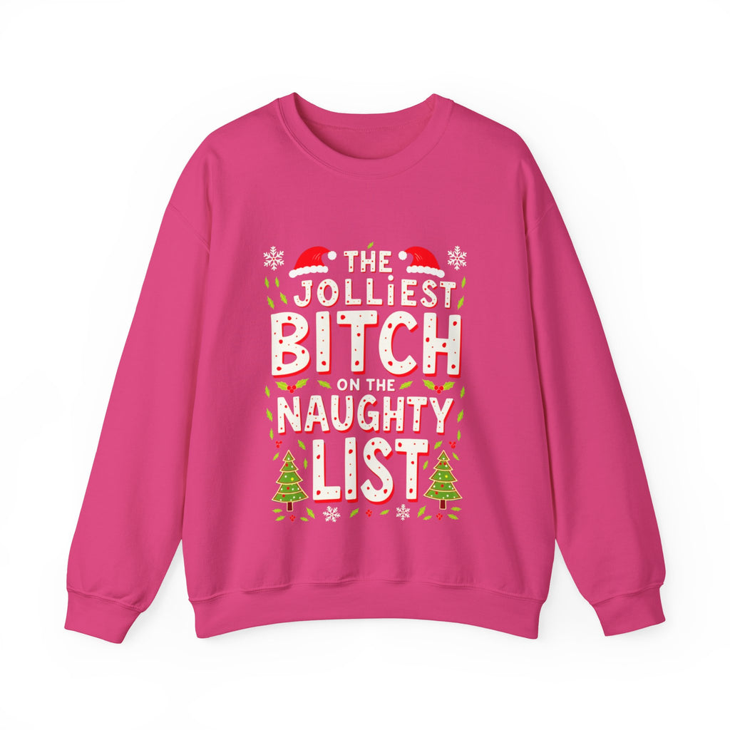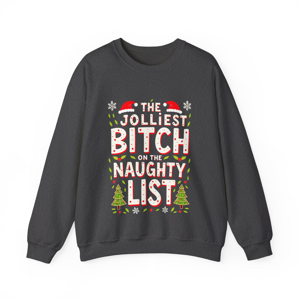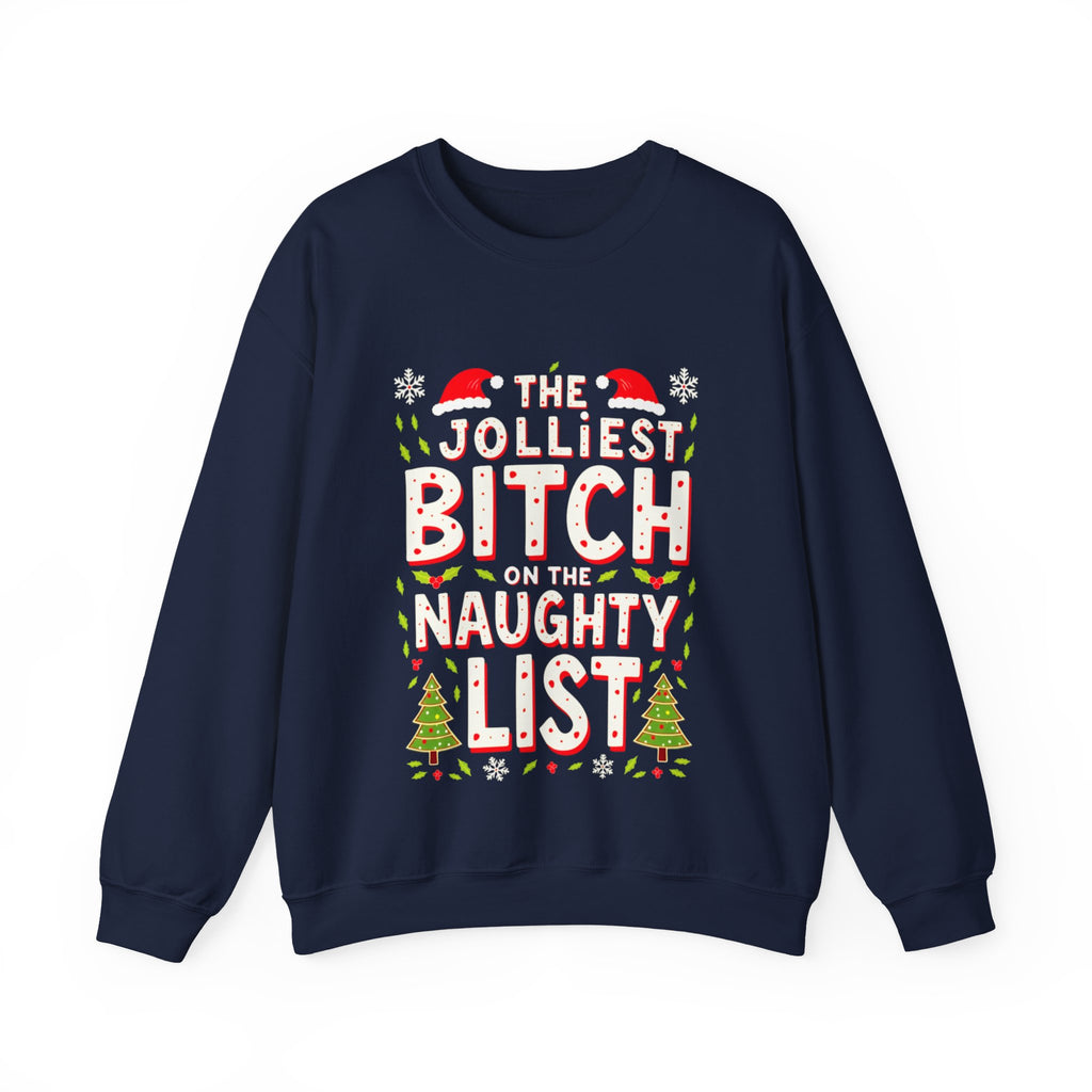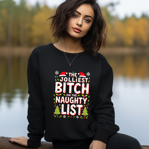 Light up the holiday season with a wicked grin in our "Jolliest Bit*h on the Naughty List" sarcastic Christmas Sweatshirt! This sassy masterpiece is for those who’ve earned their spot on Santa’s blacklist but still plan to steal the show at every festive shindig. With its snarky tagline in dazzling, christmas inspired print surrounded by fun elements, this sweater screams, “I’m the merriest menace you’ll ever meet!”. Made from a super soft cotton-poly blend that feels like a cozy fireside nap, it’s perfect for sipping spiked eggnog, dodging carolers, or serving looks at the office holiday bash. Available in sizes S-3XL, this unisex gem is the ultimate gift for your favorite troublemaker or a cheeky treat for yourself to wear your naughty crown with pride. Don’t let this sweatshirt jingle away! Grab it now and rock the holidays with unmatched sass.