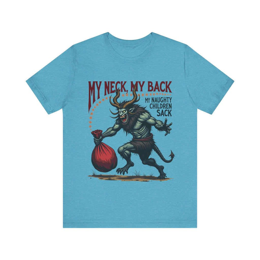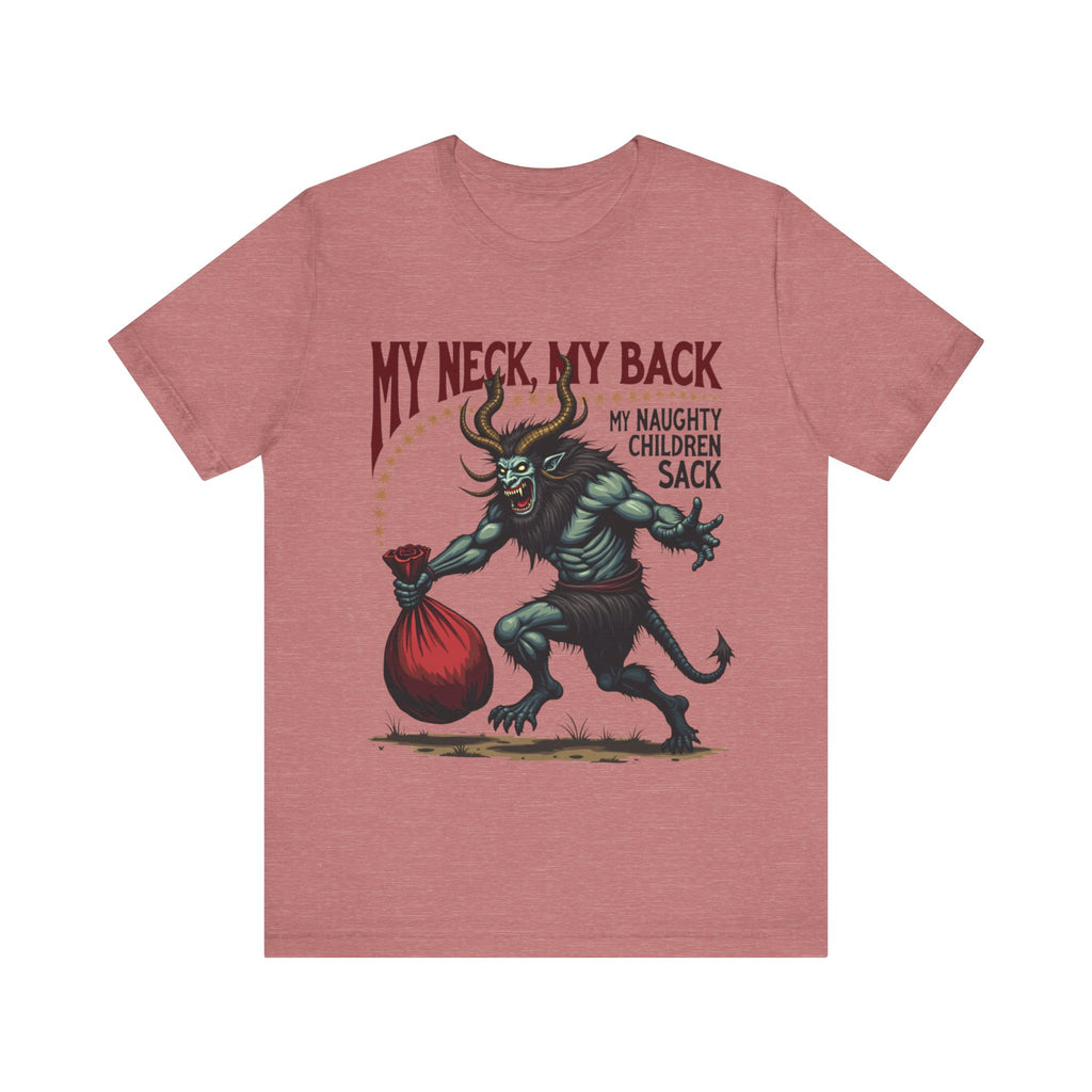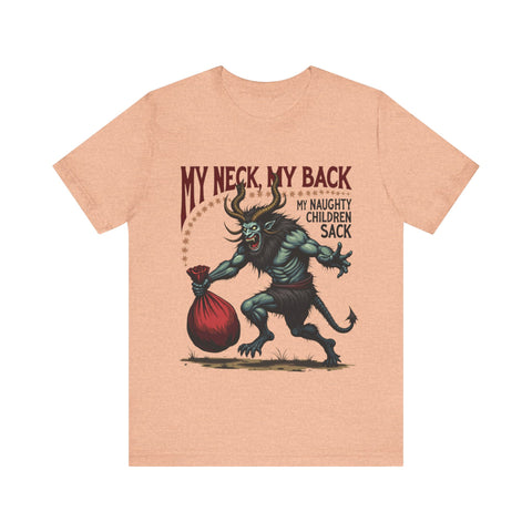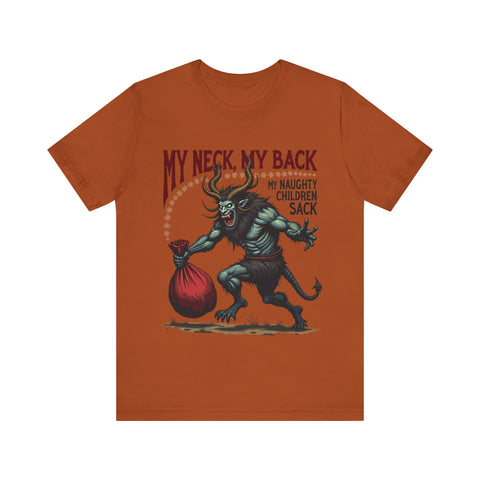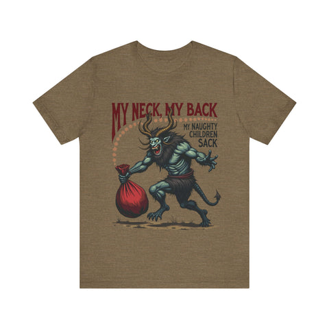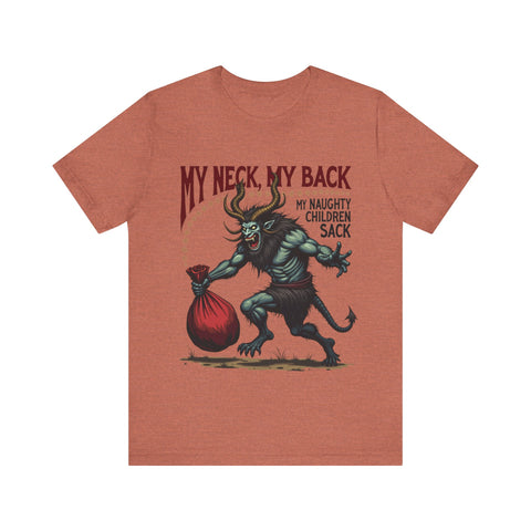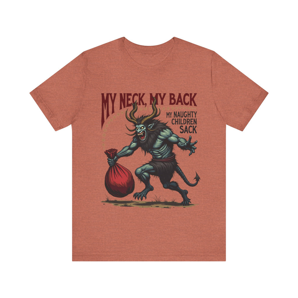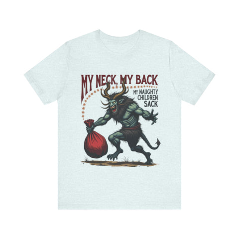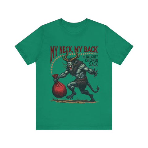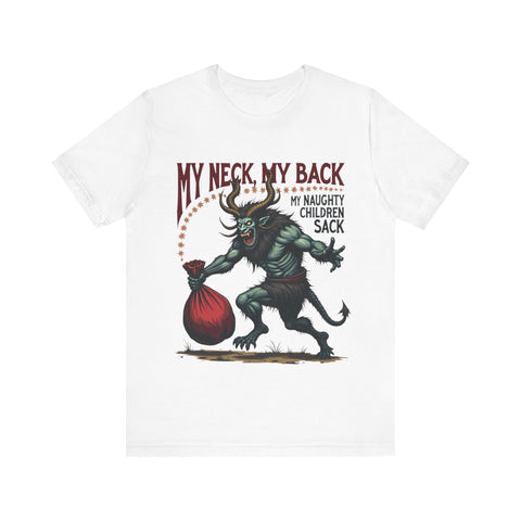 Get ready to jingle all the way to the naughty list with this hilariously wicked Christmas tee! Featuring a devilishly haunting Krampus dragging a sack stuffed with mischief-makers and the bold sarcastic phrase "My Neck, My Back, My Naughty Children Sack", this t-shirt is your ticket to holiday hilarity. Perfect for sipping hot cocoa with a side of shade or strutting into that Christmas party like the bad elf you are. Soft, breezy, and packed with sass, this tee is ready to sleigh the season. It’s Krampus-approved chaos that screams “I’m here for the holiday drama!”. Don’t let this Krampus gem get dragged away! Wear it, flaunt it, and let the holiday shenanigans begin. 😈🎅