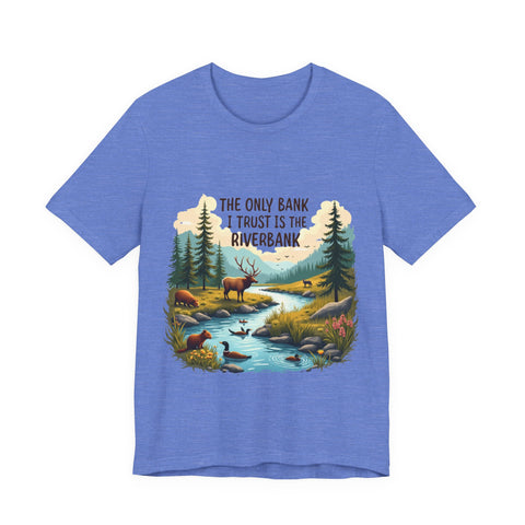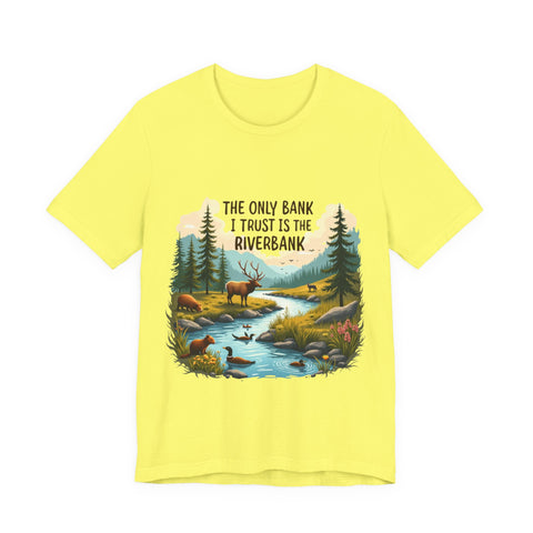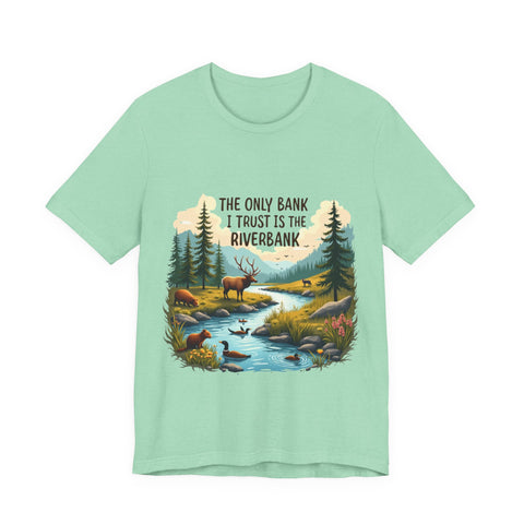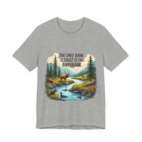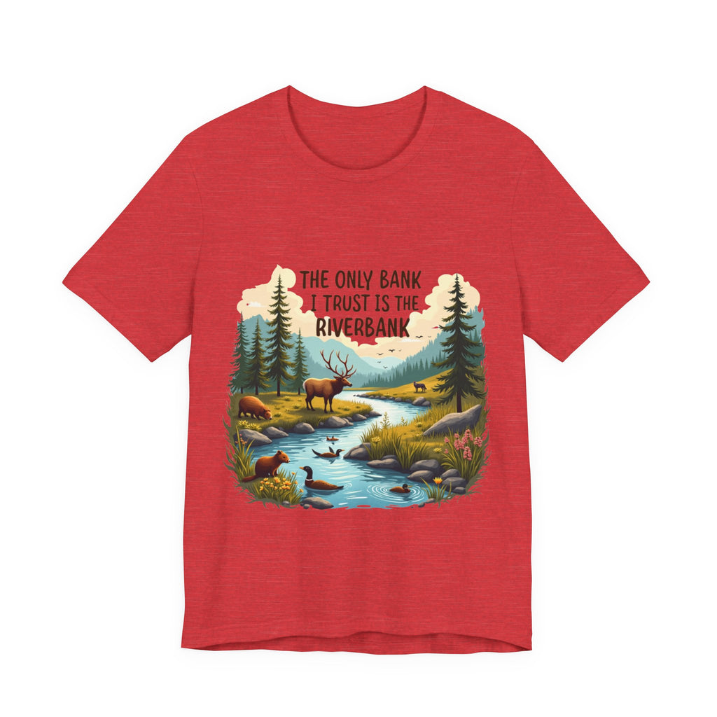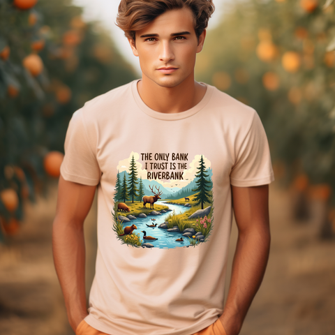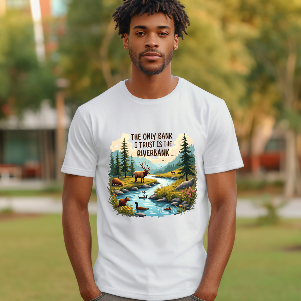 Ditch the suits and dive into the good life with our "Only Bank I Trust Is the Riverbank" T-Shirt, where a serene nature scene meets a sassy jab at the corporate grind! Picture lush trees, a babbling river, and a cheeky moose giving side-eye to your 401(k) - all paired with the snarky text that says, “I’d rather invest in a good nap by the water, but thanks”. This tee is your sarcastic ticket to nature’s VIP list, no credit check required. Crafted from cloud-light, ultra-soft airlume cotton, this shirt is as airy as a riverside breeze, keeping you comfy whether you’re dodging spreadsheets, sipping coffee by a campfire, or just vibing with the trees. The vibrant nature scene and witty text make it perfect for hiking trails, farmers’ markets, or telling your boss you’re “working remotely” from a hammock. It’s hilarious, it’s chill, it’s your new favorite way to stick it to the man! 🌳💦