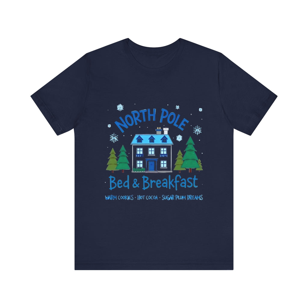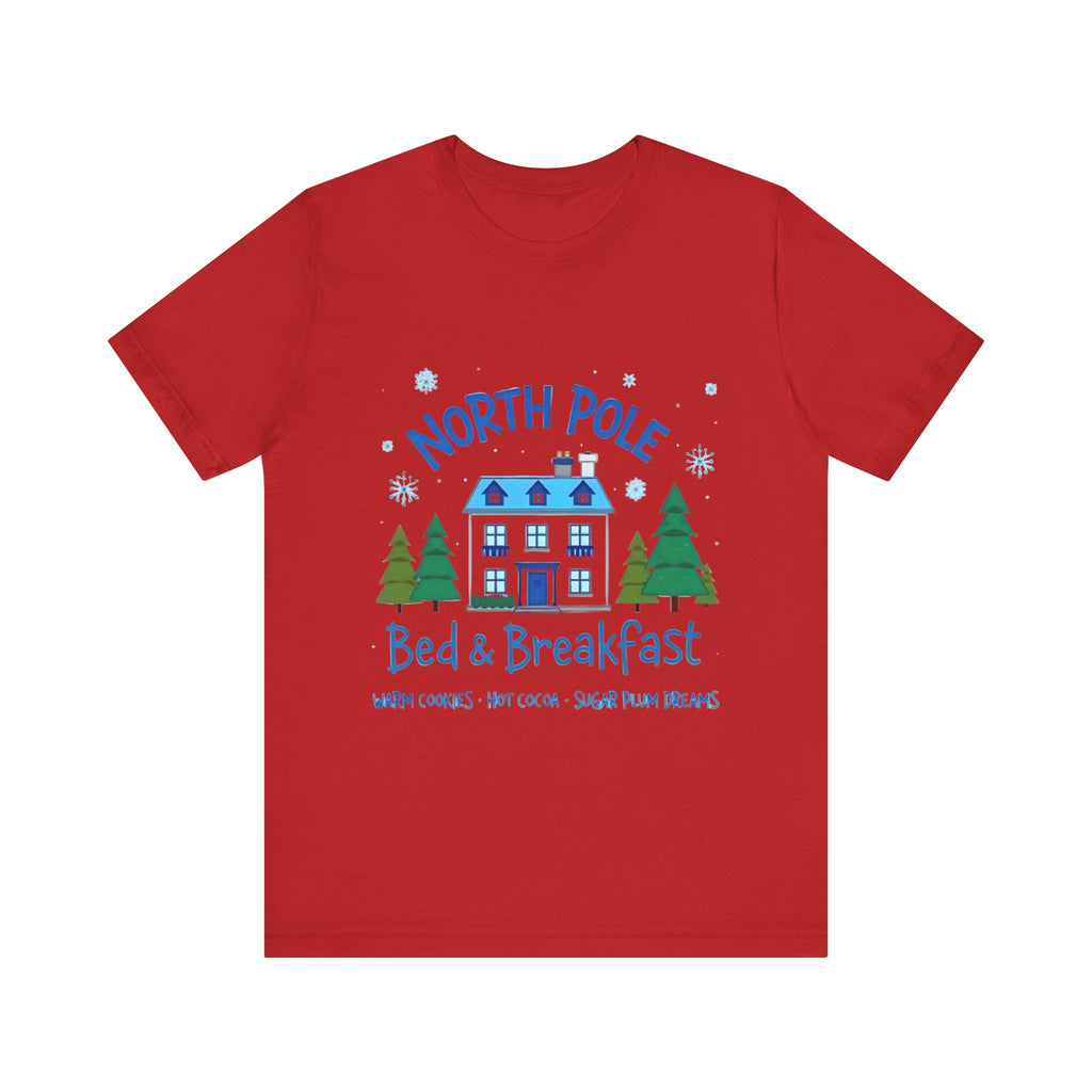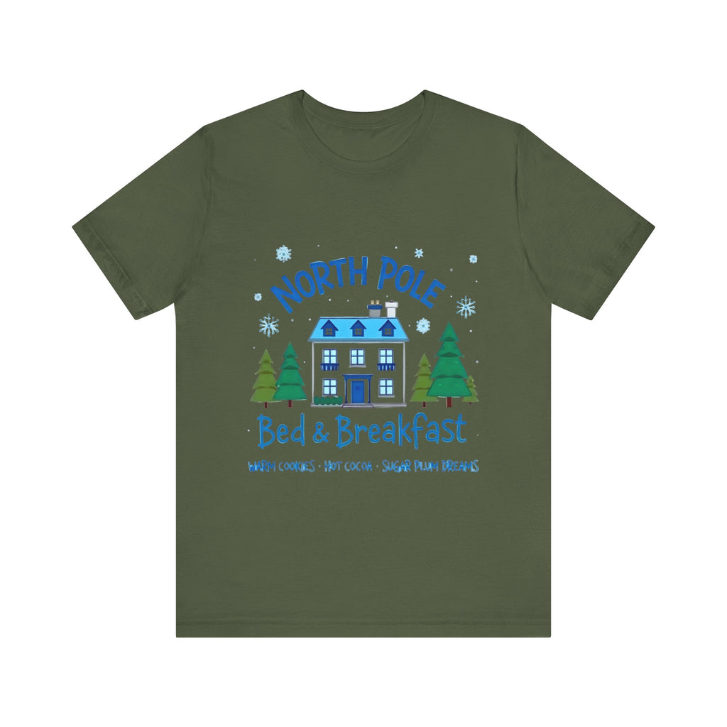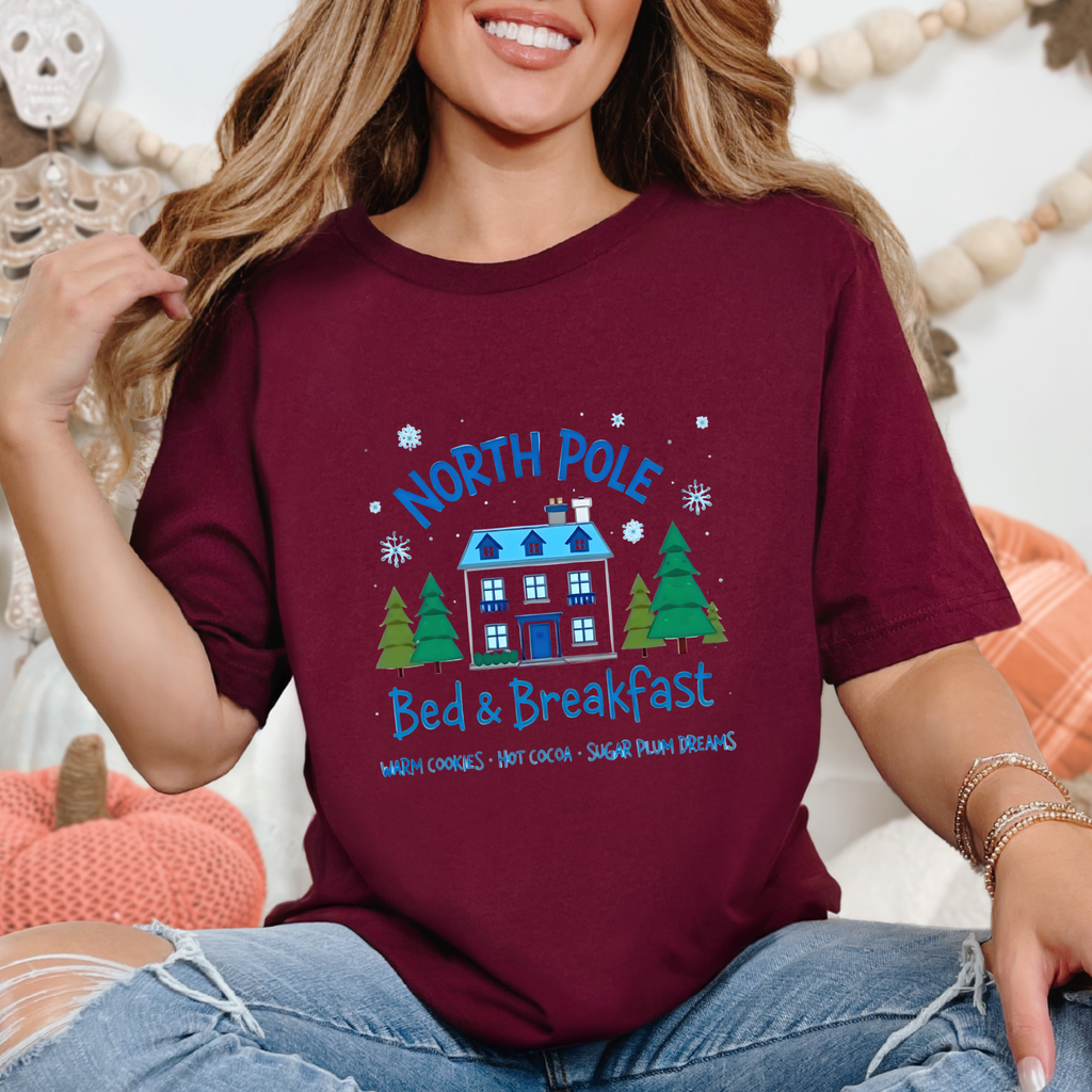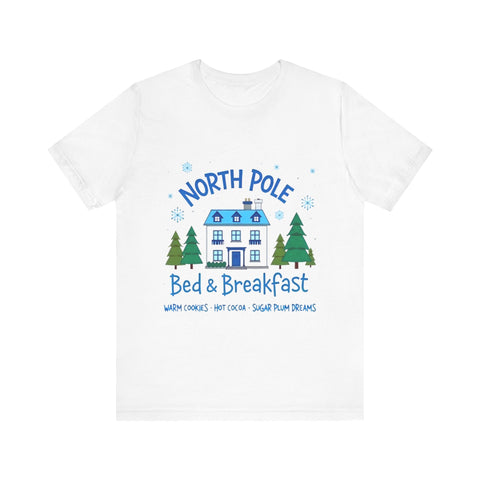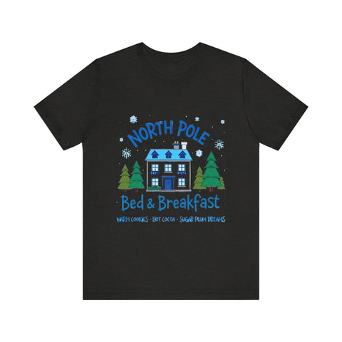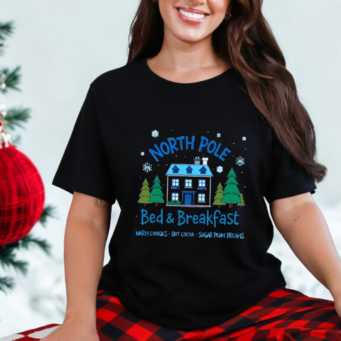 Snuggle into the holiday spirit with this adorably cozy Christmas tee! Featuring a whimsical graphic of a charming North Pole Bed & Breakfast, complete with comfy calm and snowy charm, and the sweet phrase "North Pole Bed & Breakfast", complete with warm cookies and sugar plum dreams, this shirt is your ticket to festive cuteness. Perfect for sipping hot cocoa by the fire, unwrapping gifts, or charming your way through holiday brunches. Soft, airy, and as inviting as a warm elf-made quilt, this tee brings all the merry vibes! It’s like booking a stay at the coziest spot in the Arctic Circle - without the frostbite! Wear it, love it, and let the North Pole magic sparkle. 🎄🏠❄️