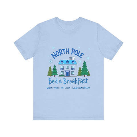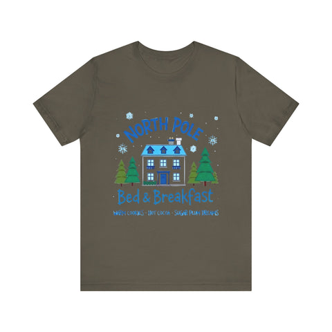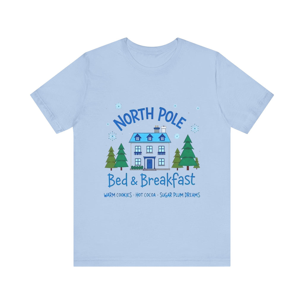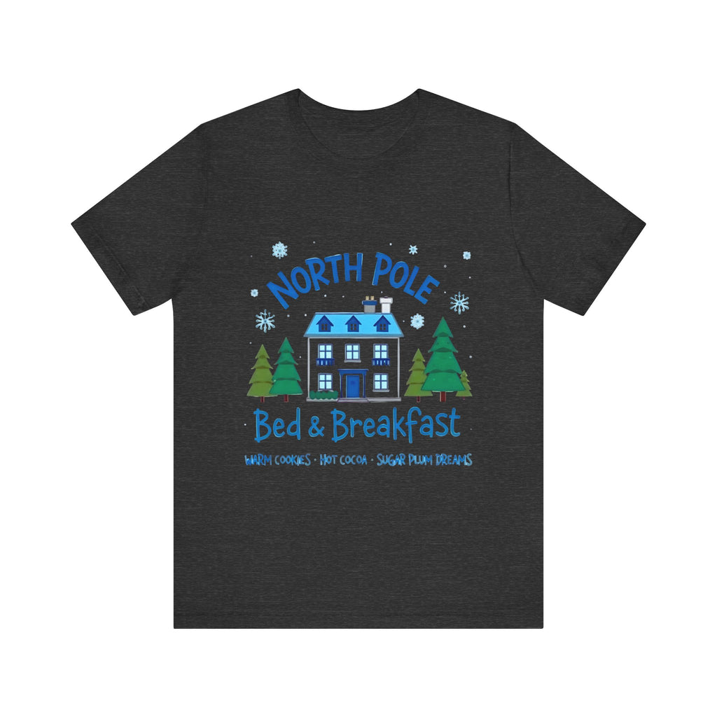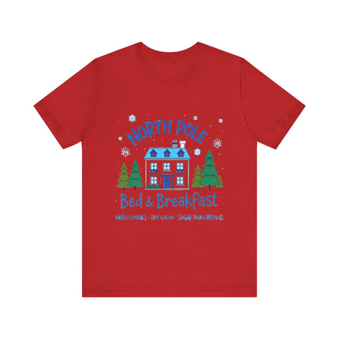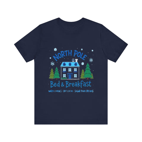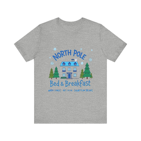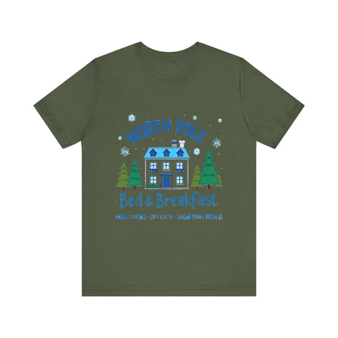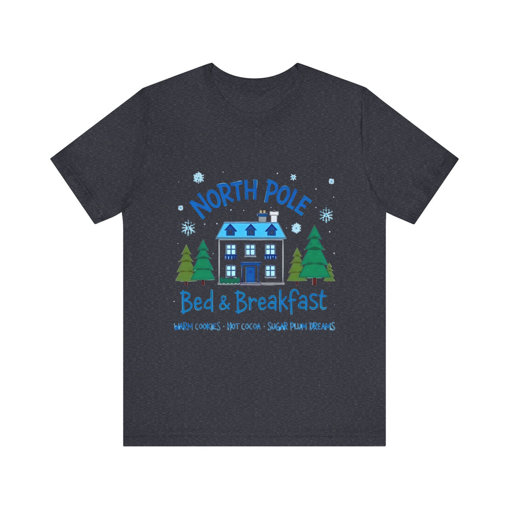 Snuggle into the holiday spirit with this adorably cozy Christmas tee! Featuring a whimsical graphic of a charming North Pole Bed & Breakfast, complete with comfy calm and snowy charm, and the sweet phrase "North Pole Bed & Breakfast", complete with warm cookies and sugar plum dreams, this shirt is your ticket to festive cuteness. Perfect for sipping hot cocoa by the fire, unwrapping gifts, or charming your way through holiday brunches. Soft, airy, and as inviting as a warm elf-made quilt, this tee brings all the merry vibes! It’s like booking a stay at the coziest spot in the Arctic Circle - without the frostbite! Wear it, love it, and let the North Pole magic sparkle. 🎄🏠❄️