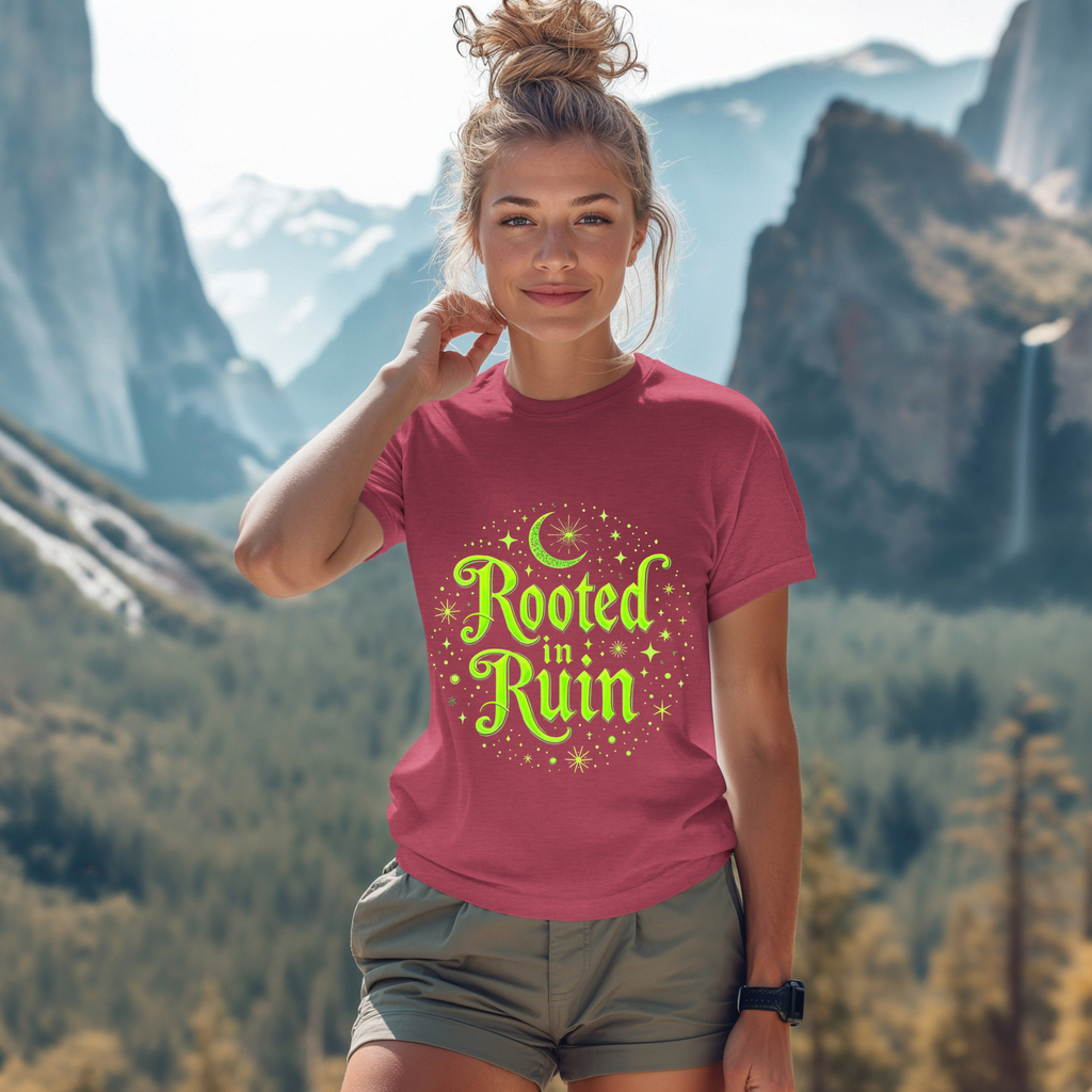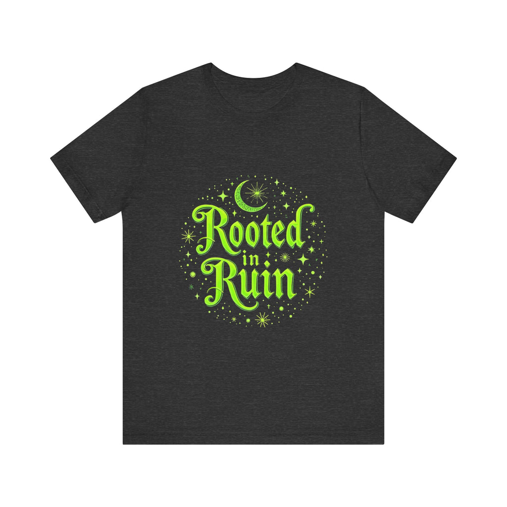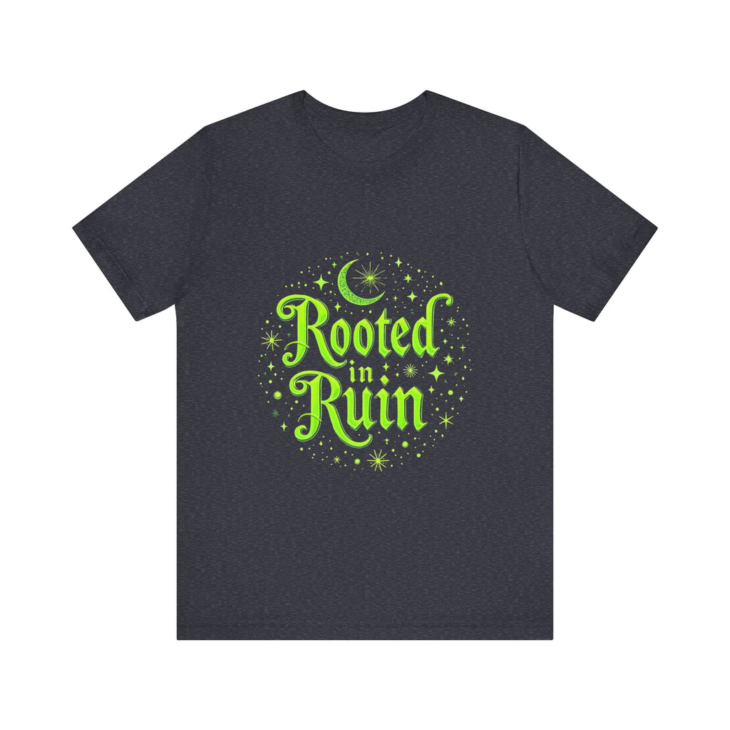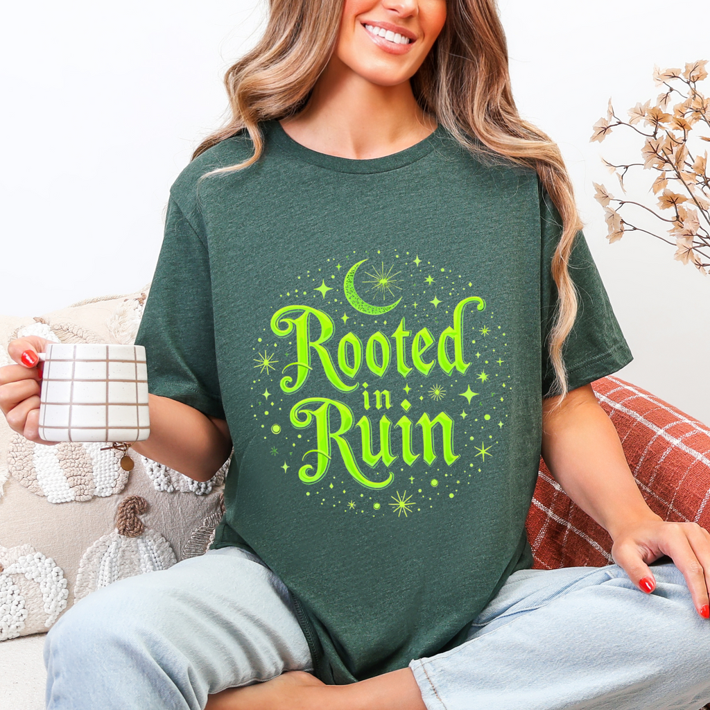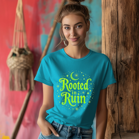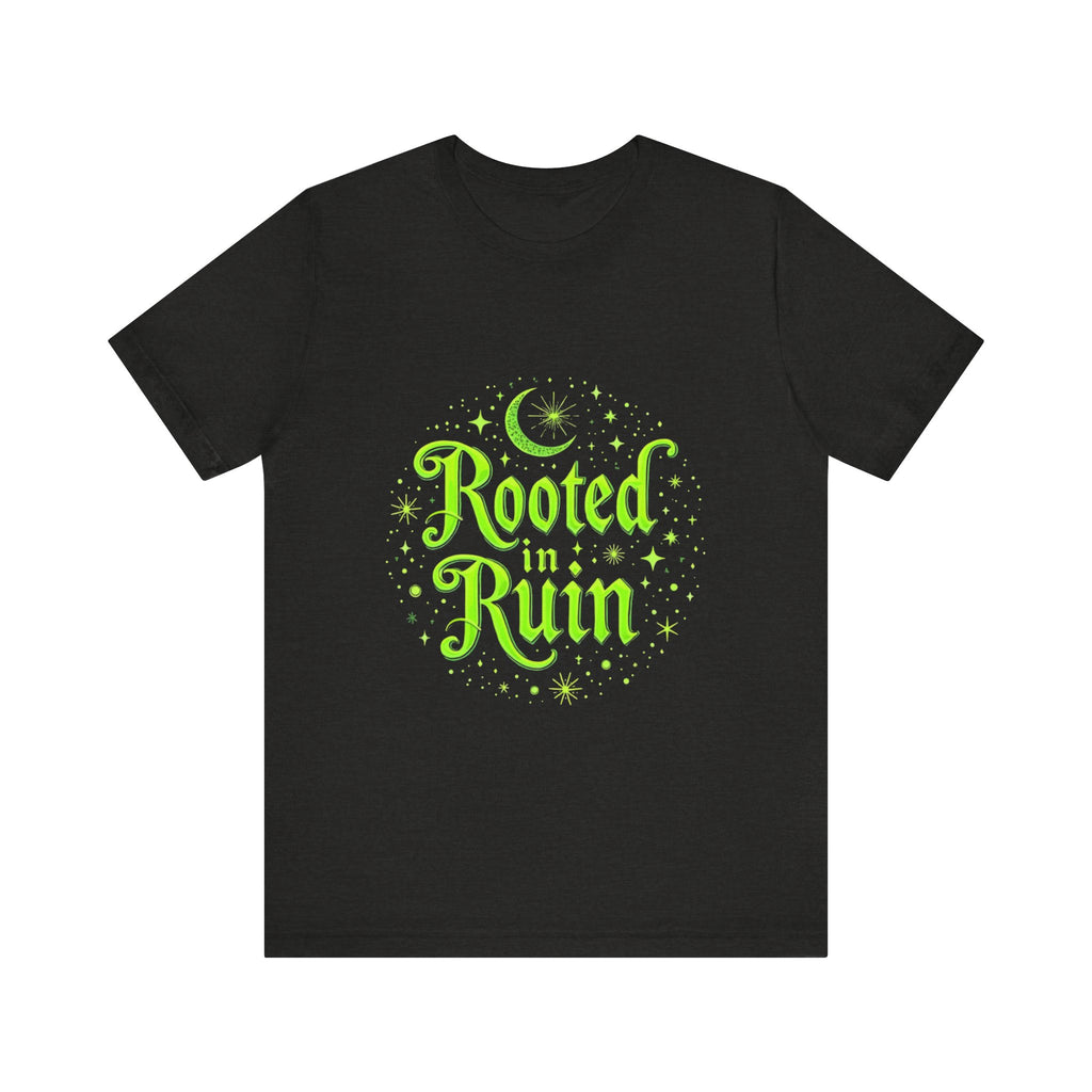 Embrace the deliciously dark with our "Rooted in Ruin" t-shirt, where goth vibes bloom like midnight roses in a haunted garden!  The bold, brooding text "Rooted in Ruin" sprawls across a shadowy design dripping with eerie elegance - think whisper of eternal melancholy.  This isn’t just a tee; it’s a portal to your inner crypt-keeper, perfect for those who thrive in the glow of moonlight and a good existential sulk.