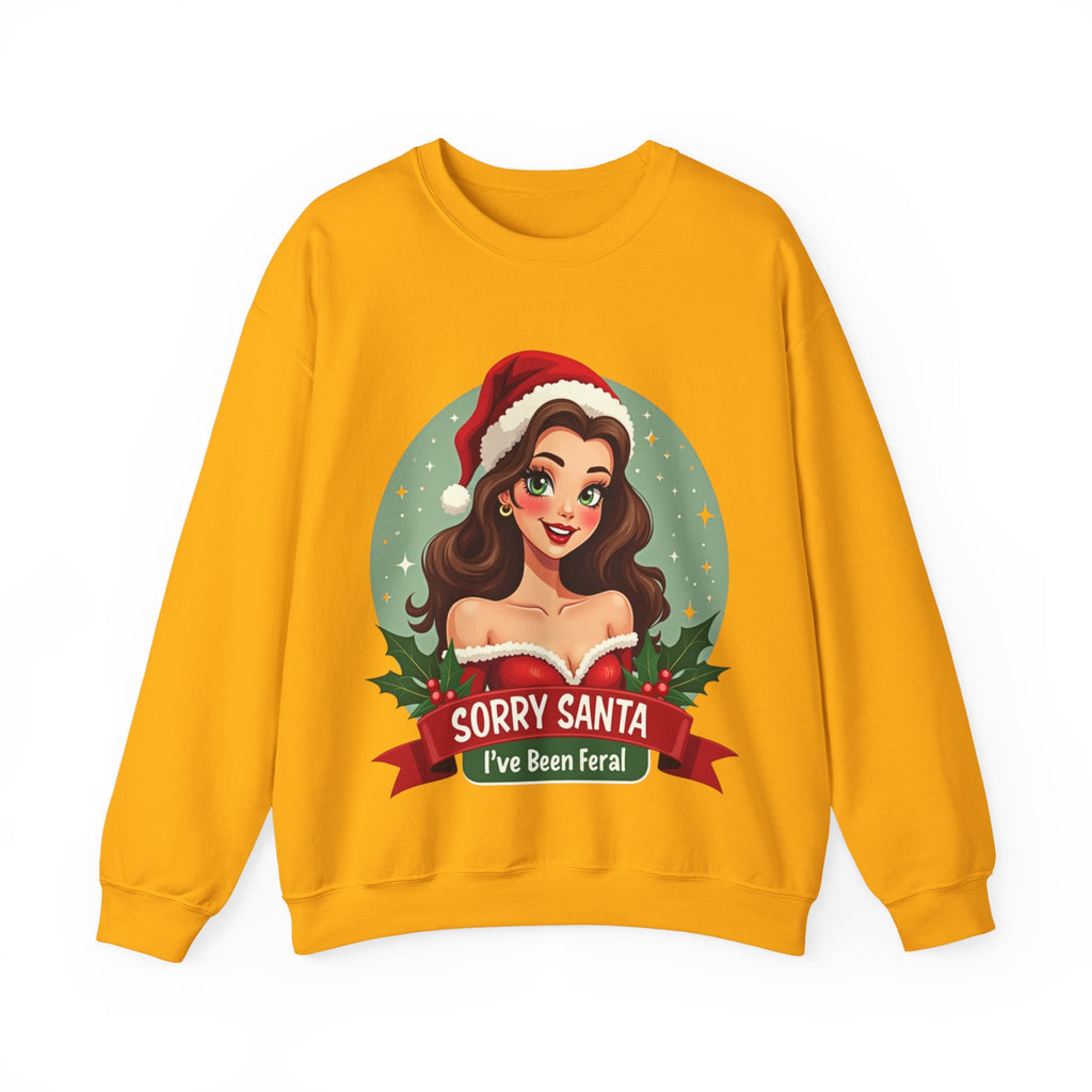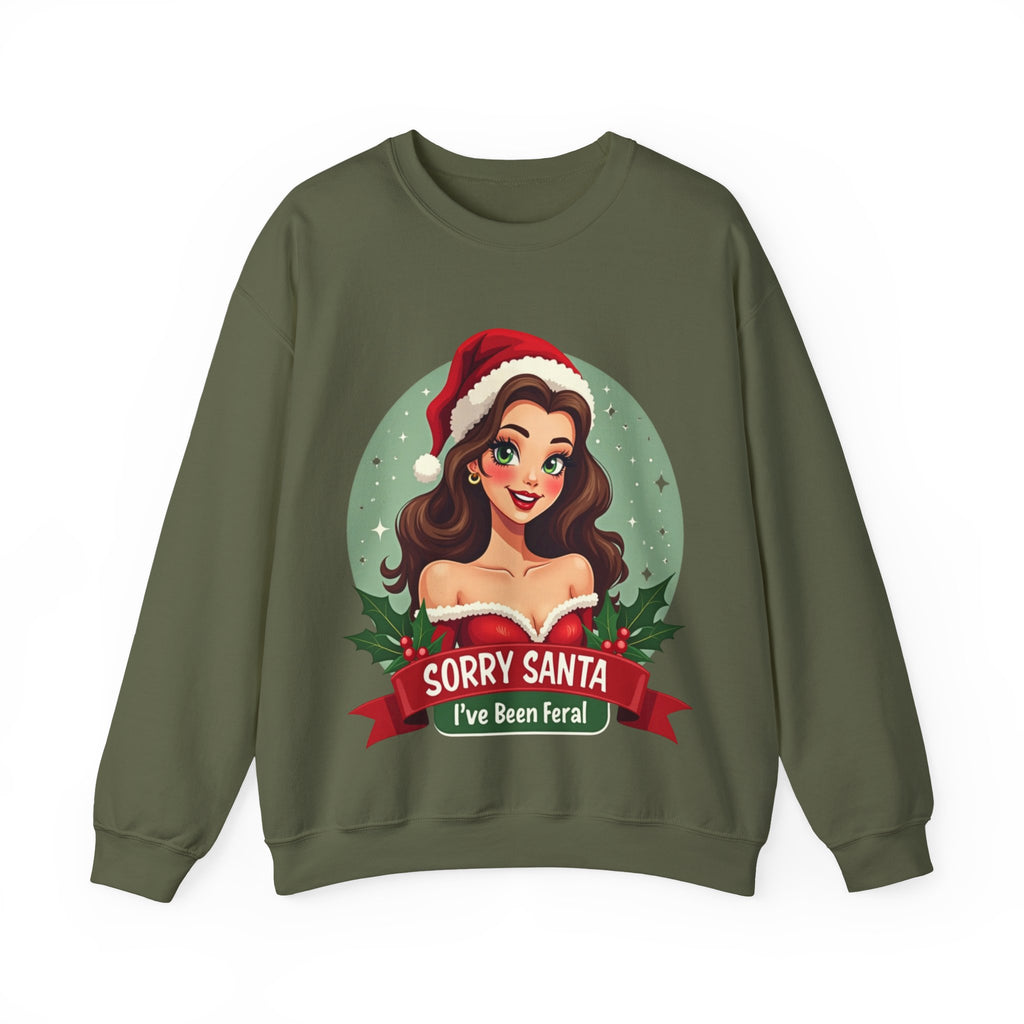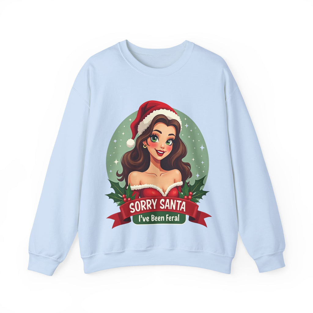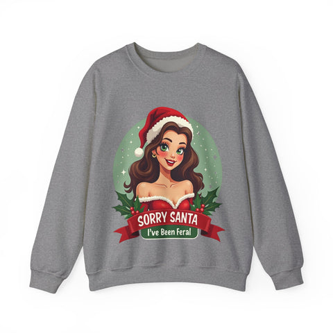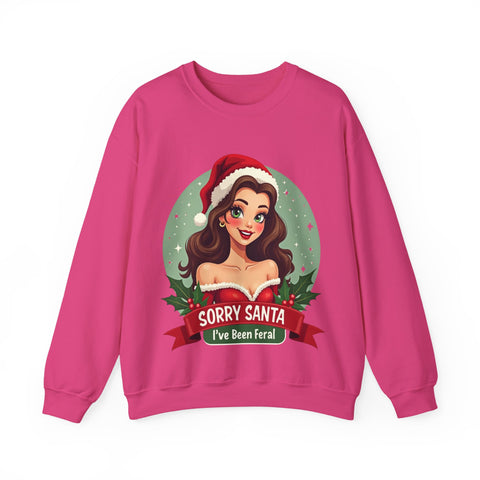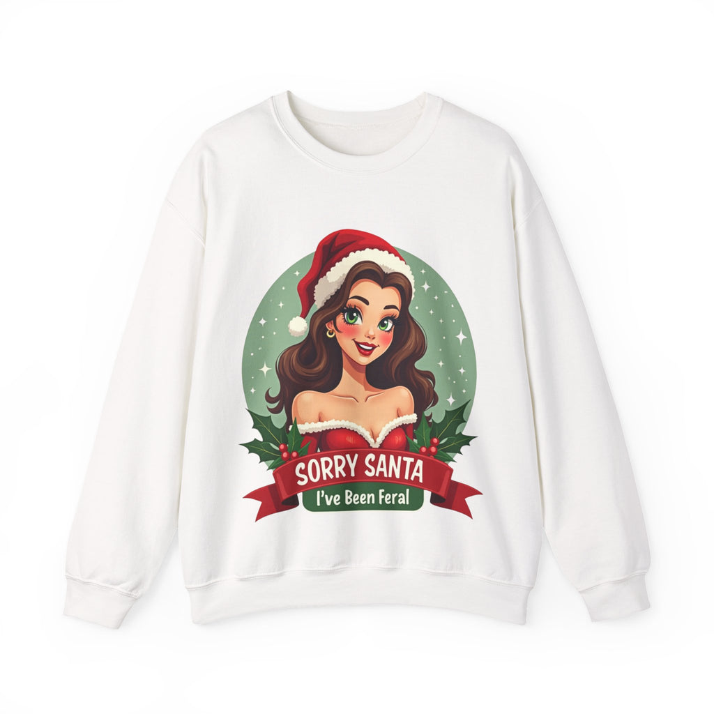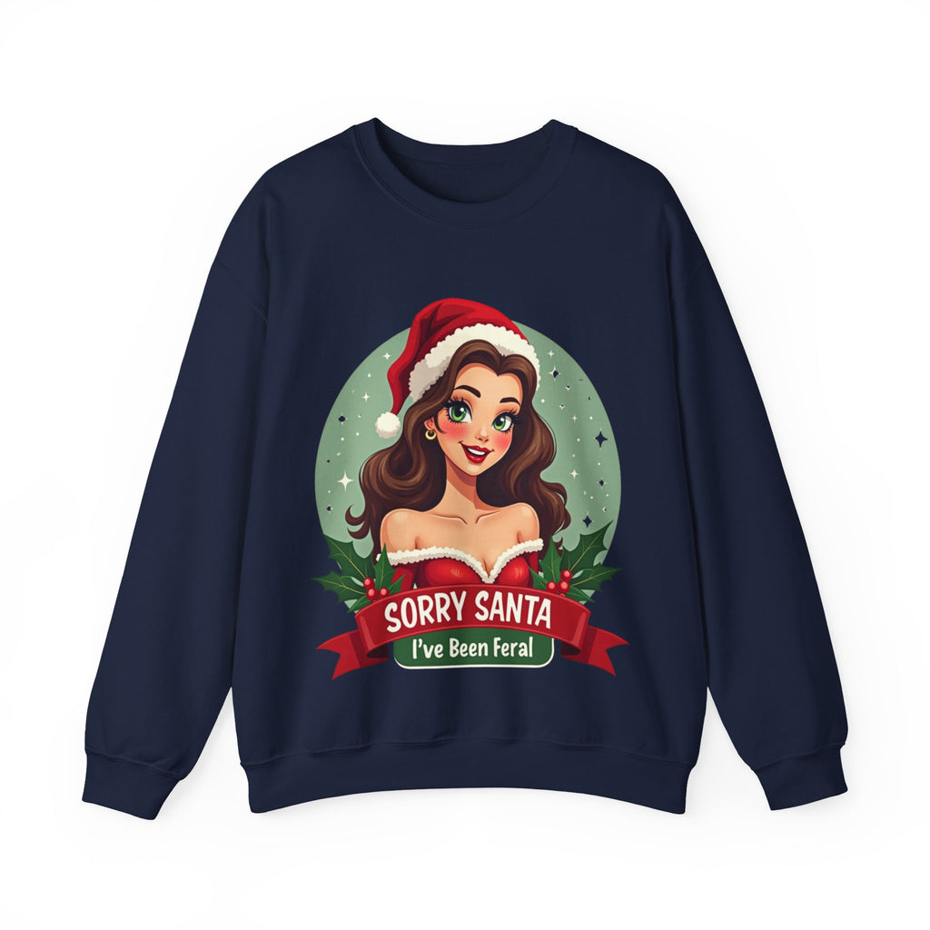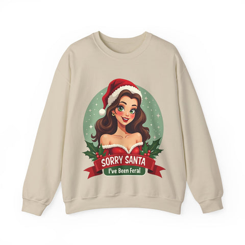 Unleash your inner holiday rebel with our "Sorry Santa I've Been Feral" Christmas Sweatshirt! This sassy crewneck stars a coquette pinup girl lounging with a flirty smirk, sporting a Santa hat tipped just so. The design pops like a champagne cork, shouting, “I’m festive, but I’m running wild!”. Crafted from a super soft cotton-poly blend that’s cozier than a stolen holiday cookie, this unisex sweatshirt (sizes S-3XL) is perfect for slaying the holiday party, dodging nosy relatives, or just serving looks while untangling Christmas lights. It’s the ultimate gift for your boldest bestie or a must-have to wear your naughty-list energy with a wink. Don’t let this pullover slip into the North Pole’s lost-and-found! Snag it now and rock the season with feral fabulousness.