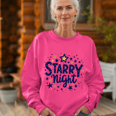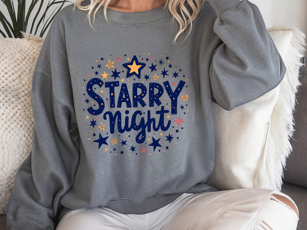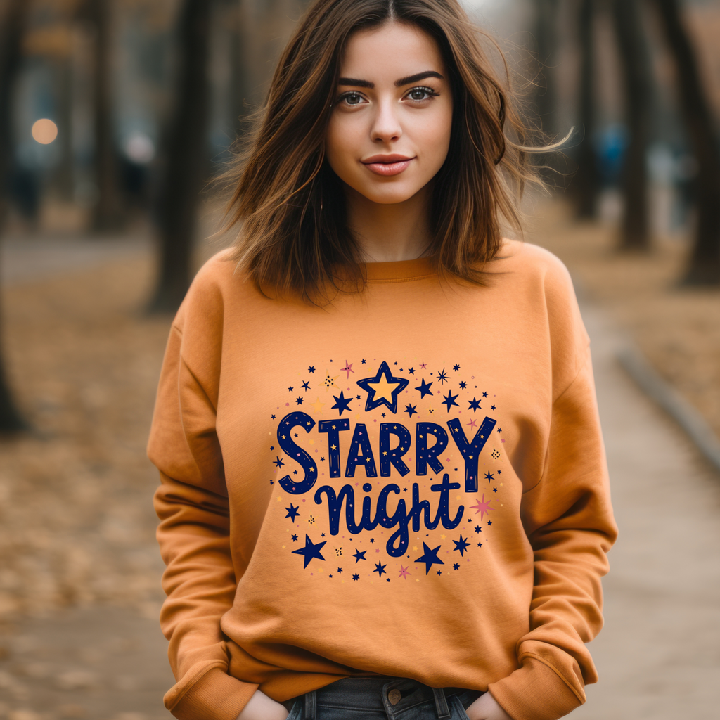 Twirl under the cosmos in our Starry Night Sweatshirt! This isn’t just a sweater - it’s a wearable piece of the night sky, bursting with dreamy vibes and celestial charm. Inspired by the swirling galaxies and celestial boho vibes, the bold "Starry Night" graphic sparkles with style, printed on a super-soft cotton-poly blend that feels like a hug from the moon. Perfect for stargazers, dreamers, and anyone who wants to add a touch of cosmic magic to their wardrobe. Whether you’re sipping coffee under the stars, dancing at a festival, or just chilling with friends, this sweatshirt brings the universe to you. Grab yours now and let your style shine brighter than a meteor shower! Don’t let this celestial gem slip through your orbit.
