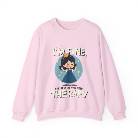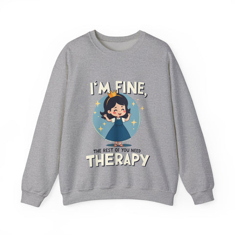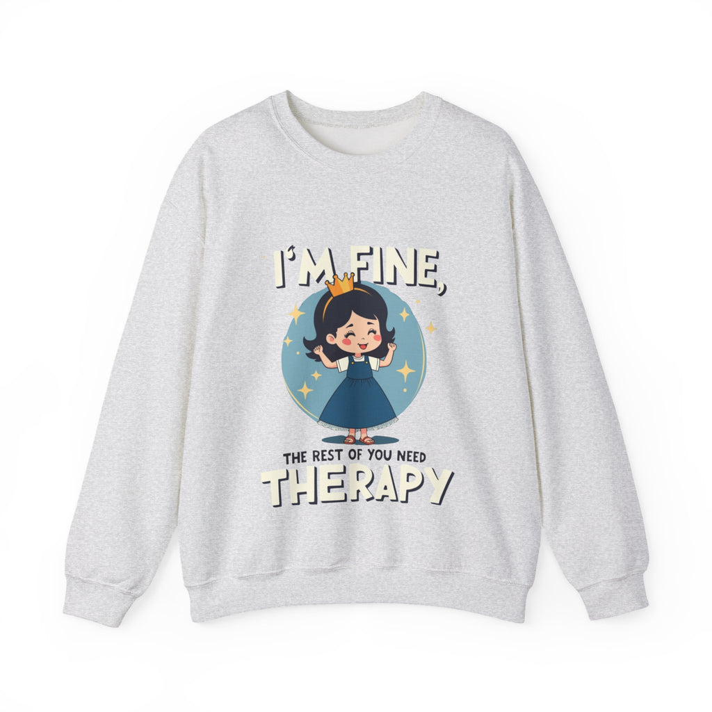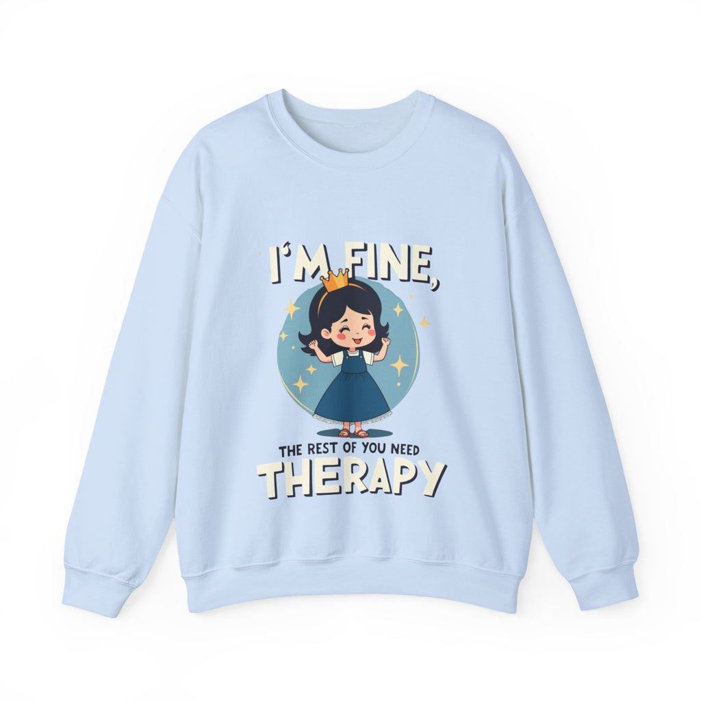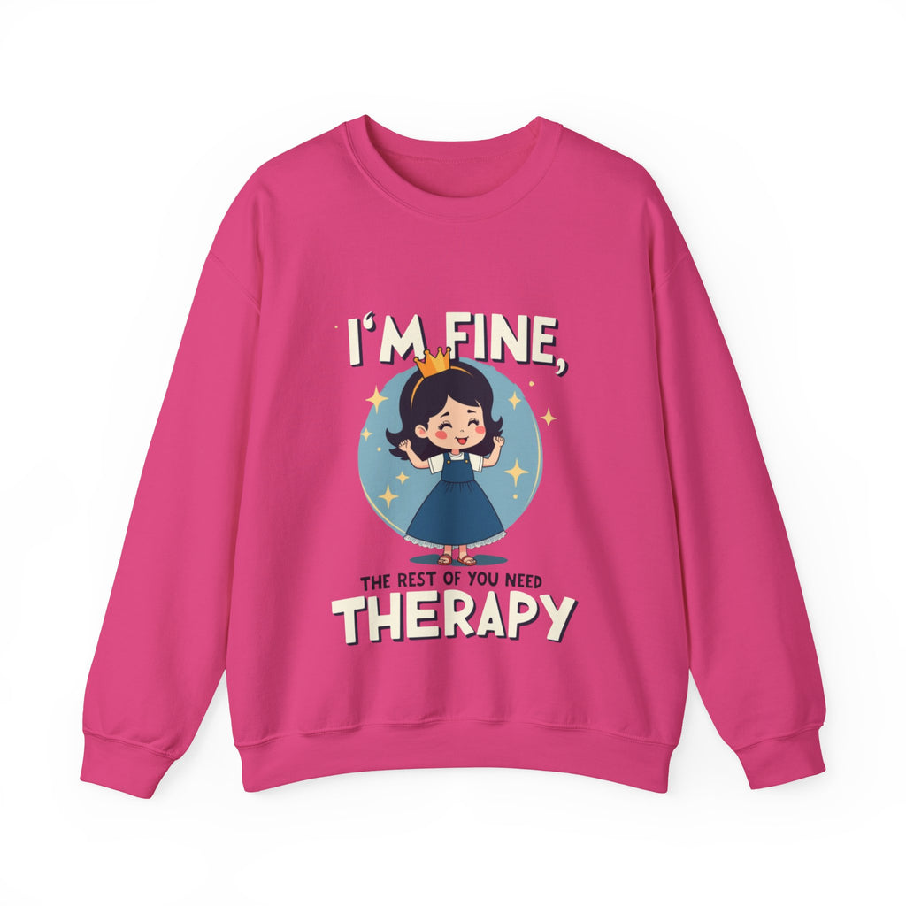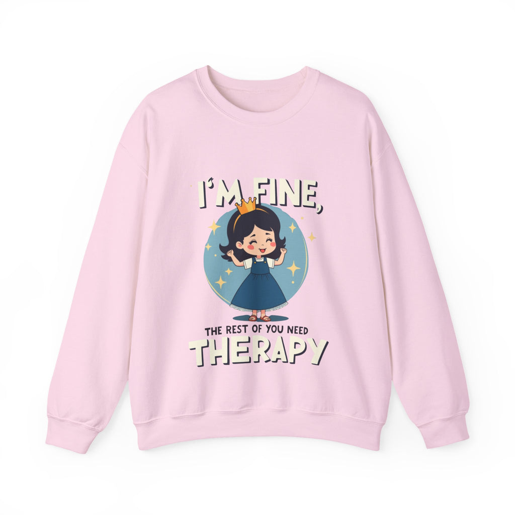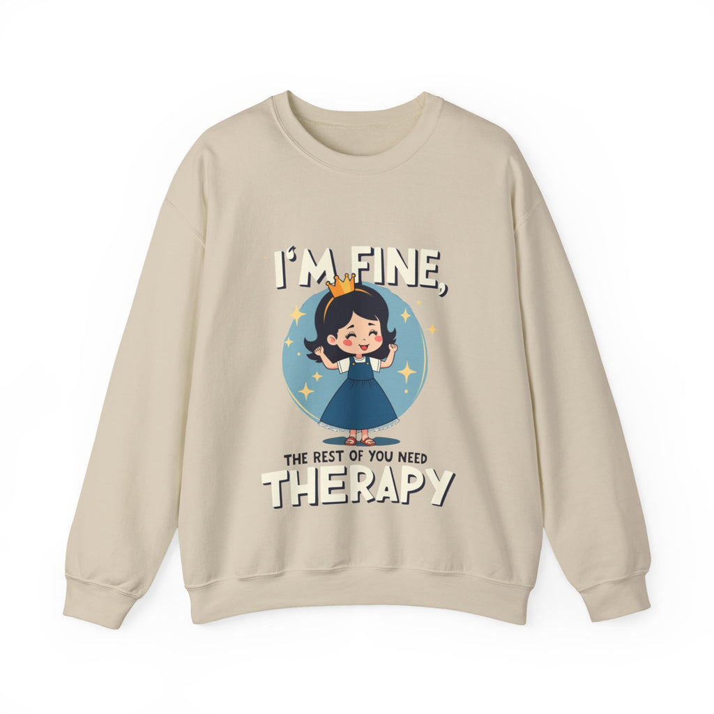 Prepare to giggle and strut with this hilariously cheeky sweatshirt featuring an adorable little girl with a sassy smirk. This sweater is the ultimate blend of cute and savage, perfect for anyone who’s got their life together (or at least pretends to) while throwing playful shade at the chaos around them. Made from an ultra-cozy cotton-poly blend, this sweatshirt is your new BFF for casual hangouts, coffee runs, or serving looks at family gatherings. The little girl’s confident vibe and snarky slogan will have everyone laughing, nodding, and secretly booking a therapy session. It’s not just a sweatshirt—it’s a mood! These sweaters are selling faster than a therapist’s calendar fills up - grab yours before they’re gone! Perfect for witty souls, sarcasm lovers, and anyone who’s totally fine (wink, wink). Wear it, slay it, and let the world know you’re the sanest one in the room. Snag this sweatshirt now and wear your confidence loud and proud.