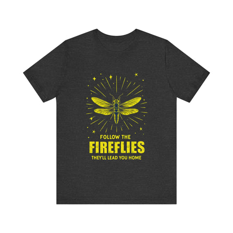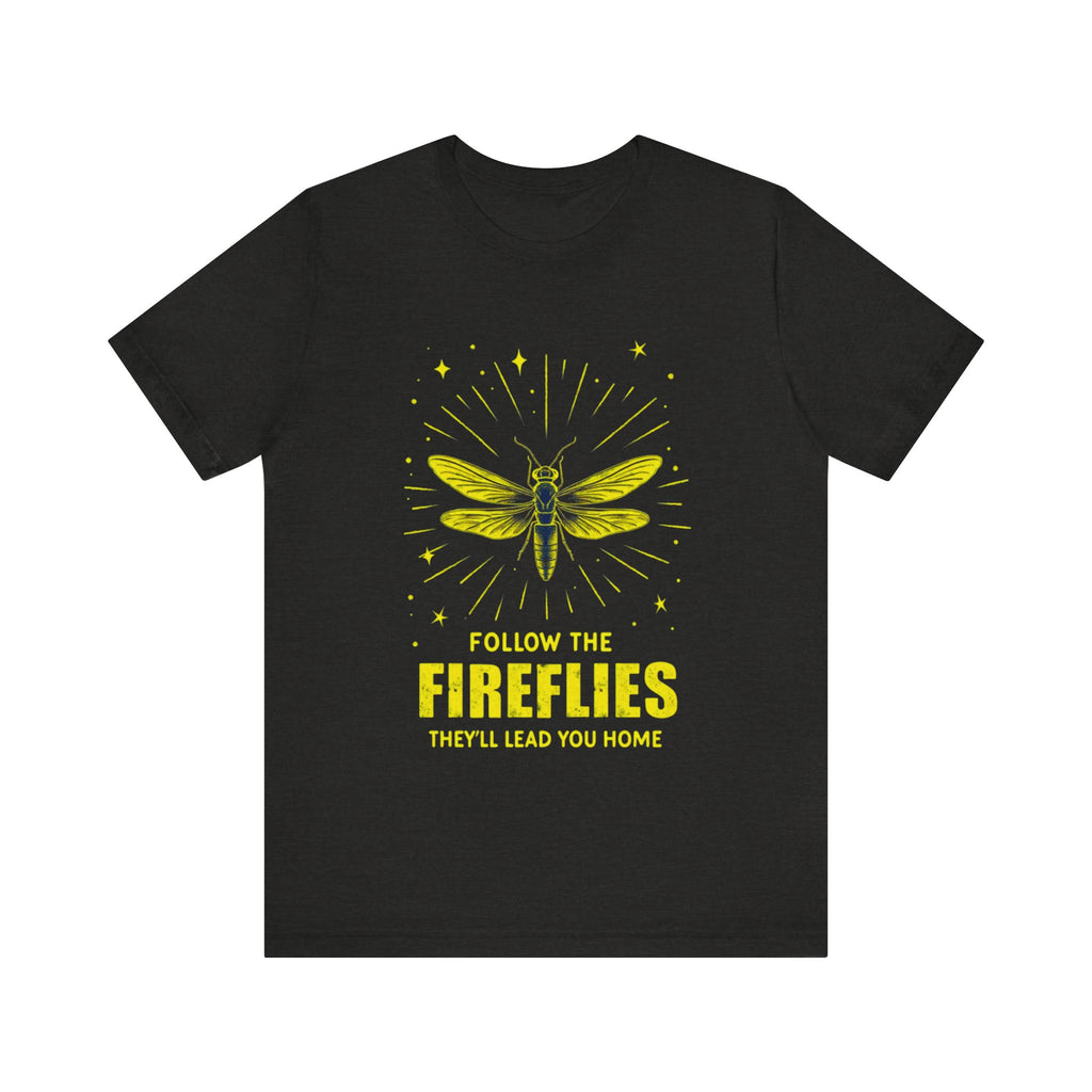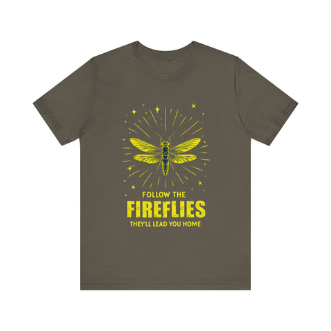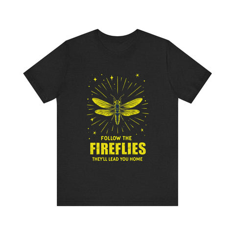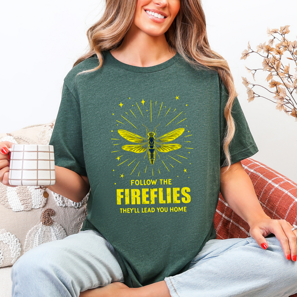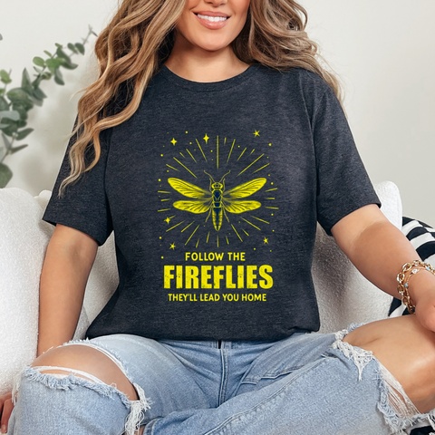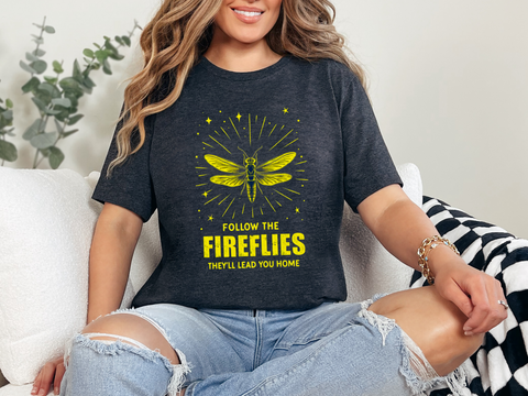 Light up your wardrobe with our Follow the Fireflies T-Shirt! This isn’t just a tee - it’s a vibe, a sassy little beacon for dreamers, wanderers, and anyone who believes magic happens when you chase the glow. Crafted from super-soft, comfy cotton, this shirt feels like a warm summer night and looks like a statement piece that’ll turn heads. Picture this: you’re rocking this tee at a festival, a bonfire, or just strutting through the grocery store (because why not?). The bold, whimsical “Follow the Fireflies” print sparkles with charm, reminding everyone to embrace life’s little adventures. Whether you’re a free spirit or just need a nudge to find your way home, this shirt’s got your back - and your front! Grab yours now and let the fireflies lead you to your next adventure. Trust us, this tee is your new go-to for adding a sprinkle of magic to any day✨. Snag it before it flutters away!